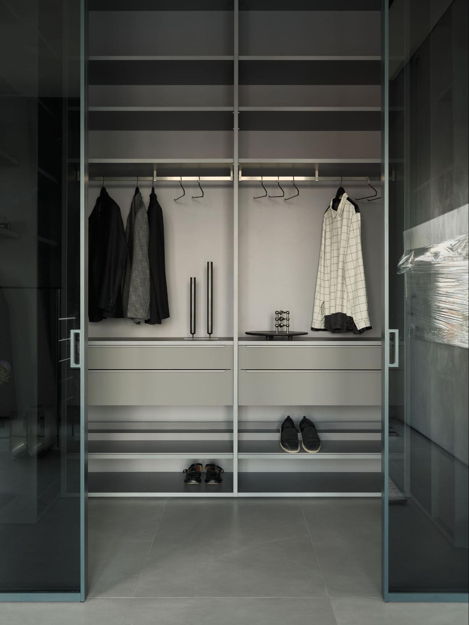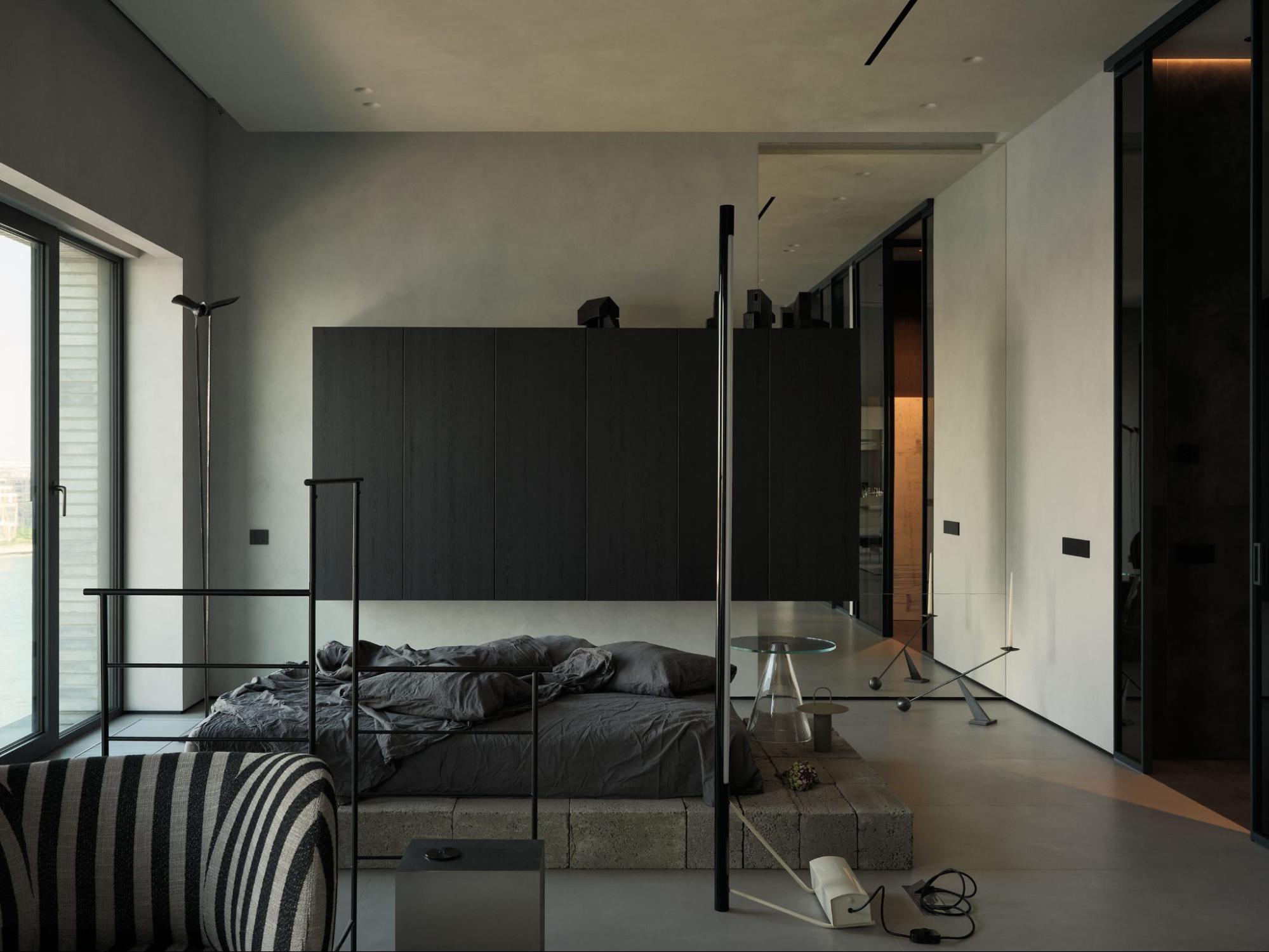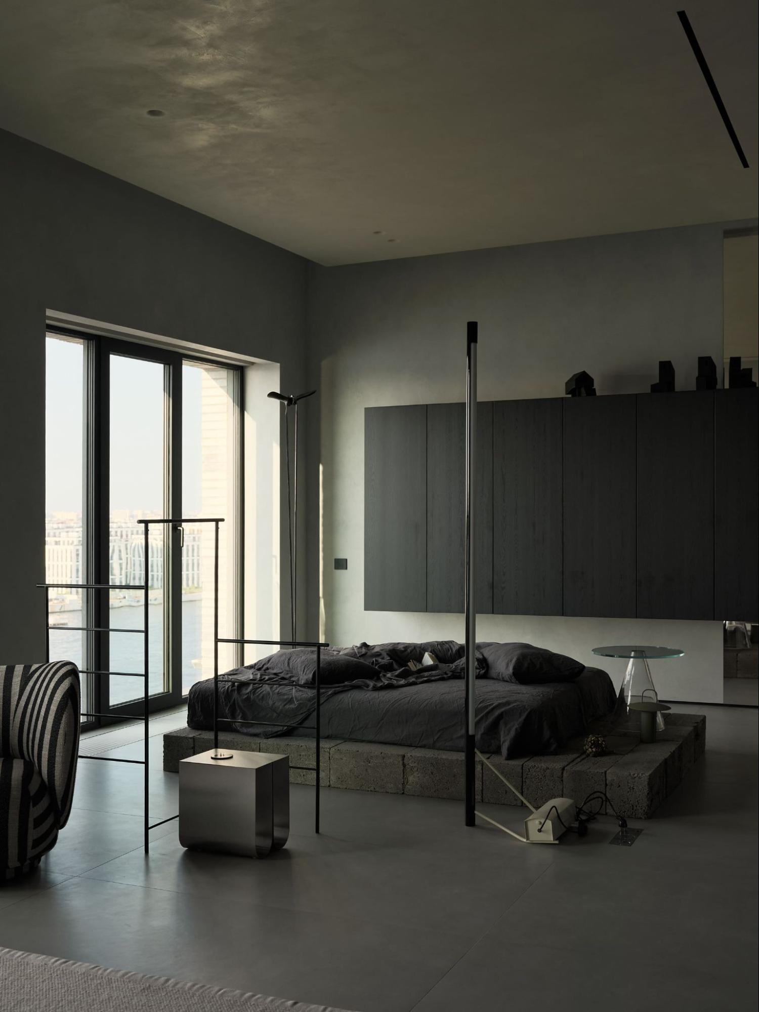Граница между спальней и лаунж-зоной намечена, но остаётся визуально открытой. Здесь — торшер Astep, вешалка Ferm Living и хромированный столик Kristina Dam Studio, создающие ощущение воздуха и свободы.
