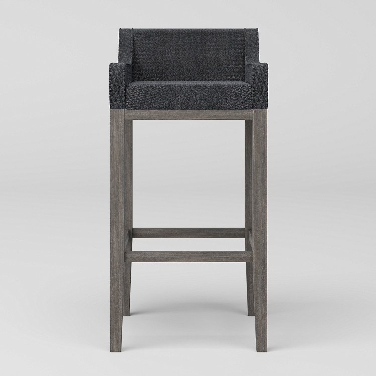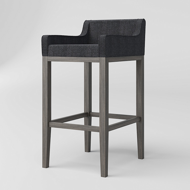 Барный стул Modénature Frank Bar Stool. Его силуэт строится на простых прямоугольных объемах. Мягкий блок образует П-образную форму, объединяя сиденье, спинку и подлокотники. Четыре деревянные ножки с двумя рядами перекладин формируют устойчивое основание. Модель входит в Collection Historique.