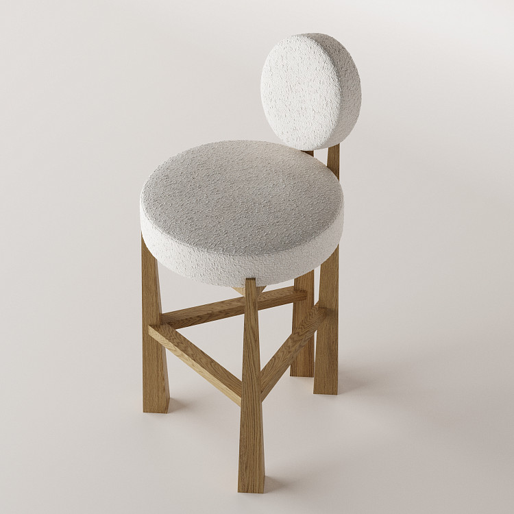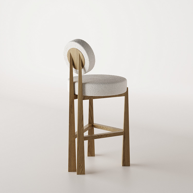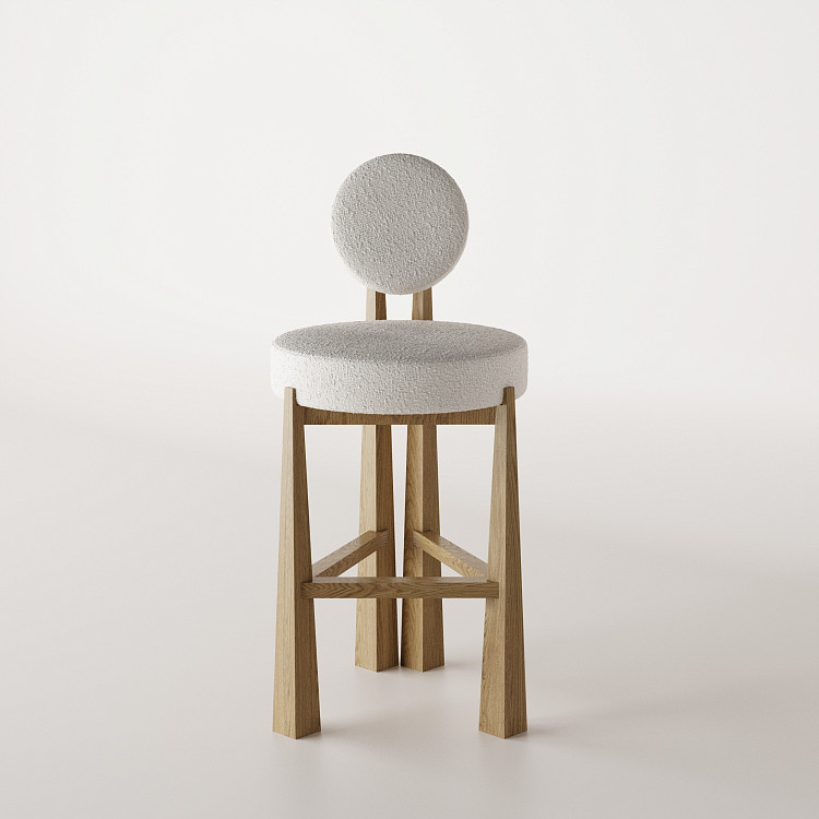 Барный стул Modénature Masai Lounge Bar Stool от Olga Silanteva. В дизайне прослеживаются мотивы русской мебели начала XX века. Четыре вертикальные ножки из светлого дерева расположены по трапеции — передние расставлены шире задних. Ножки соединены тремя перекладинами, повторяющими эту форму. Круглое сиденье дополнено отдельной круглой спинкой на двух стойках.