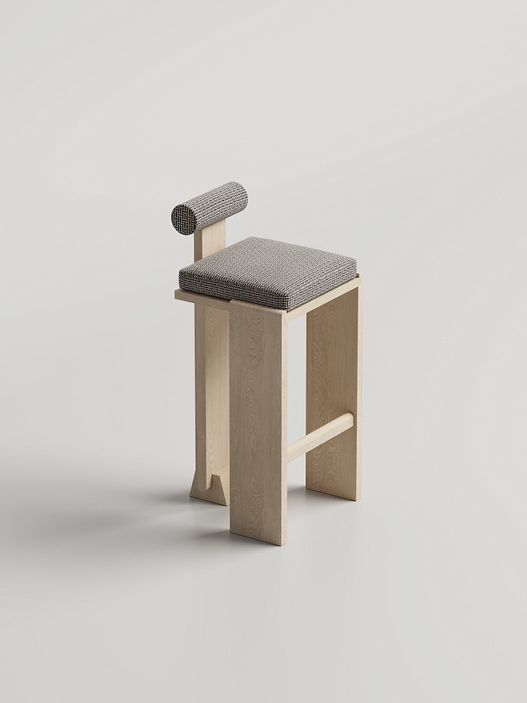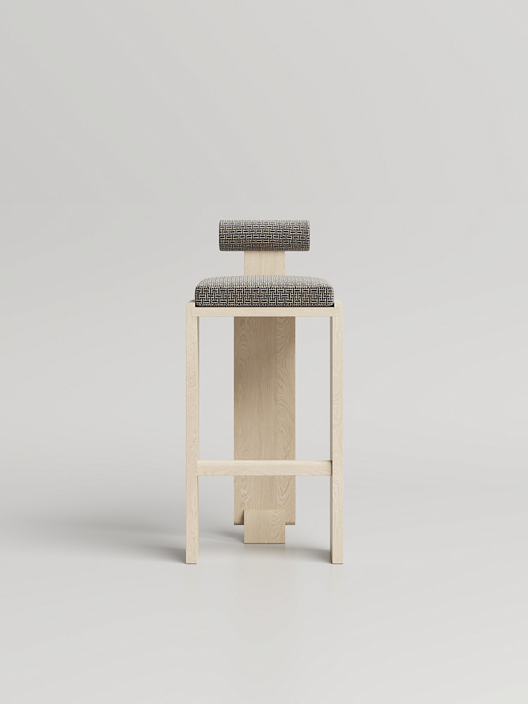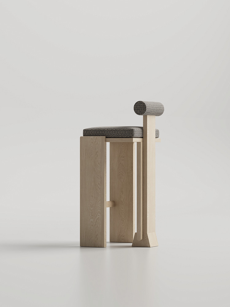 Барный стул Modénature Scroll Bar Stool от Viktoriya Kliman. Модель продолжает идеи коллекции Scroll, сочетая округлые и угловатые формы. Прямоугольное сиденье дополнено цилиндрическим валиком спинки на тонких стойках. Основание из светлого дерева состоит из широких задних опор и узких передних ножек с подставкой.