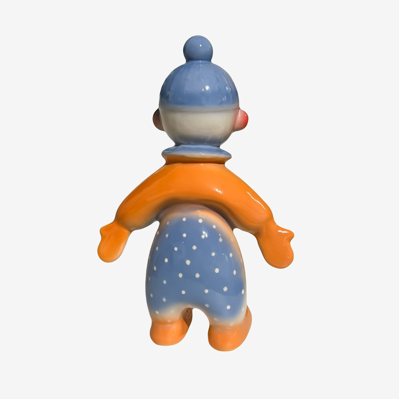 Скульптура Лыжник сине-оранжевый — арт-объект, вызывающий ностальгичные чувства. Выполненное из полуфарфора изделие притягивает взгляд своей колористической смелостью: глубокий небесно-голубой цвет шапочки и комбинезона в кокетливый белый горошек идеально дополняется сочным, почти апельсиновым оттенком куртки. Глянцевая глазурь подчёркивает гладкость полуфарфора, создавая на поверхности скульптуры живые блики.