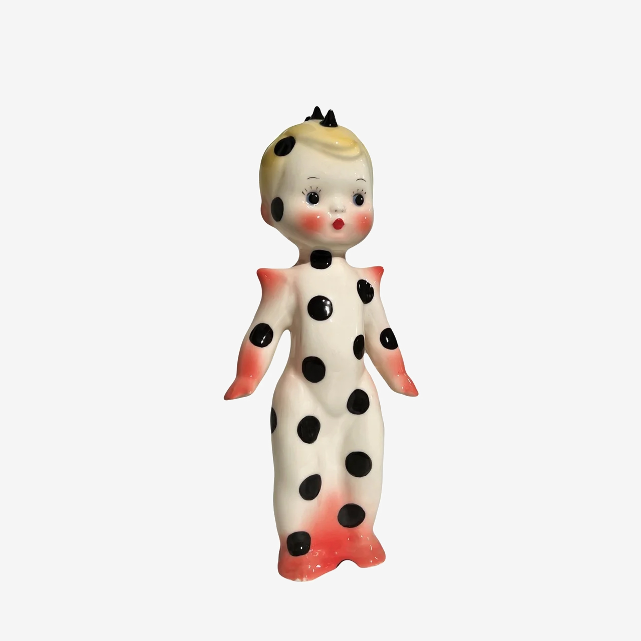 Скульптура Семён Чёрный Горох словно сошла с винтажной открытки. Силуэт статуэтки соединяет эстетику доброй советской сказки и современного сюрреализма. Украшения в виде контрастных чёрных точек и острых шипов добавляют декоративной скульптуре объёма и индивидуальности.