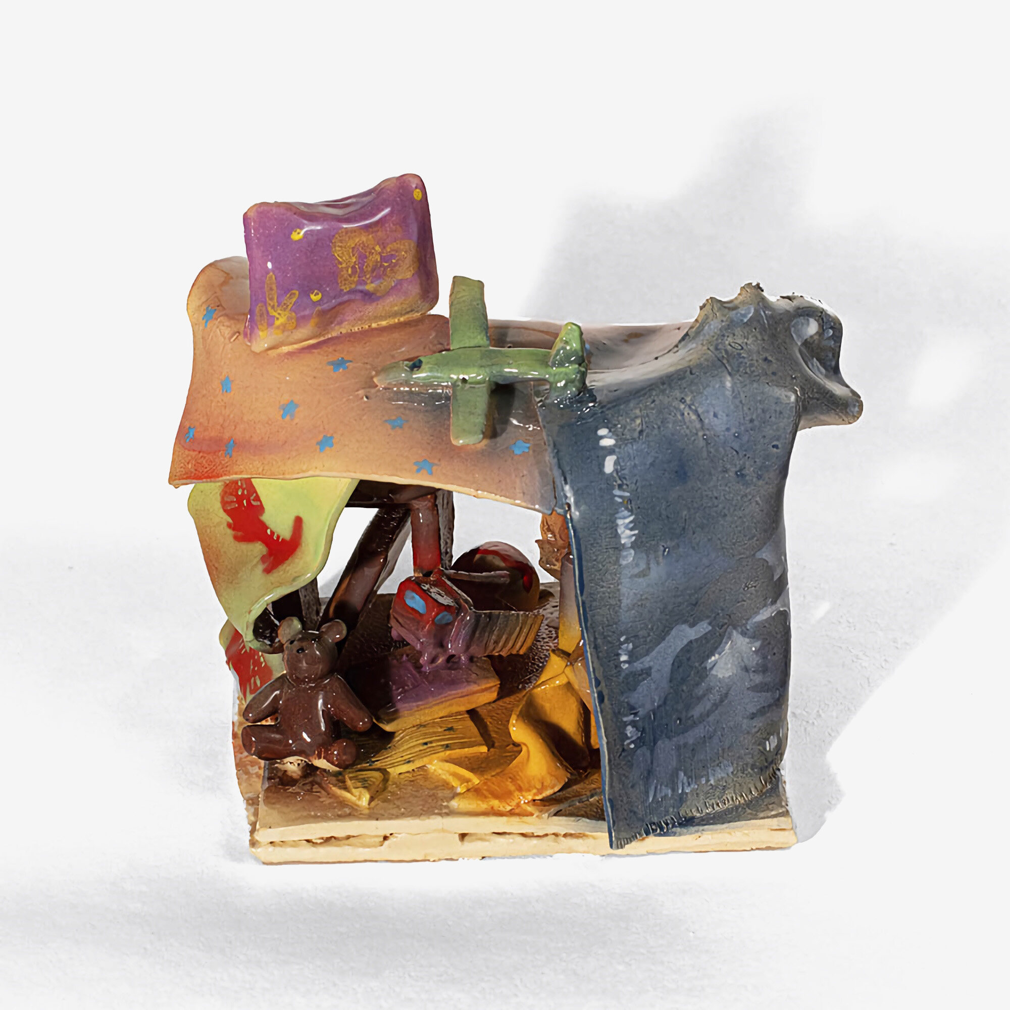 Скульптура Укрытие — визуальное исследование темы детства. Статуэтка, входящая в авторскую серию Веры Латышевой, отражает потребность каждого ребёнка в собственном безопасном месте. Керамический тайный домик дополняется филигранно выполненными компактными деталями в виде тёплых одеял и красочных игрушек.