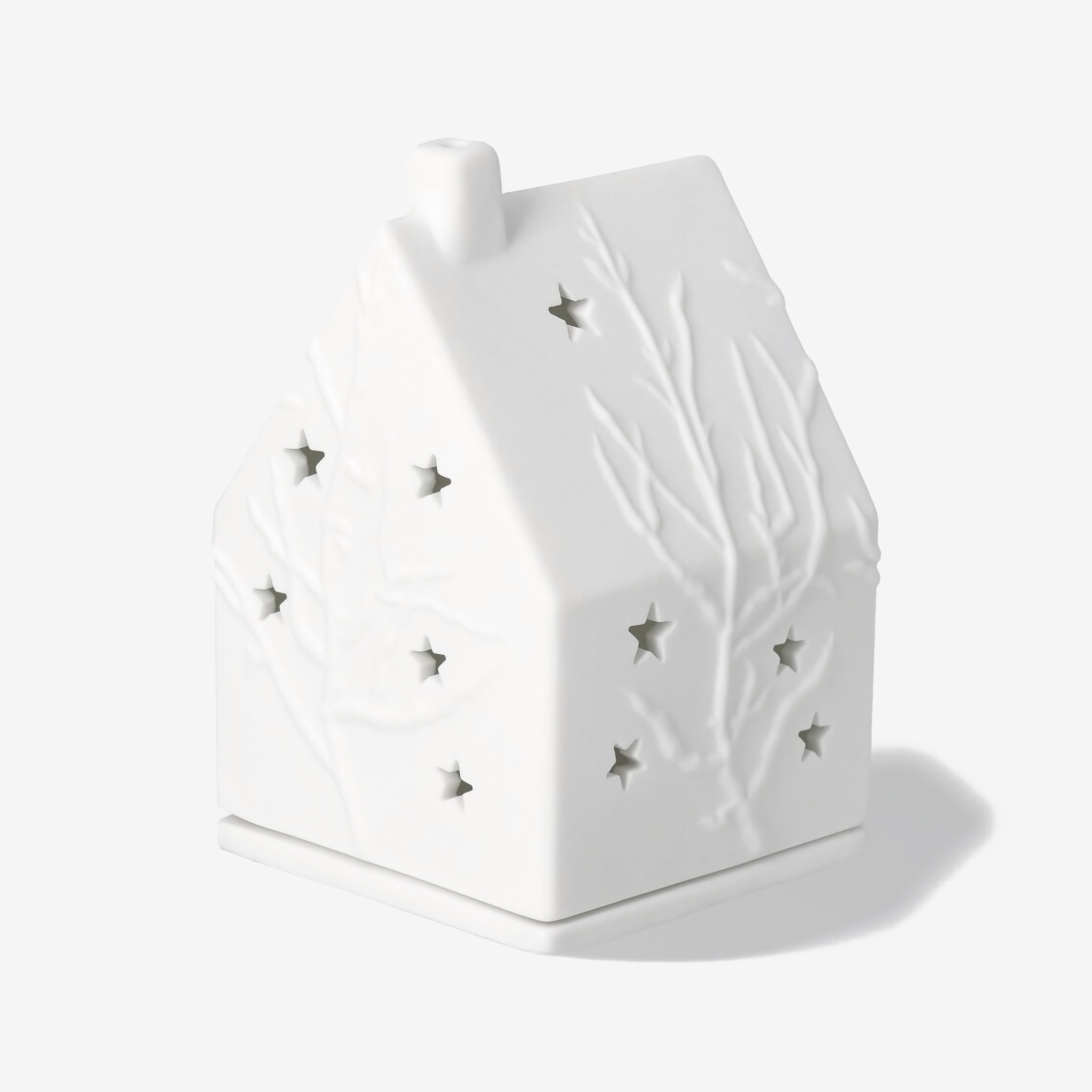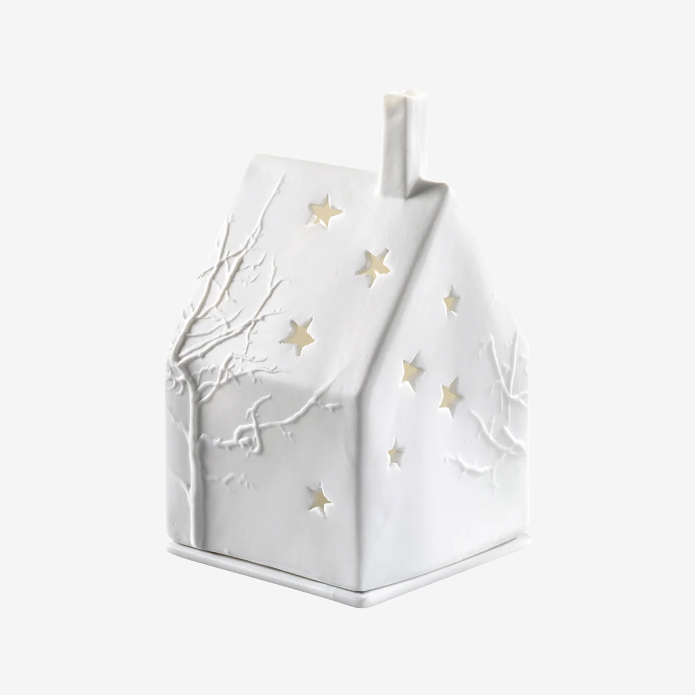 Домик-подсвечник Räder Tree — миниатюрная модель с рождественским дизайном. Вместо классических квадратных окошек фасады домика украшены праздничными звёздами. Стены подсвечника будто бы оплетены объёмными деревьями из белого фарфора.