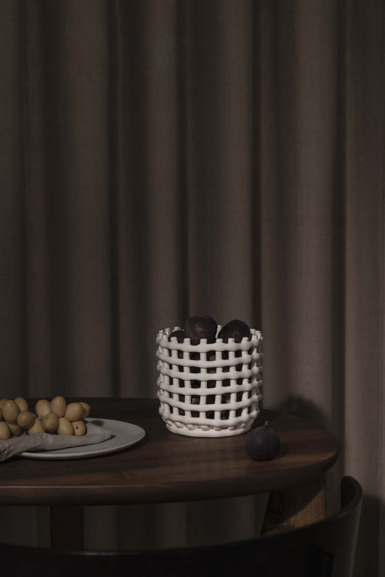 Корзина для хранения Ferm Living Ceramic Basket — Small выглядит как традиционный плетёный контейнер, но изготавливается из долговечных материалов. Каждая корзина является индивидуальной, поскольку вылепливается вручную. Декоративный предмет можно использовать в качестве цветочного горшка либо для хранения вещей.