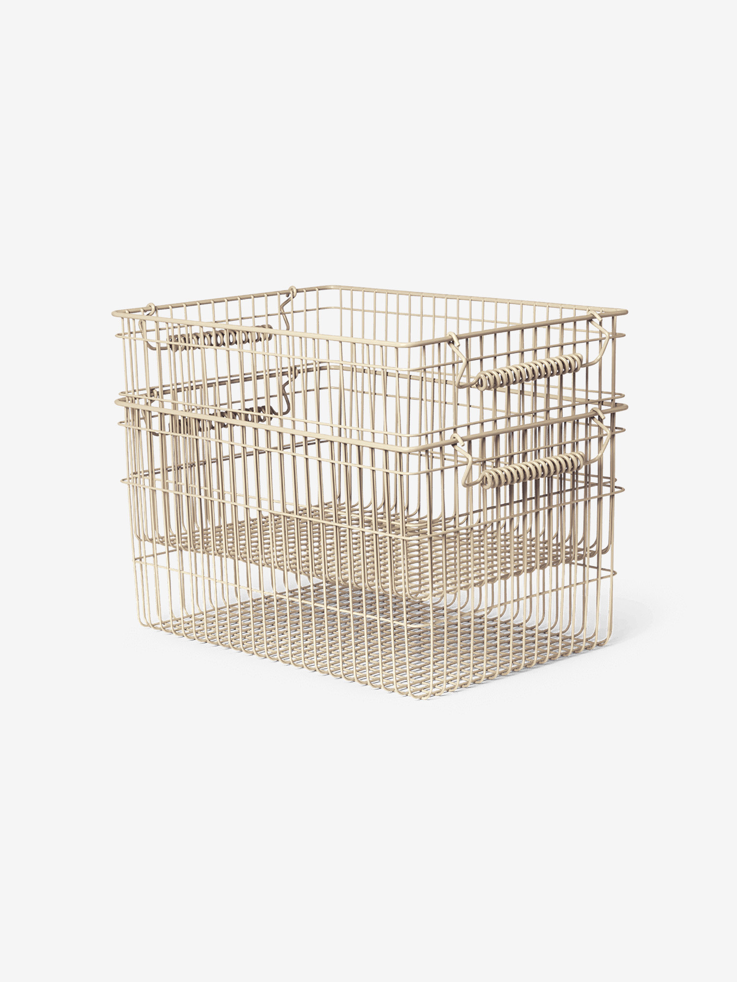 Название набора из 2-х корзин для хранения Ferm Living Cala Stackable Baskets — Set of 2 было вдохновлено испанским словом «Cala», означающим «ручей». Контейнеры станут прекрасным функциональным решением для организации пространства в разных помещениях (офис, ванная или детская комната). Металлические ручки корзин со спиральными деталями являются интересными декоративными элементами.