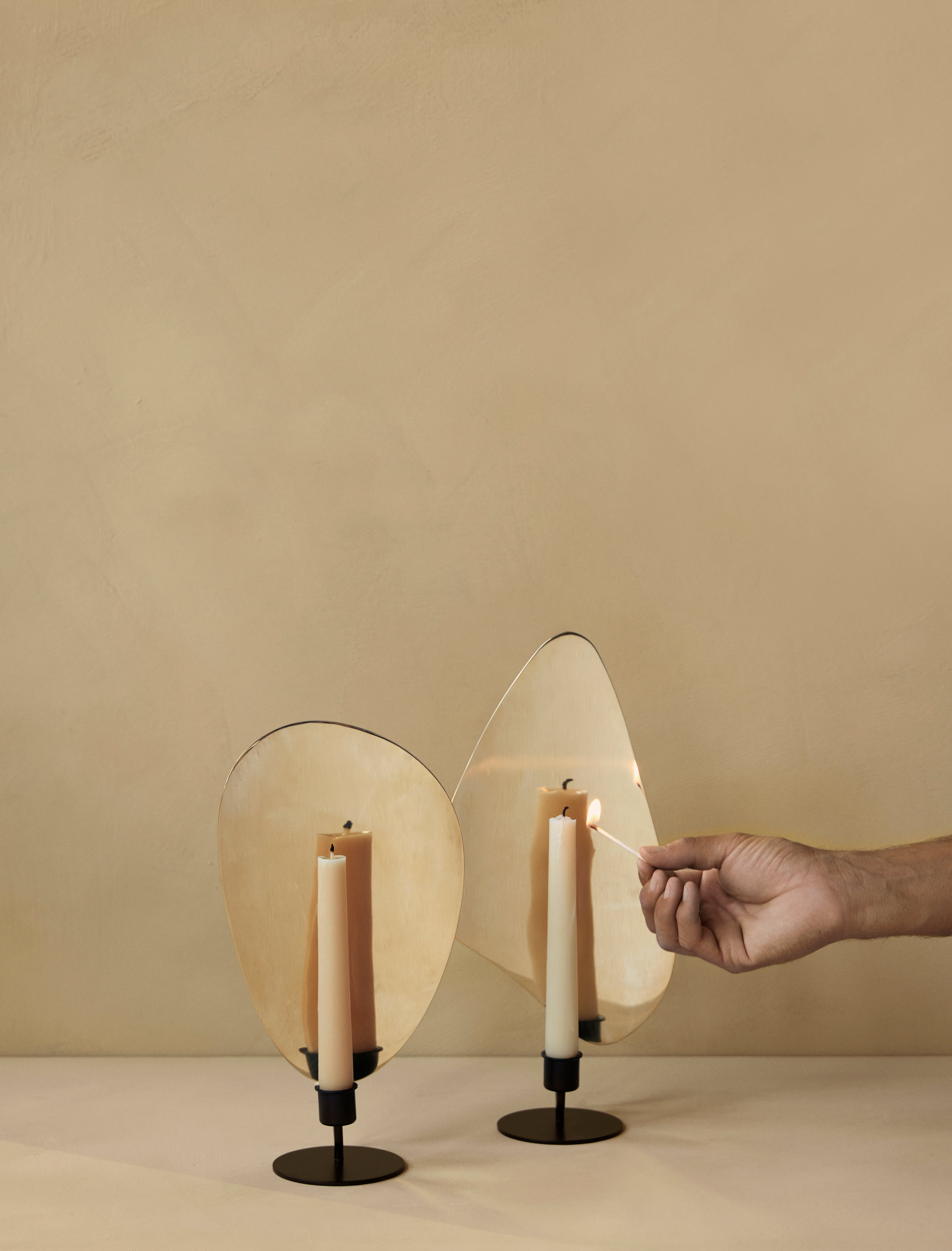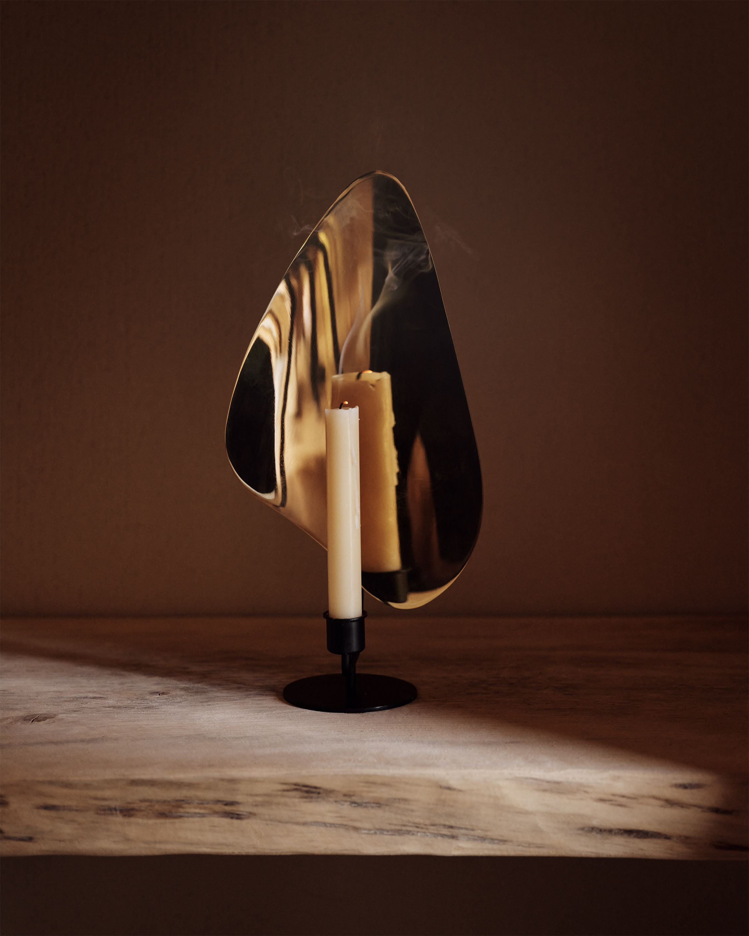 Дизайн подсвечника Audo Copenhagen (ex. Menu) Flambeau candle holder вдохновлён французскими модернистскими светильниками. Форма изделия напоминает мерцающий огонёк свечи. Металлическая задняя панель модели отражает падающий на неё свет, создавая интригующие тени.