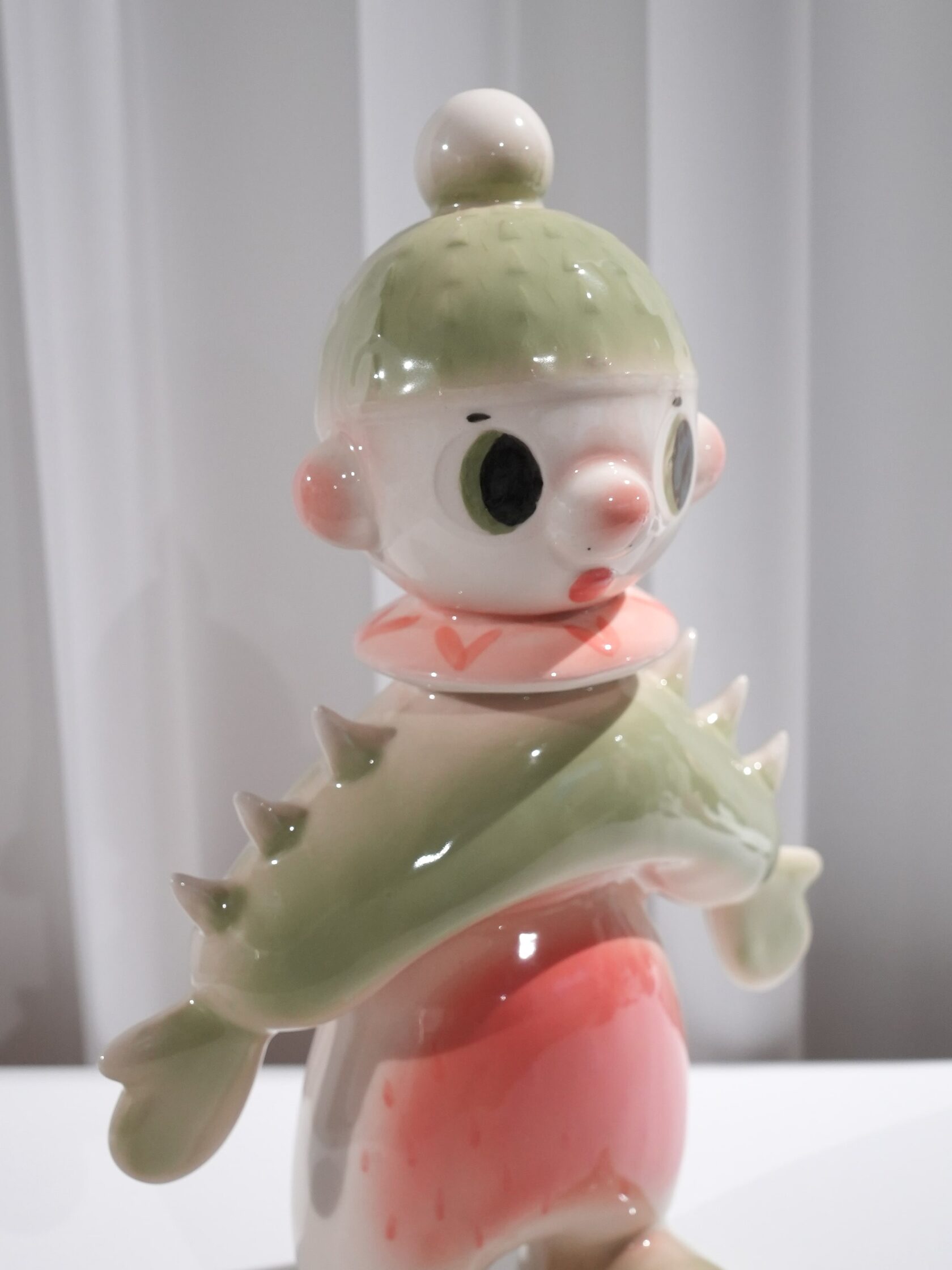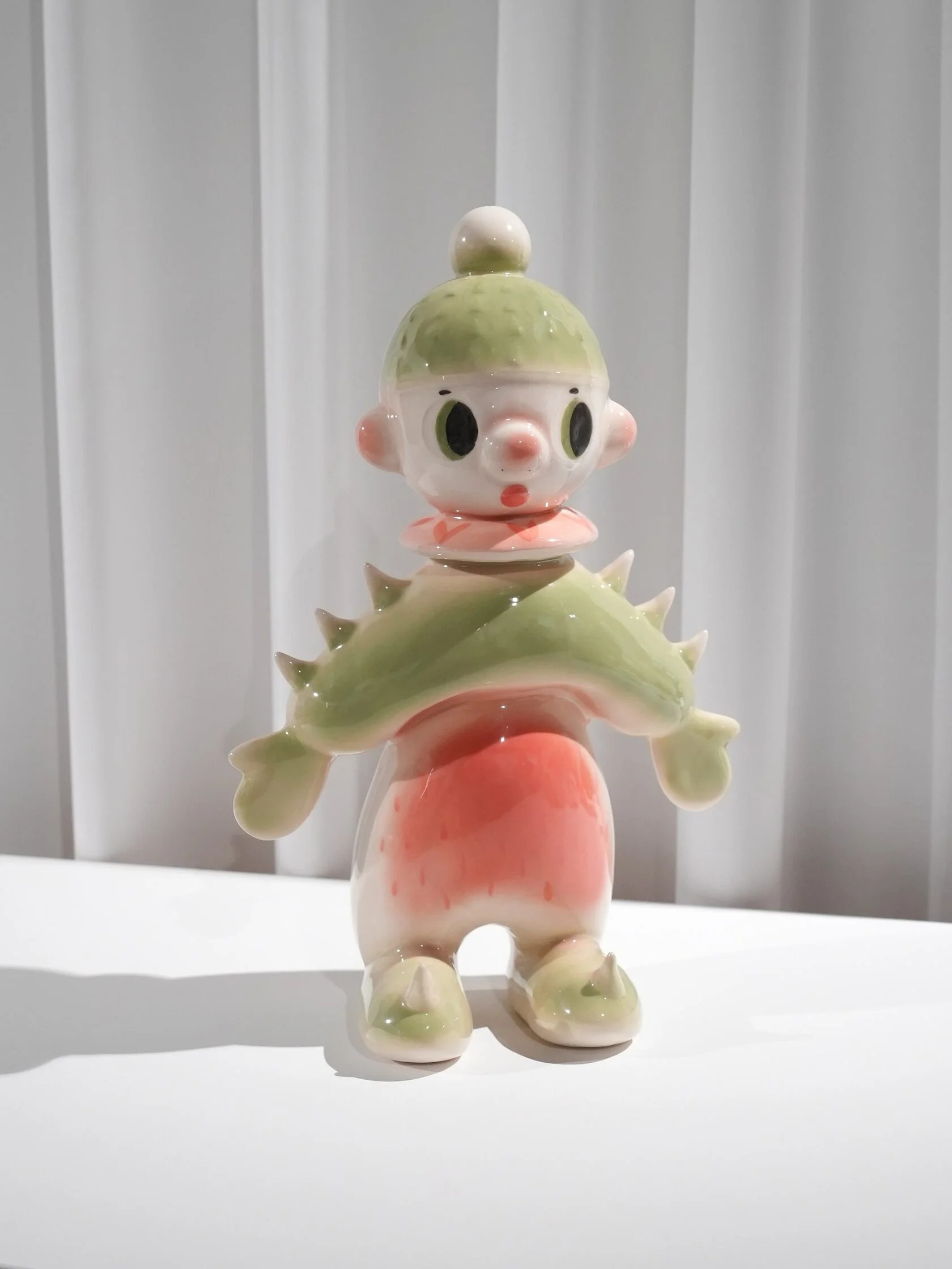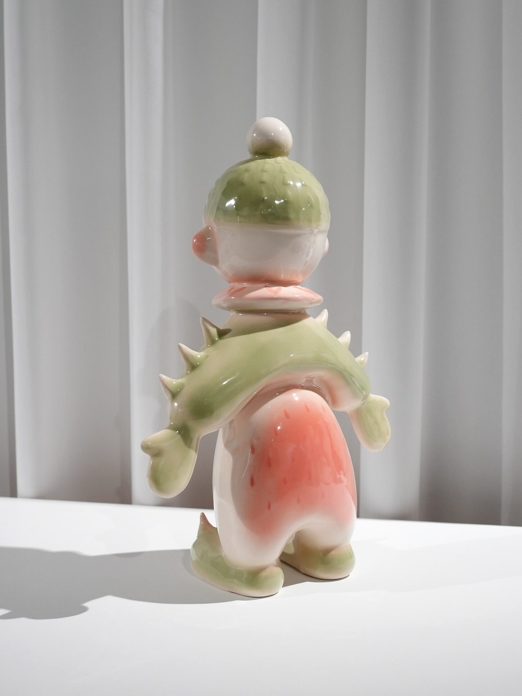 Скульптура Лыжник земляника — воплощение детской непосредственности в авторском полуфарфоре. В этой работе художница соединяет несовместимые, на первый взгляд, образы: зимний вид спорта и главный символ разгара лета. Фигурка лыжника удивляет своей необычной экипировкой в цветах спелой лесной ягоды с забавными шипами.