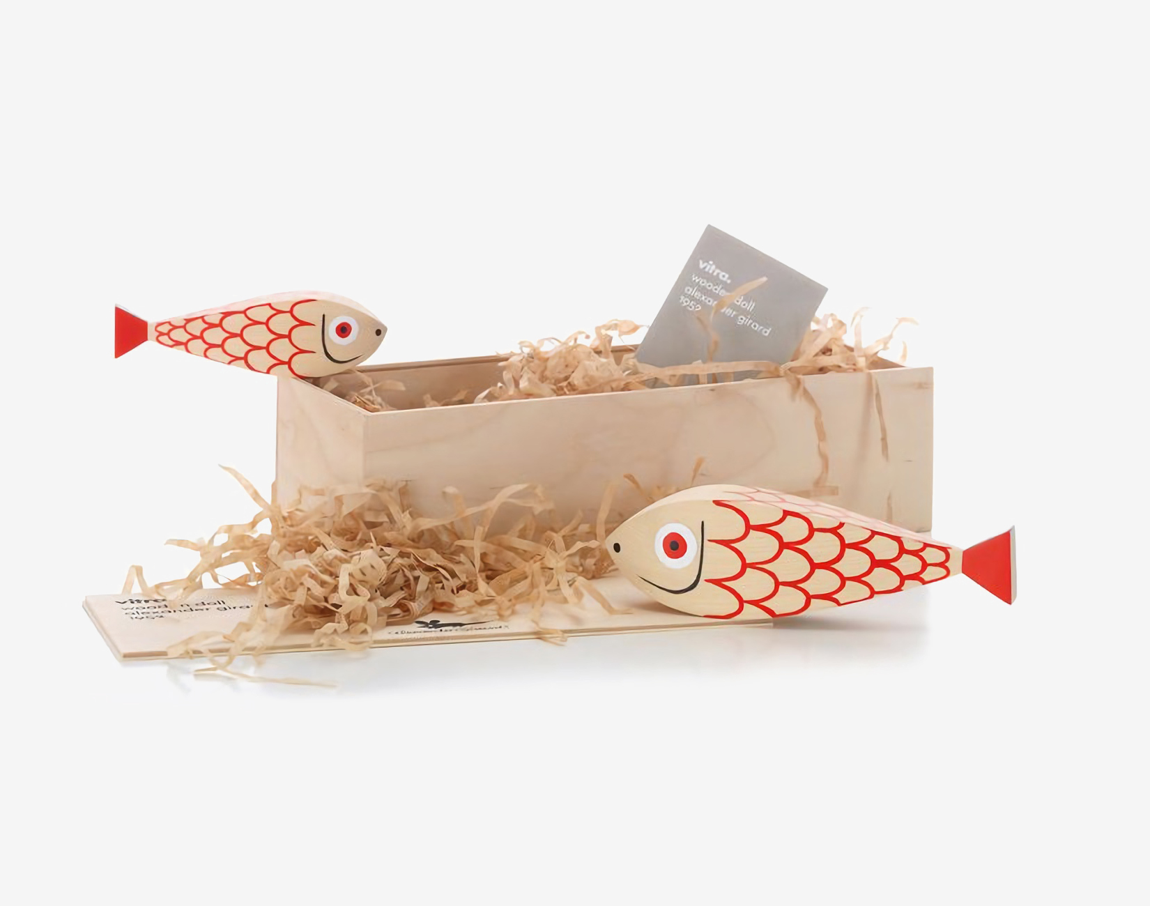Скульптура Vitra Wooden Dolls, Mother Fish and Child — ценное дополнение к коллекции деревянных статуэток Alexander Girard. Комплект из двух фигурок изображает рыбок в оранжево-красной цветовой гамме. Мама и малыш имеют горизонтальную ориентацию, за счёт чего выглядят гораздо компактнее других статуэток Wooden Dolls.