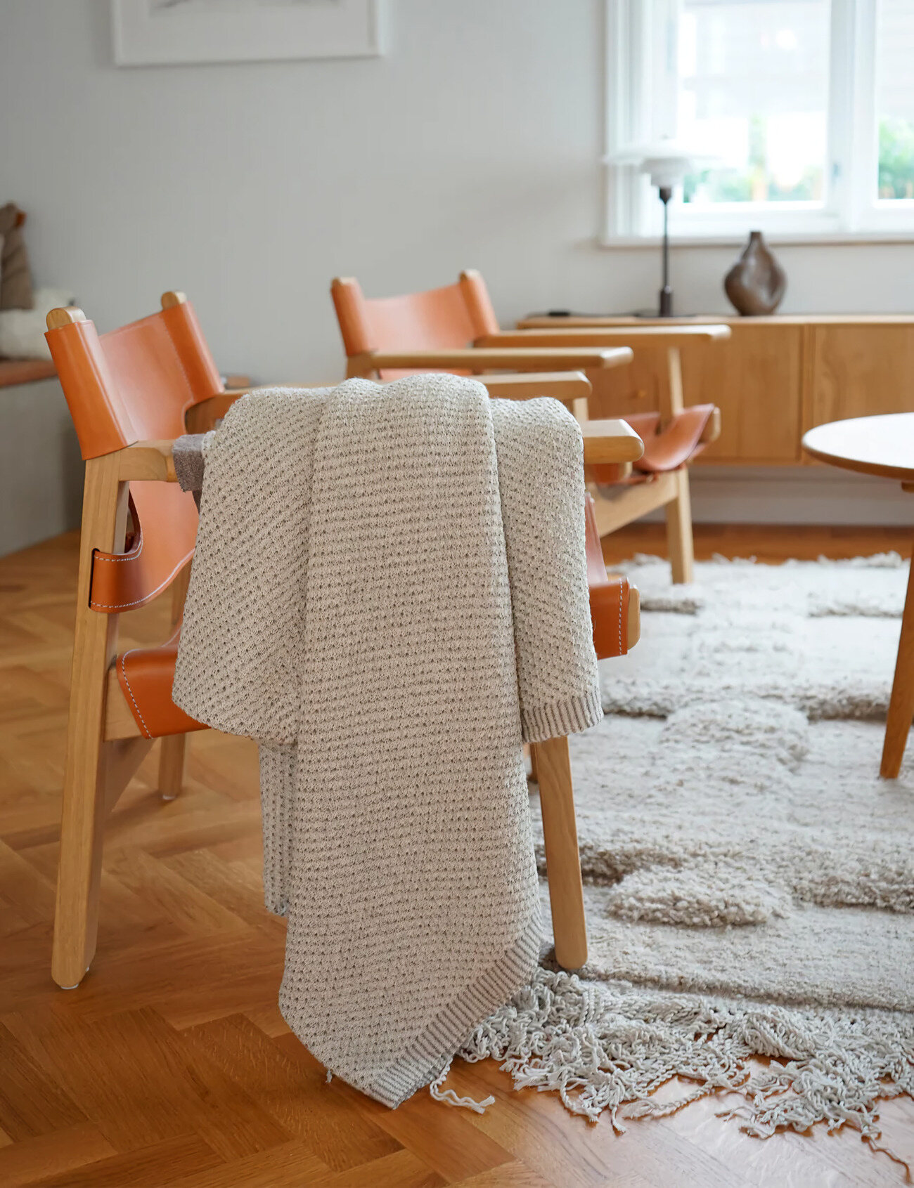 Плед Elvang Raindrops Throw сплетён из мягкой натуральной шерсти альпаки. Шерсть альпаки — это прочный вид текстиля, который дарит комфорт и согревает даже в низкие температуры. Модель доступна в трёх пастельных тонах.