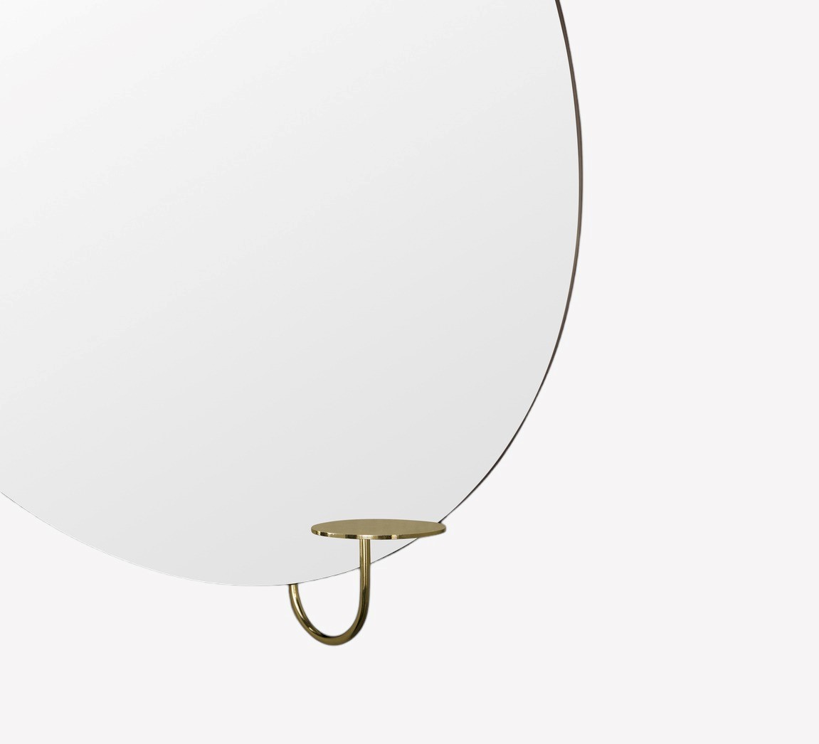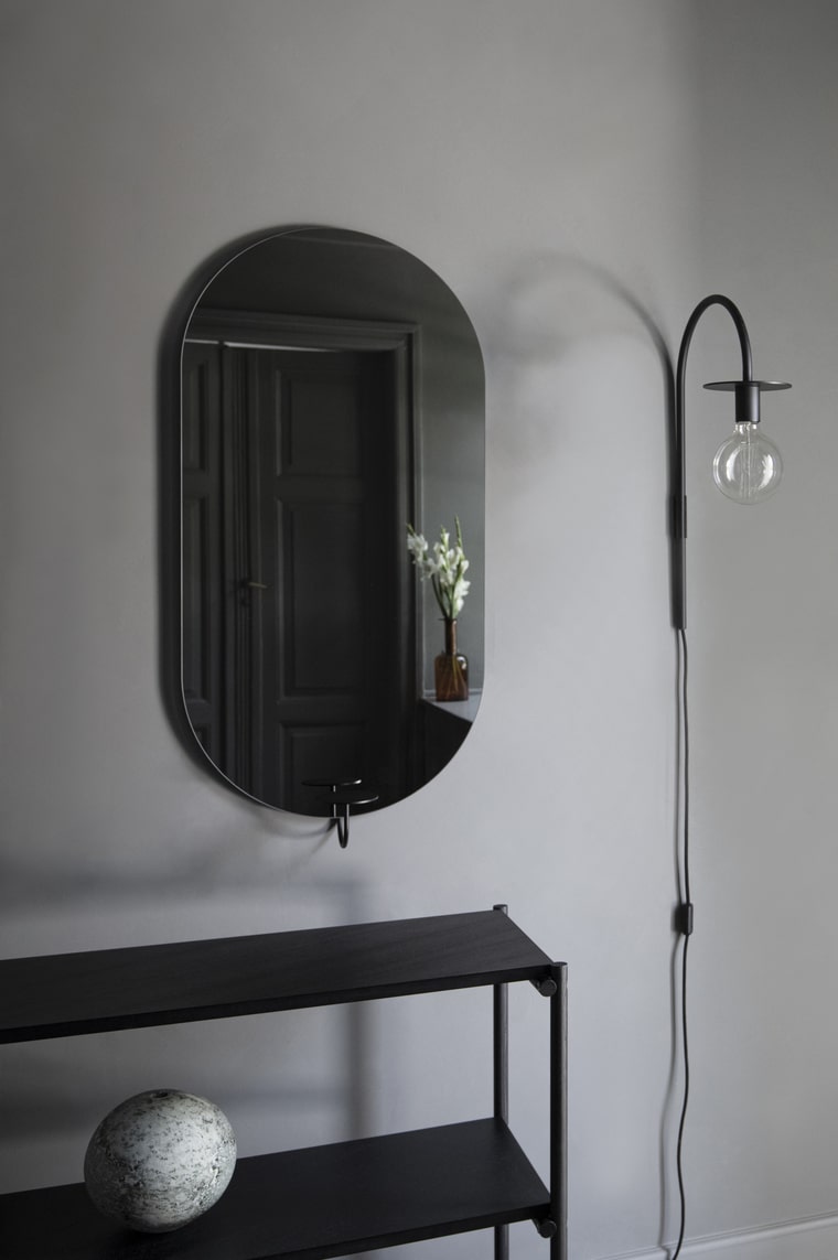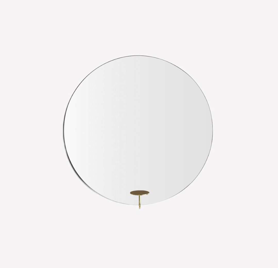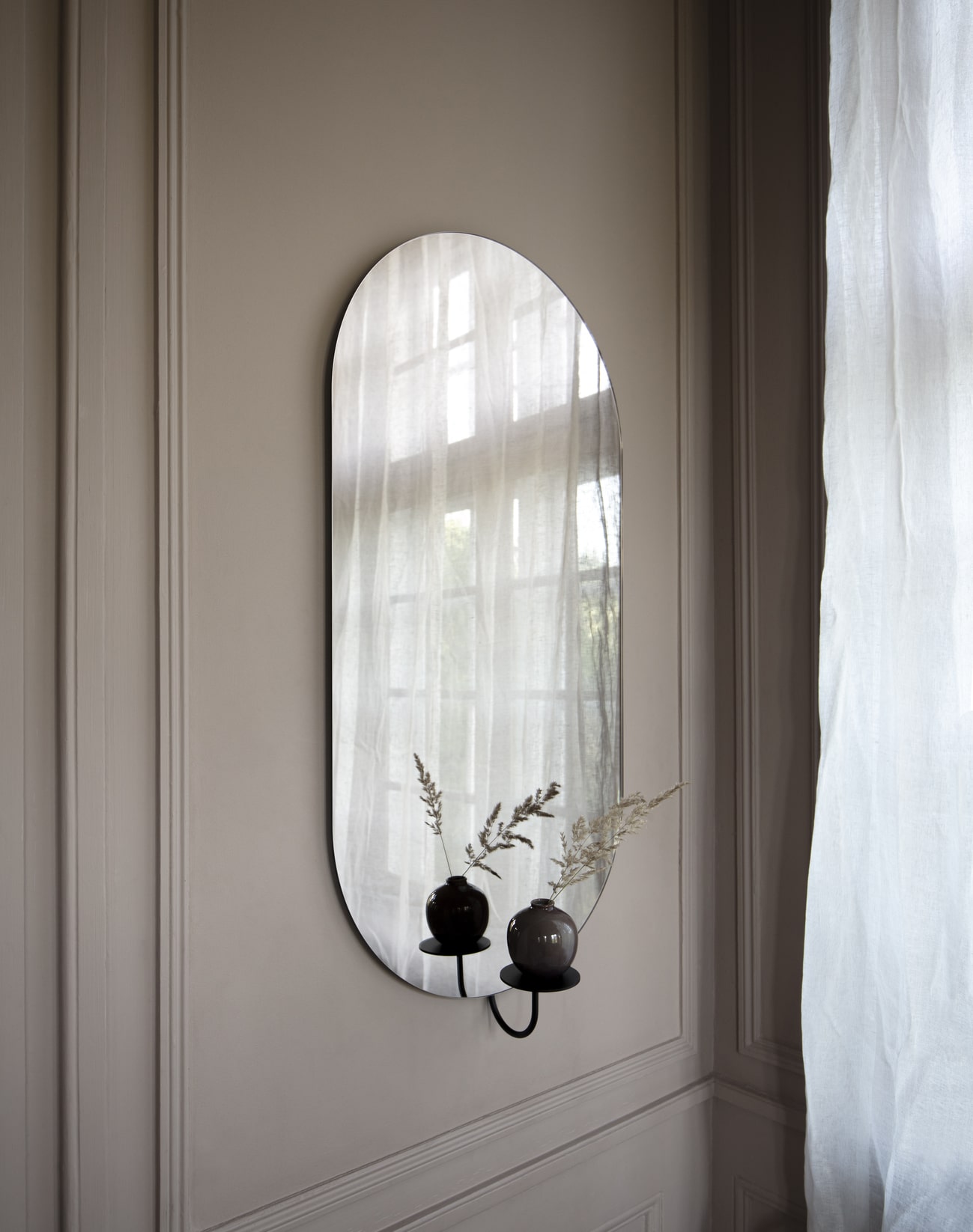 Настенное зеркало Miró Miró выполнено из тёмного или прозрачного зеркального стекла со съёмным круглым столиком для мелких предметов. Столик выполнен из металла с чёрным или медным покрытием. Для овальных зеркал доступен как вертикальный, так и горизонтальный монтаж.