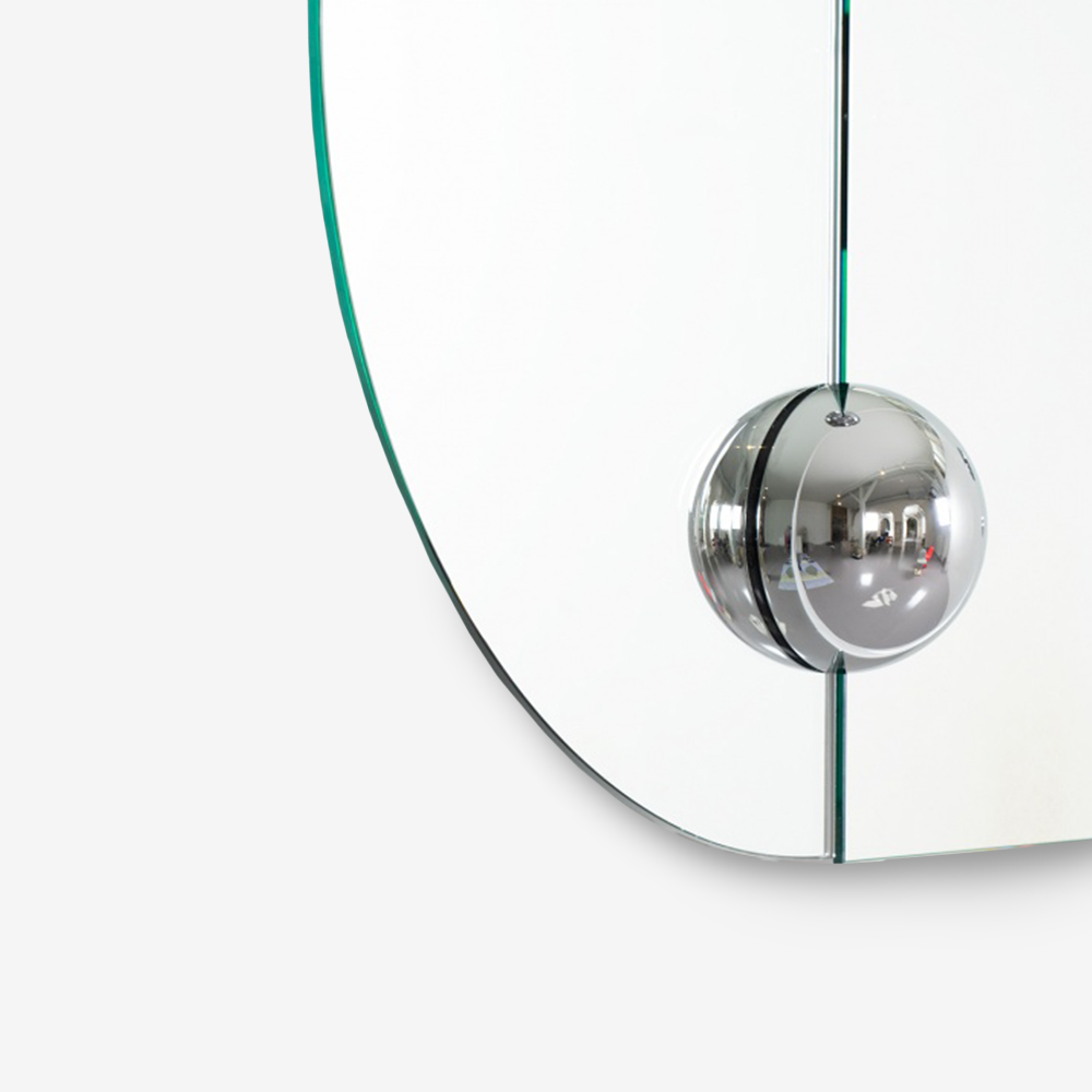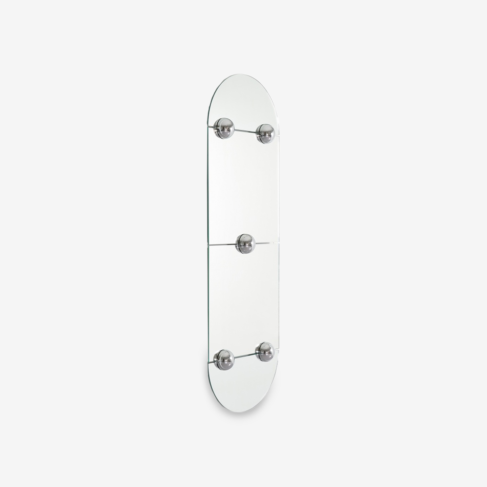 Настенное зеркало Sphera Oblong mirror L от Jean-Baptiste Fastrez высотой более 180 см отлично дополнит интерьер гостиной, холла или даже гардеробной комнаты. Вдохновленное техническим процессом создания зеркальных стен зеркало имеет минимум фурнитуры, что делает его изящным и невесомым, несмотря на свои размеры. А хромированные элементы словно подчеркивают чистоту стекла.