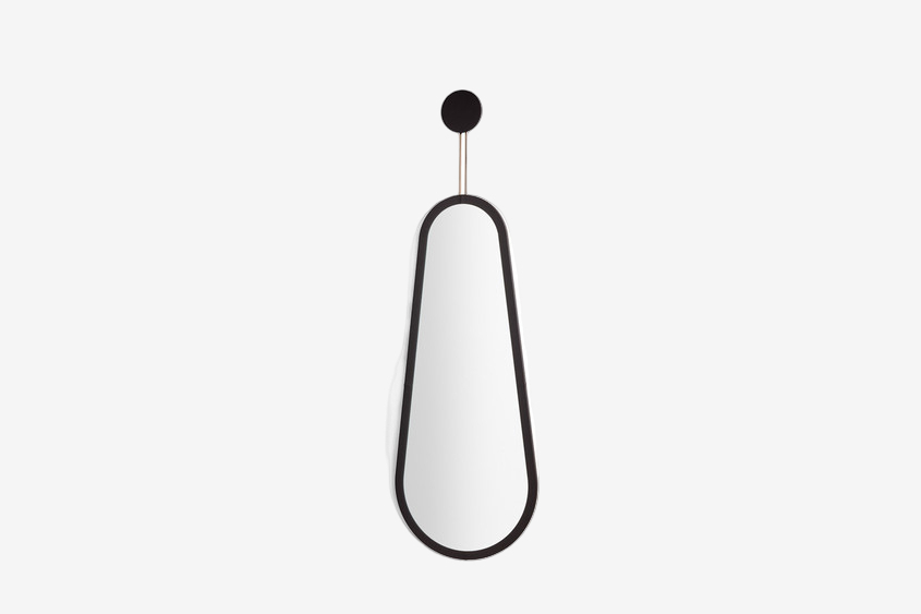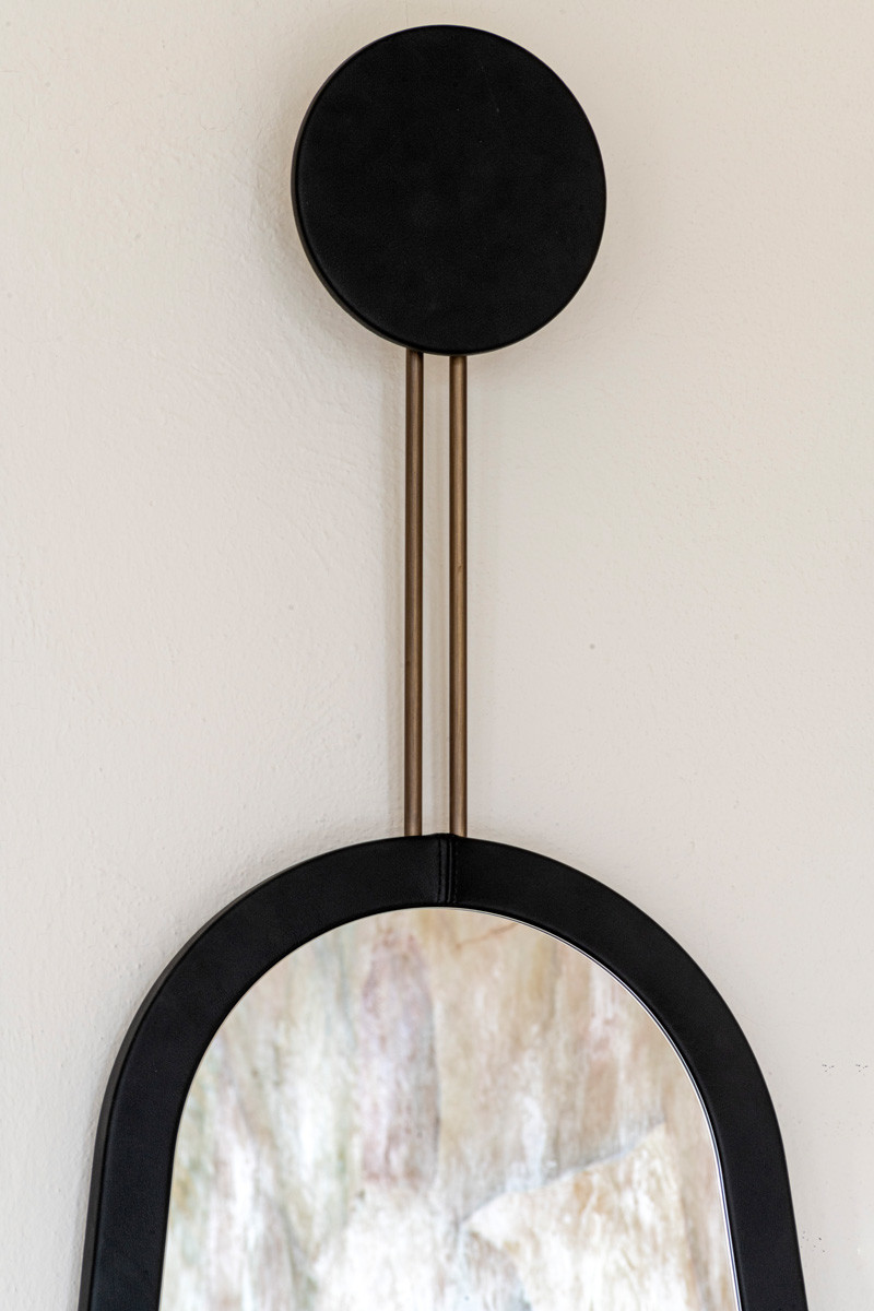 Зеркало Potocco Stilla от Serena Confalonieri — модель каплевидной формы с кожаной окантовкой. Верхняя часть соединена с круглым элементом двумя параллельными штифтами. Силуэт расширяется к низу. Все металлические элементы выполнены из бронзированной латуни.
