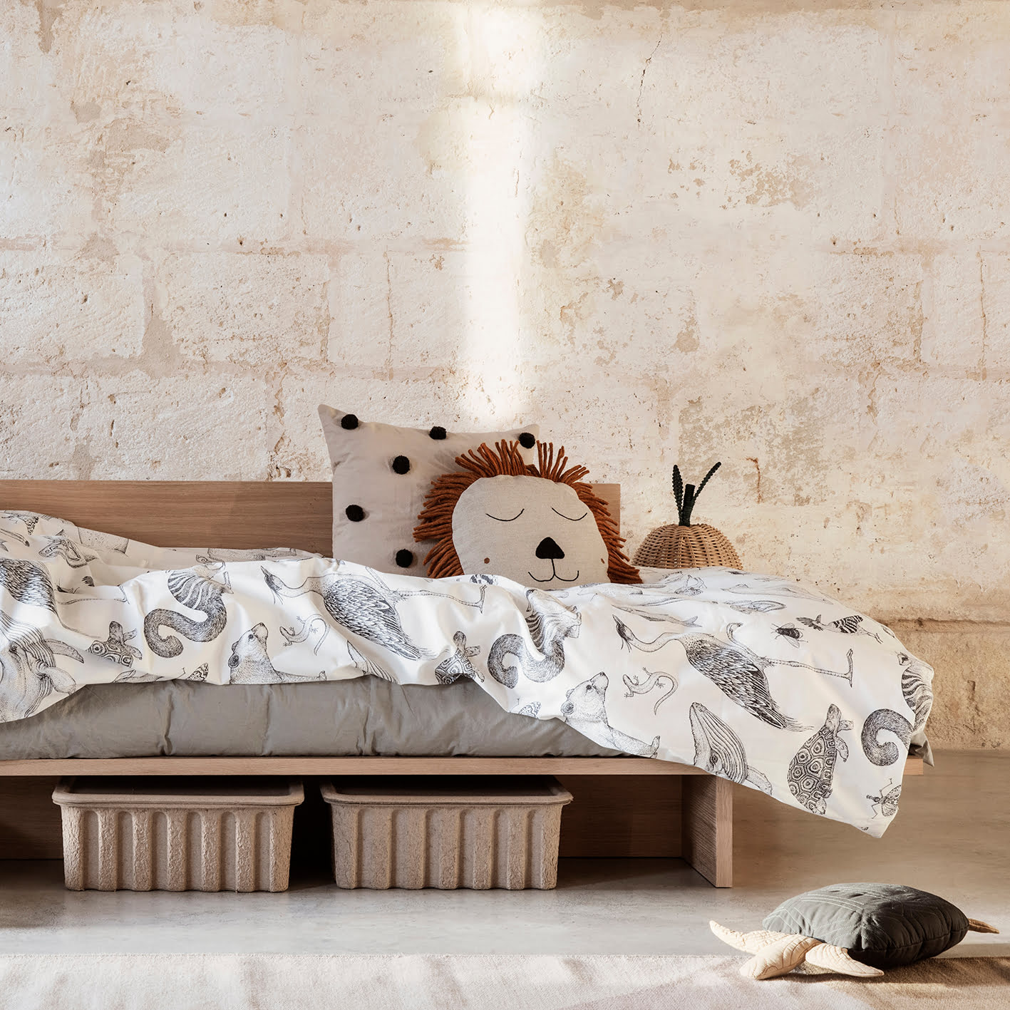 Чехол подушки изготовлен из органического хлопка и переработанной полиэфирной пряжи. Наполнитель: перо и пух.