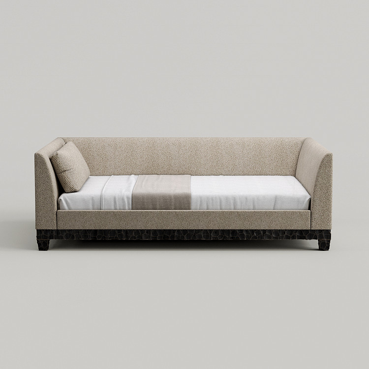 Диван-кровать Modénature Megeve Sofa Bed. Форма дивана строится на прямых линиях и четких плоскостях. Три глухие панели создают ощущение уединенности. Основание модели имеет выразительную фактуру с волнистым рисунком. Мягкий блок сиденья заполняет внутреннее пространство, завершая лаконичный образ.