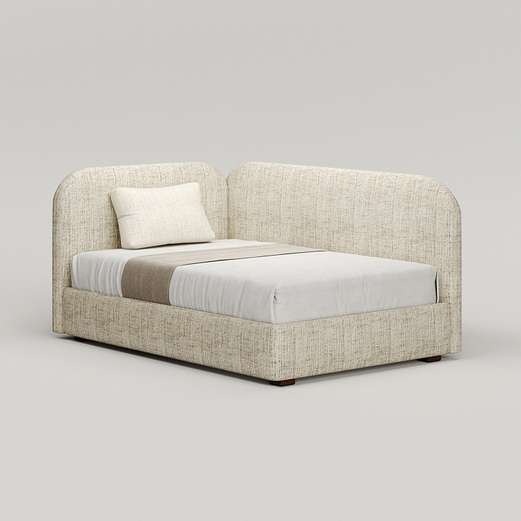 Диван-кровать Modénature Swan Sofa Bed #1. Конструкция построена на контрасте закрытых и открытых сторон. Две массивные спинки расположены под прямым углом друг к другу. Их верхние грани скруглены по большому радиусу. Основание представляет собой невысокую платформу, визуально парящую над полом. Модель рассчитана на использование у стены или в углу.
