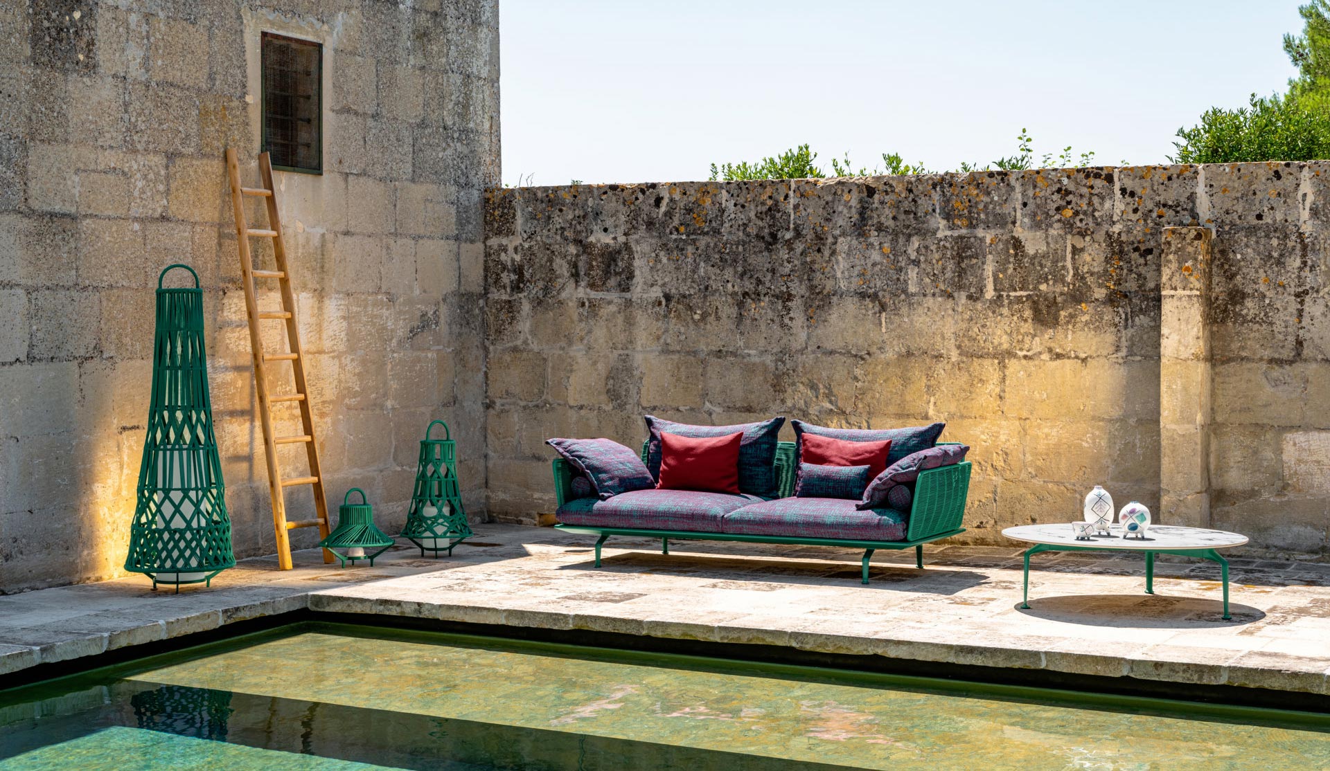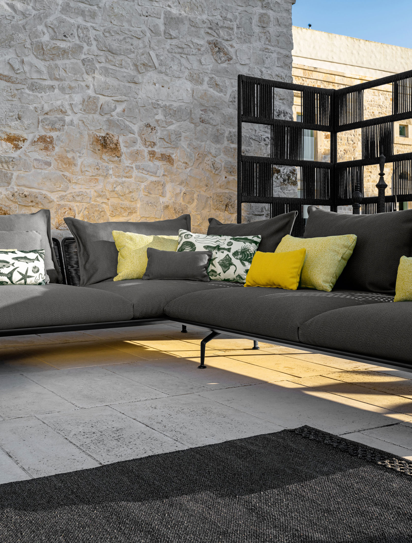 Уличный диван Talenti Cruise Alu от Ludovica + Roberto Palomba входит в коллекцию с морским характером. Алюминиевый каркас с четкой геометрией обтянут плетением из синтетического каната — оно покрывает спинку и подлокотники. Каркас держится на тонких изогнутых ножках. Подушки тканевые, со спекл-узором и графичными принтами. В основе коллекции — простота линий.