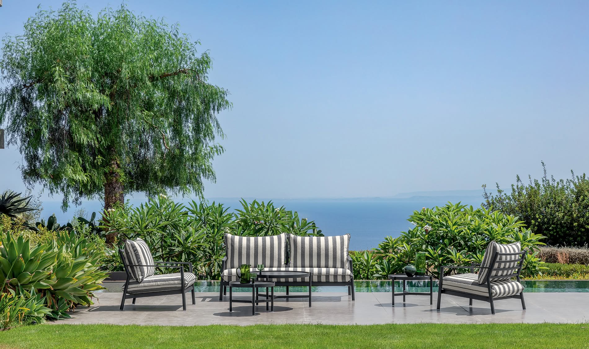 Уличный диван Talenti Finn построен вокруг тонкого алюминиевого каркаса. Прямоугольные трубы образуют открытую структуру с четкими линиями. Сиденье цельное, спинка составлена из подушек — вся обивка в вертикальную полоску. Подлокотники металлические, открытые. Подушки съемные.