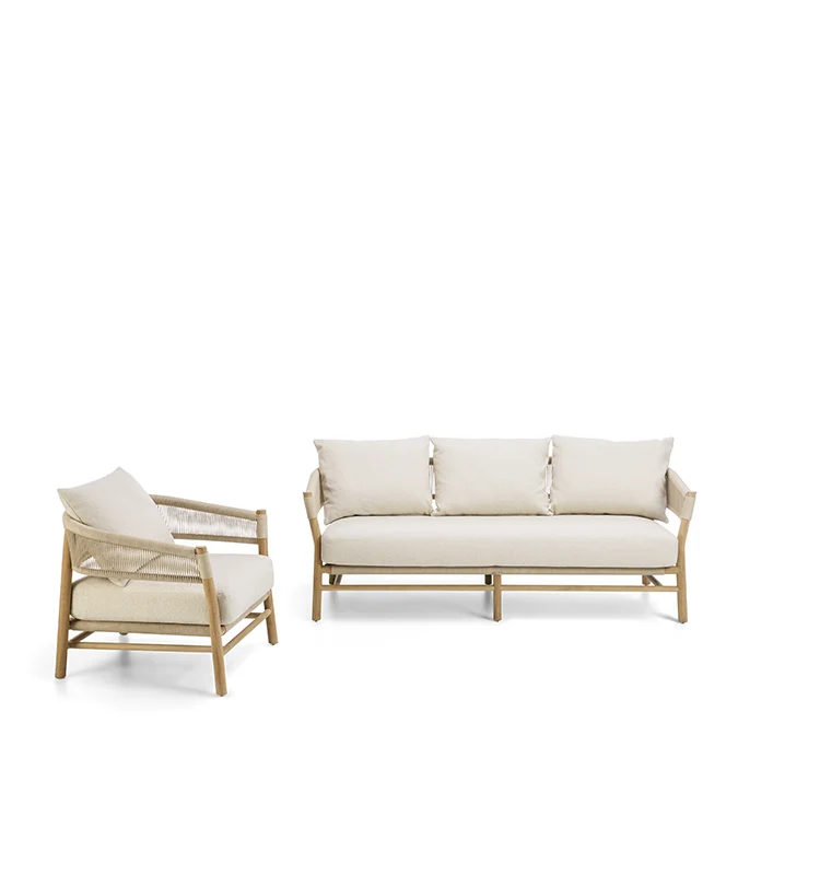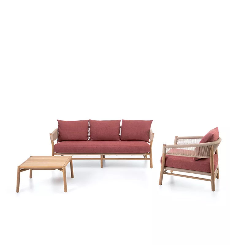 Каркас из натурального тика с плетеным шнуром Round Rope. Съемные подушки с обивкой из ткани Canapa или полиолефинового волокна.