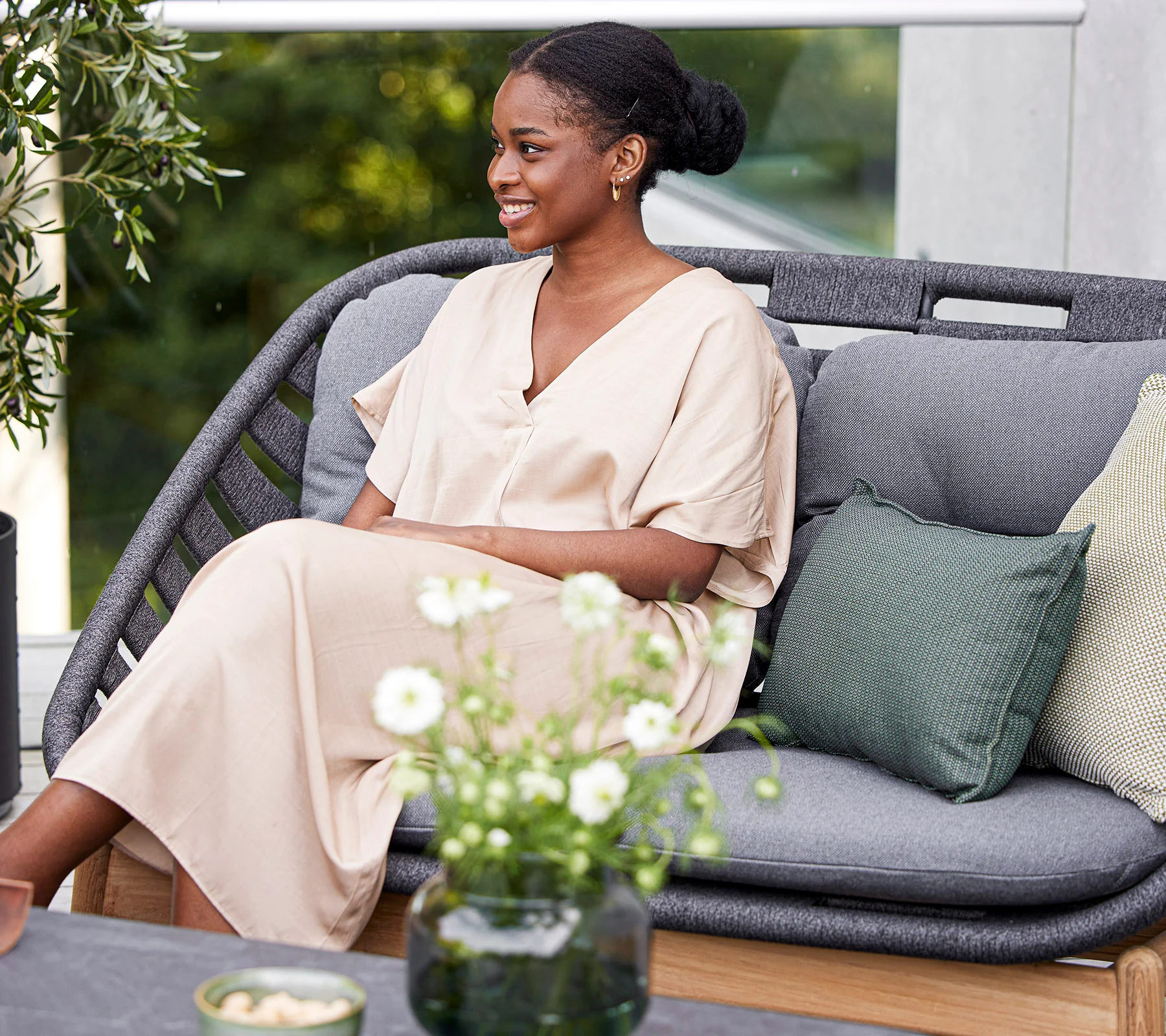 Каркас из тика, плетеное волокно Cane-line Soft Rope. Подушки из ткани AirTouch с системой QuickDry & Airflow.