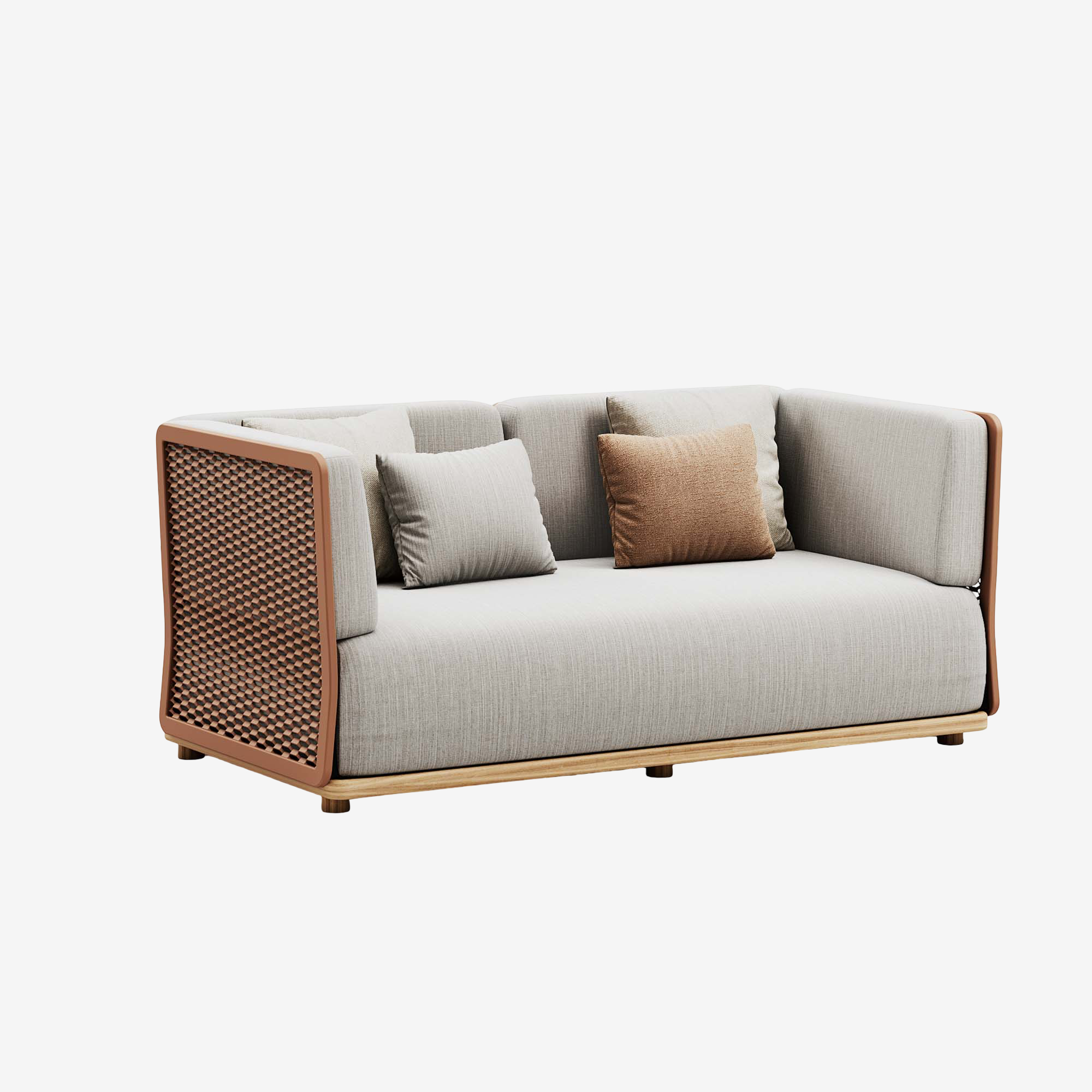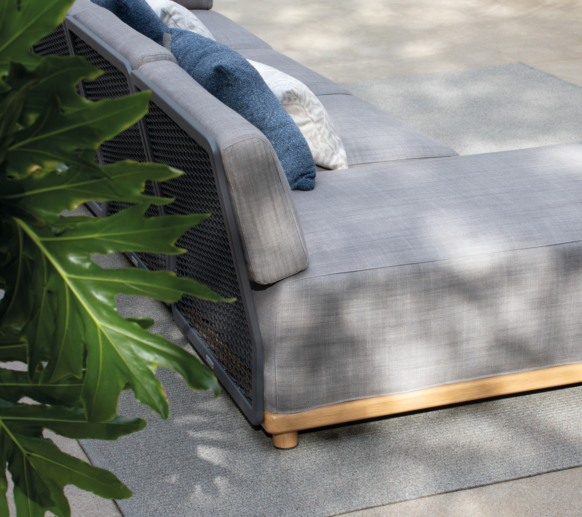 Уличный диван Atmosphera Switch от Atmosphera Creative Lab. Алюминиевое основание с покрытием под тик, спинка и высокие подлокотники из алюминиевой сетки. Подушки сиденья и спинки мягкие, тканевые. Лаконичный индустриальный дизайн.