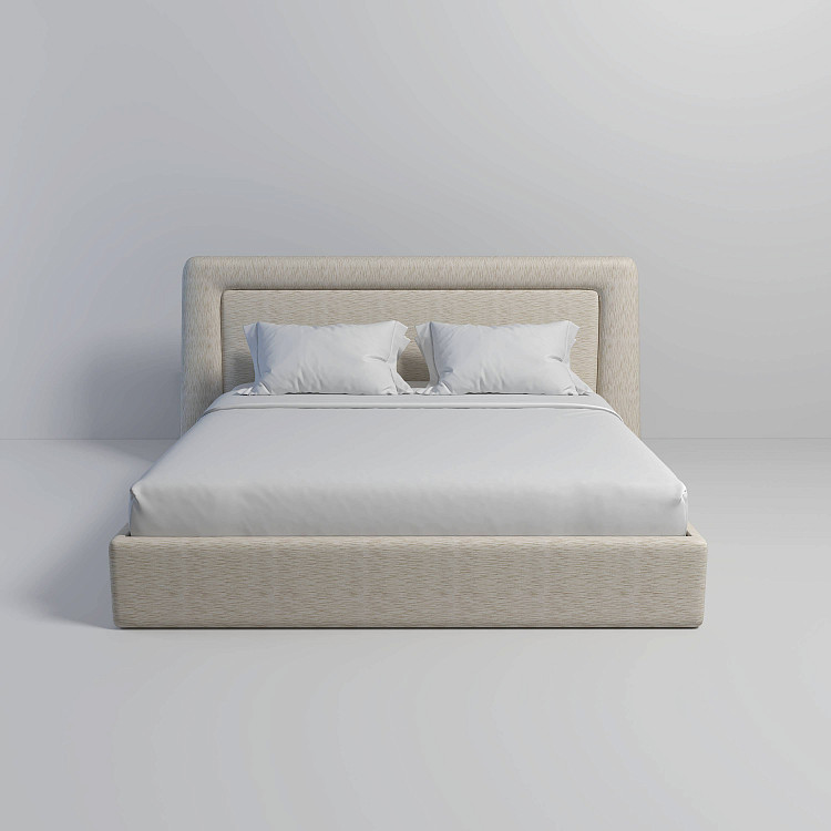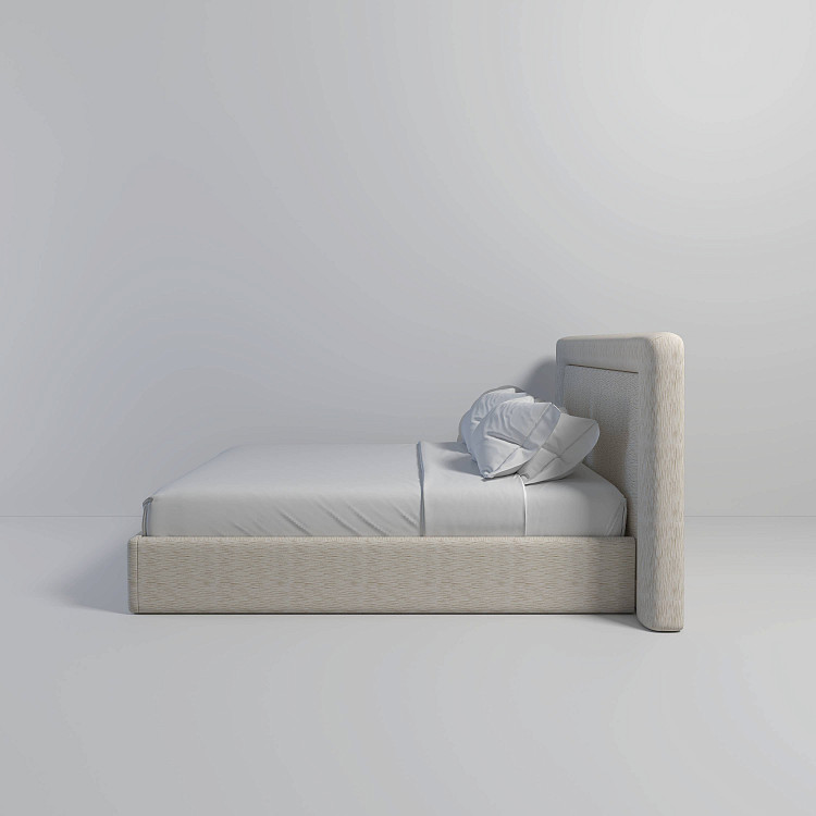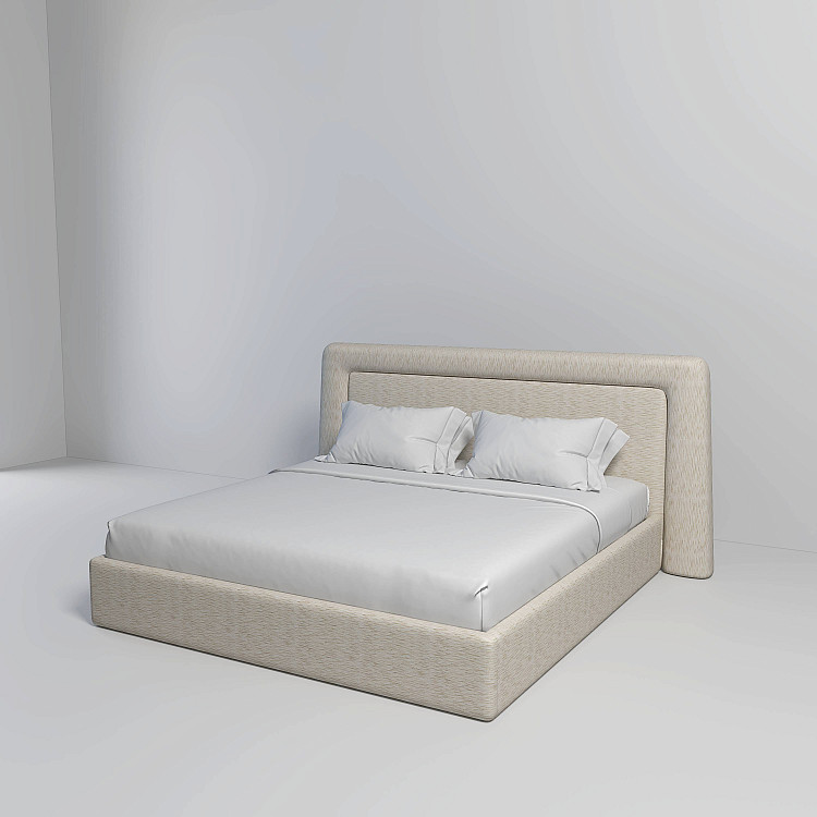 Кровать Modénature Anthea Bed от Alexander Beloborodov. Изголовье этой кровати имеет сложную объемную форму. Оно представляет собой широкий мягкий валик, обрамляющий более глубокую центральную часть. Эта конструкция заметно шире компактного основания. Все элементы, включая основание со скругленными гранями, обтянуты одним материалом. Форма выглядит монолитно и уютно.