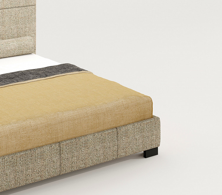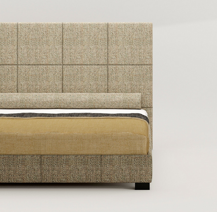 Кровать Modénature Fiona Bed развивает тему Collection Historique. Ее силуэт определяет высокое прямоугольное изголовье с геометричной стежкой. Основание представляет собой текстильный короб на тонких черных опорах. Мягкий объем дополняет длинный валик у изголовья. Все линии прямые, углы четкие.
