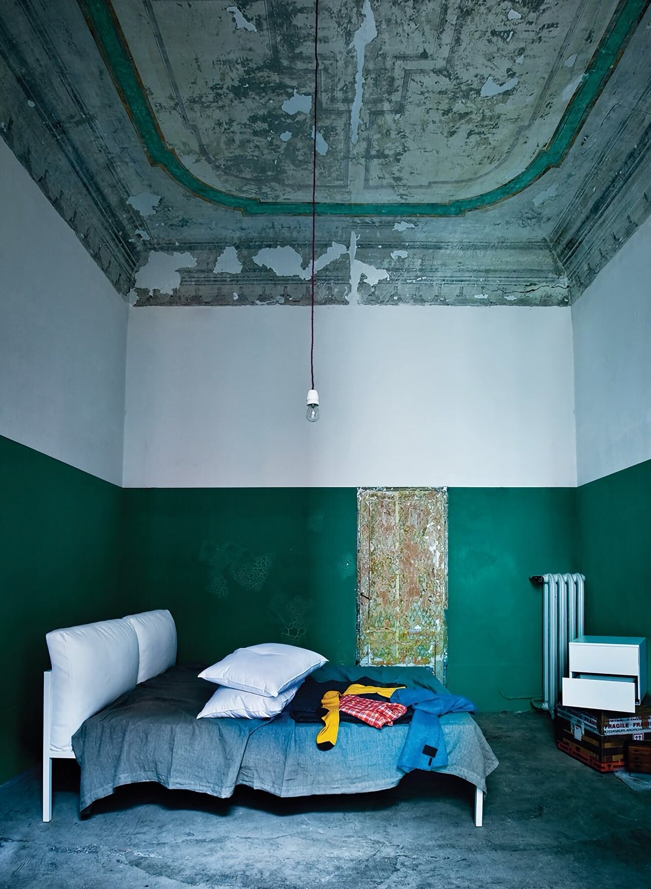 Сталь, бук, гусиный пух, полиуретан, текстиль, кожа.