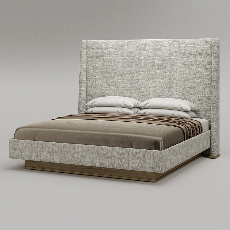 Кровать Modénature Revers Bed от Oleg Klodt. Силуэт кровати формирует высокое изголовье с расходящимися боковинами. Его объемный клиновидный профиль контрастирует с плоским прямоугольником основания. Основание покоится на узком деревянном цоколе, скрытом в его тени. Эта деталь создает эффект невесомости для массивной формы.