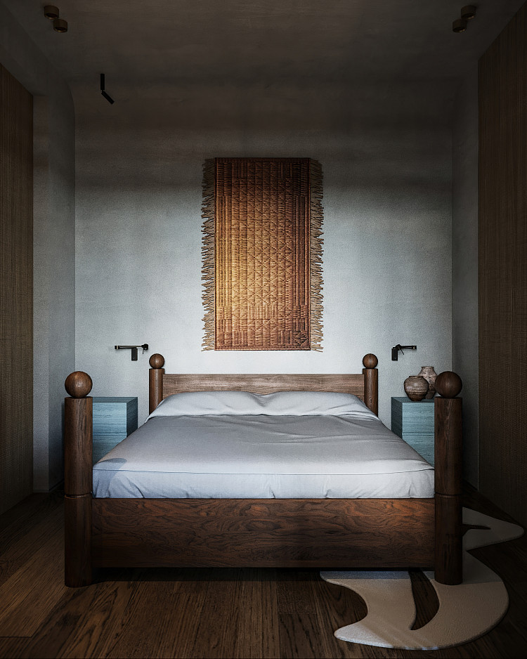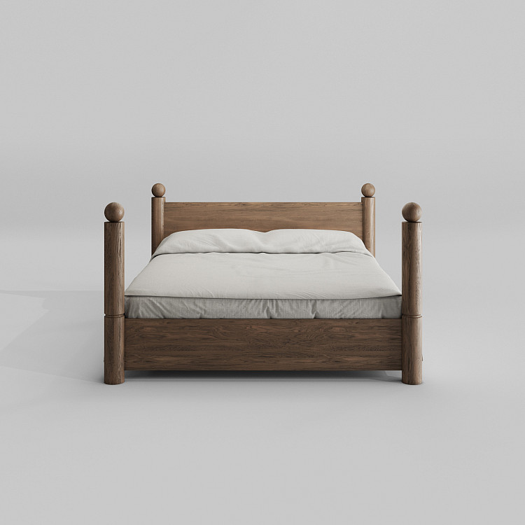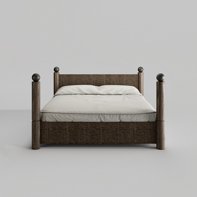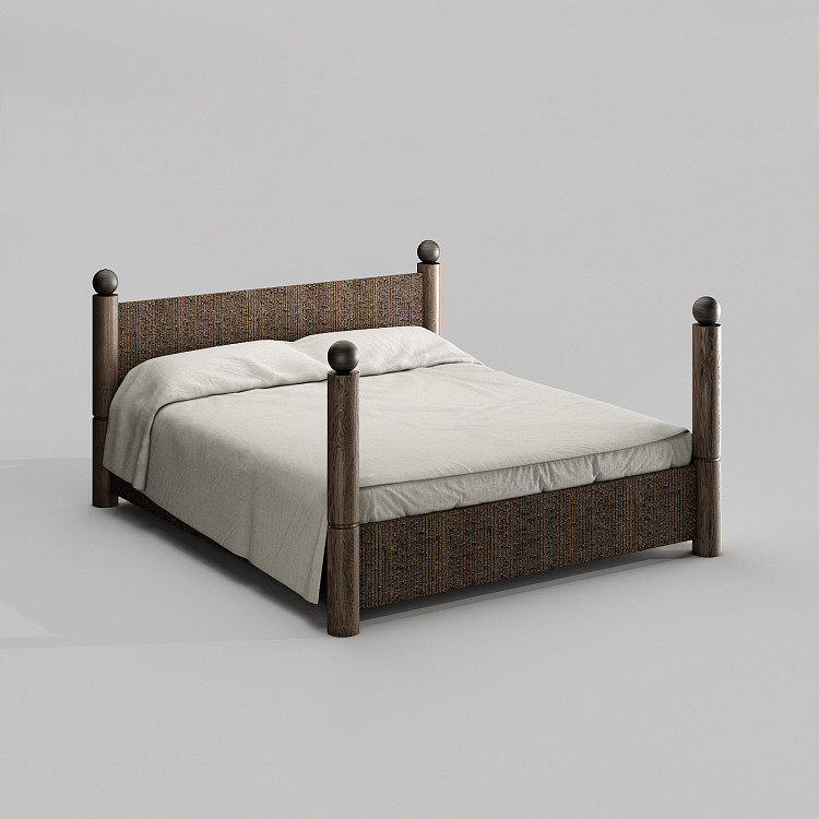 Кровать Modénature Ronda Bed от Aida Ragimkhanova. Ее каркас составляют четыре массивные высокие стойки, увенчанные шарами. Они поддерживают высокое изголовье, которое занимает все пространство между задними опорами. Изголовье предлагается в двух вариантах: из цельного дерева или с декоративной плетеной панелью. Передняя часть кровати представляет собой невысокую царгу, замыкающую прямоугольник основания.