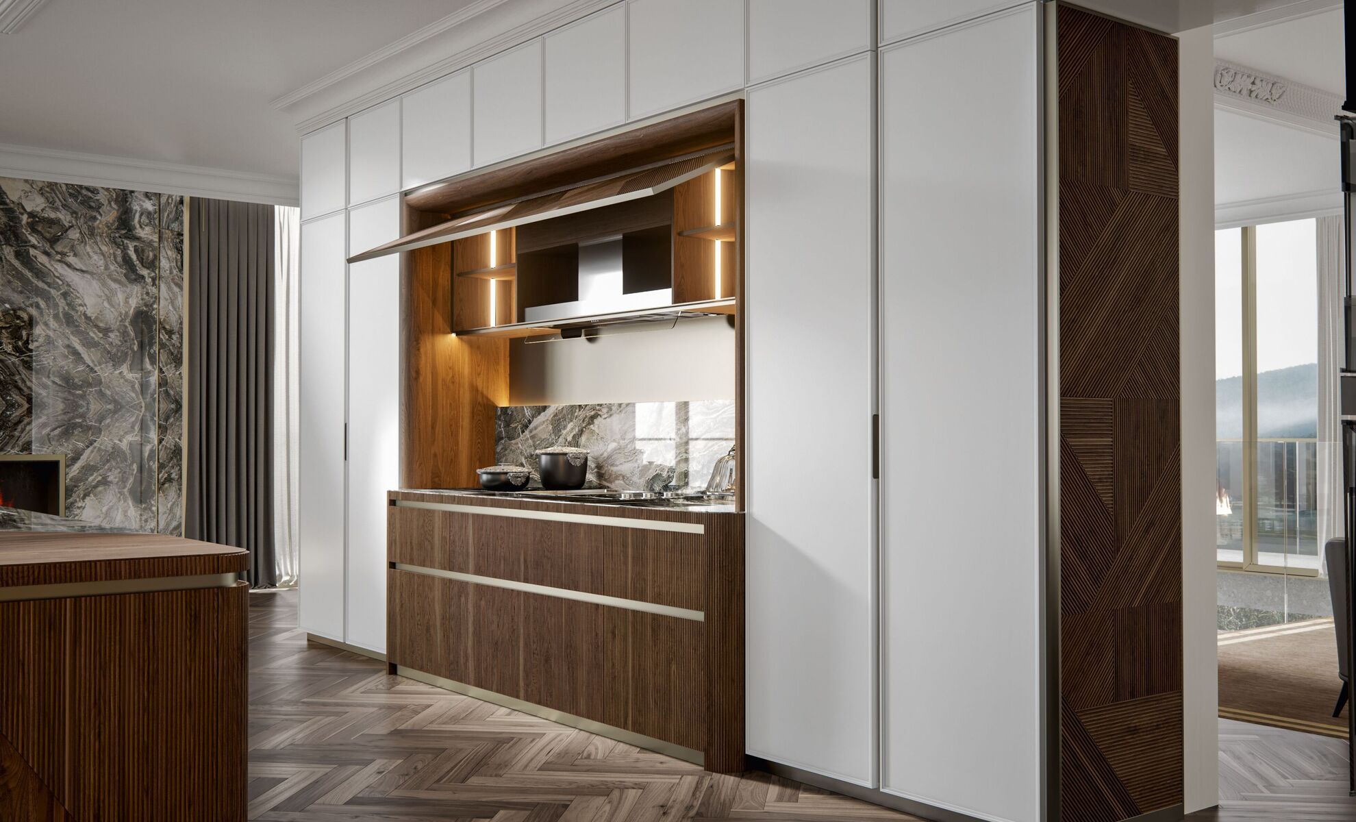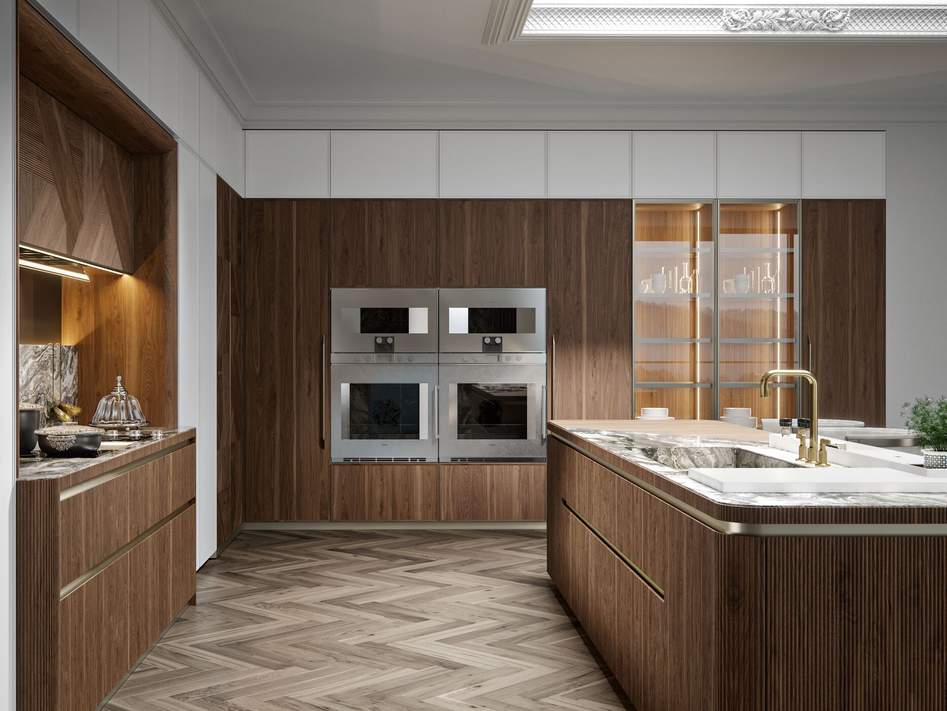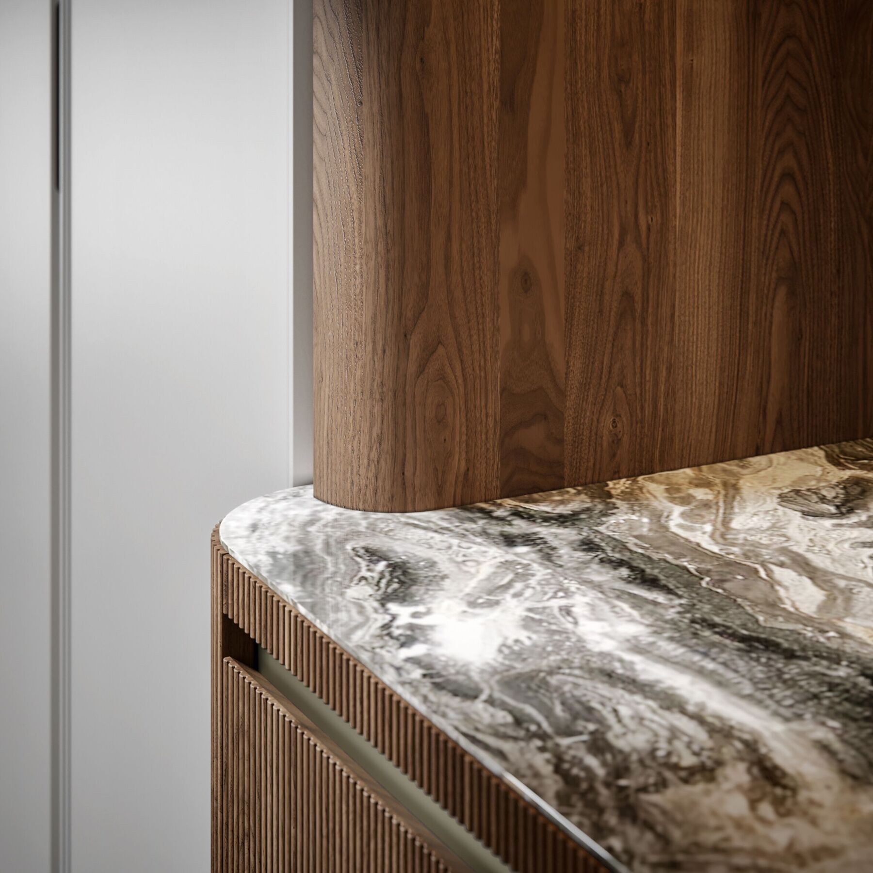Поверхности и фасады: орех каналетто, глянцевый лак Perla NCS 1500-N, матовый лак Cipria NCS S3010Y-50R.