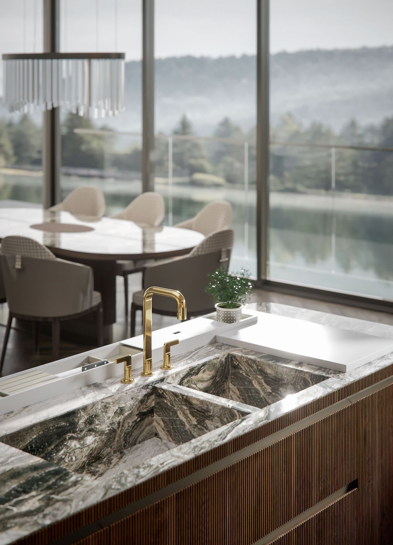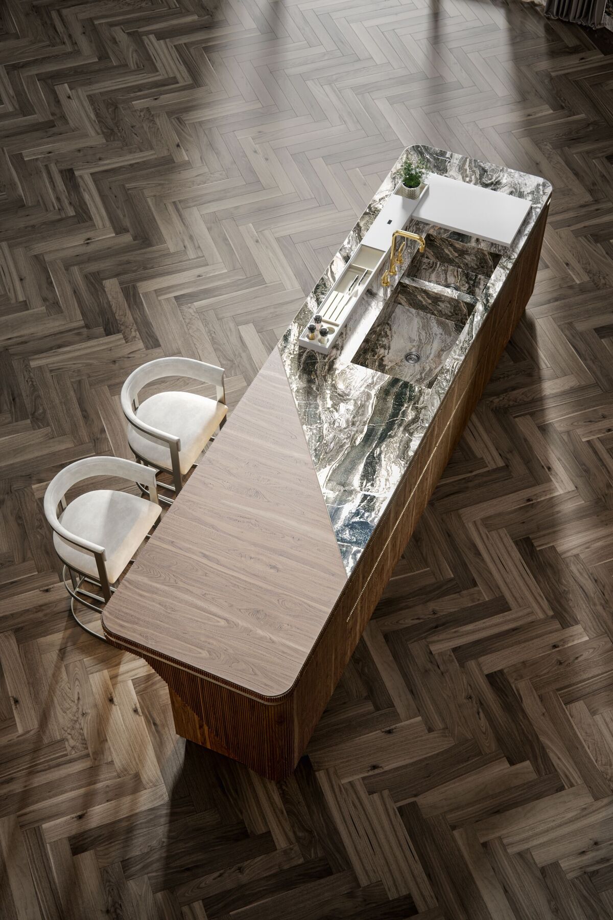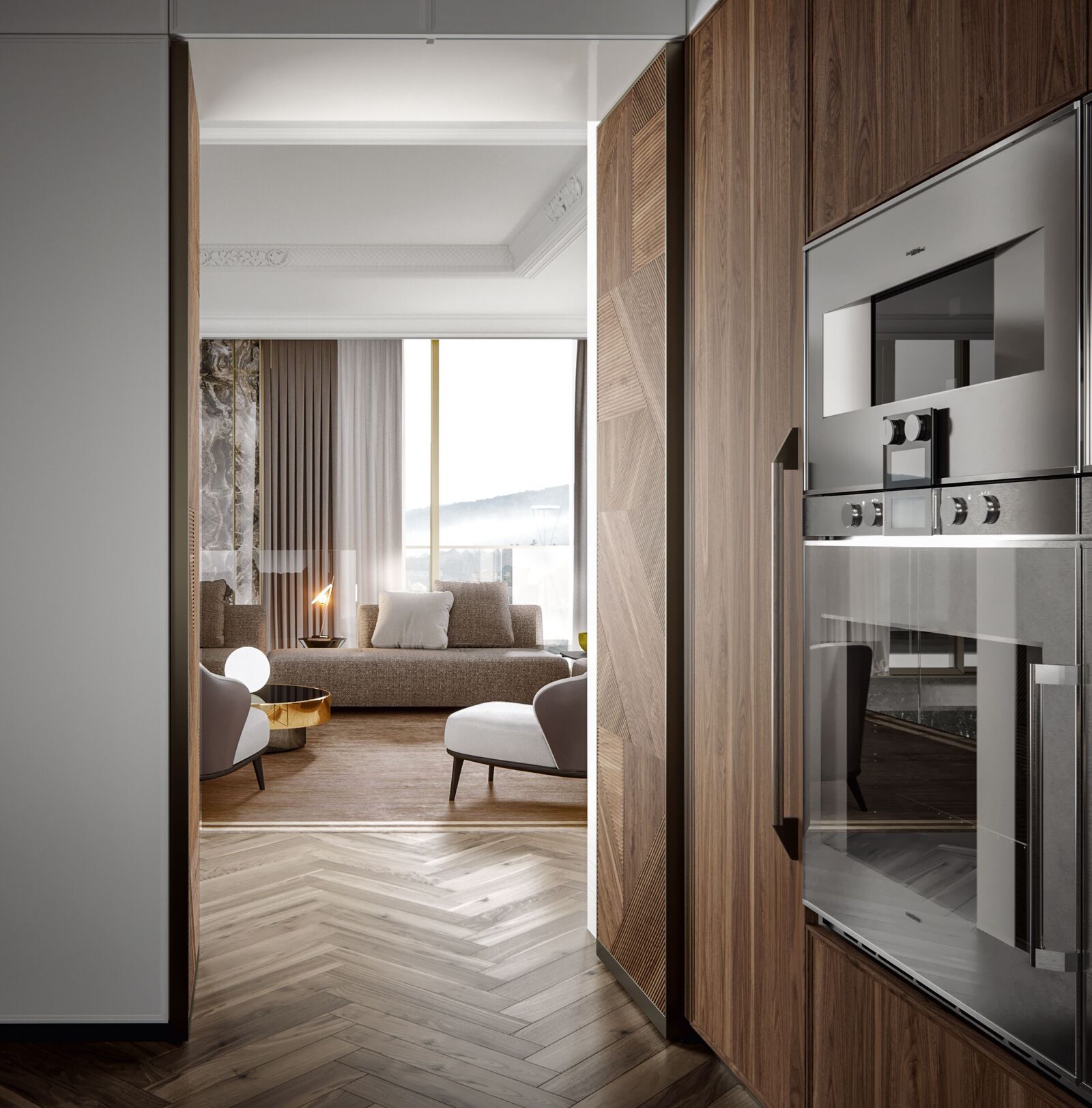 Поверхности и фасады: орех каналетто, глянцевый лак Perla NCS 1500-N, матовый лак Cipria NCS S3010Y-50R.
