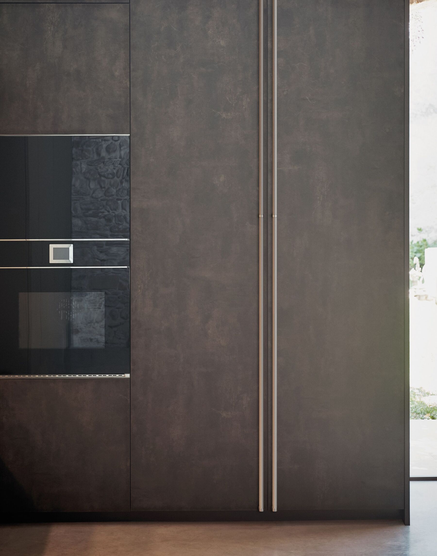 Высокие шкафы: створки и боковые панели из керамики Moka Abujardado Jasper Mdi Inalco, чёрные ручки Frame.