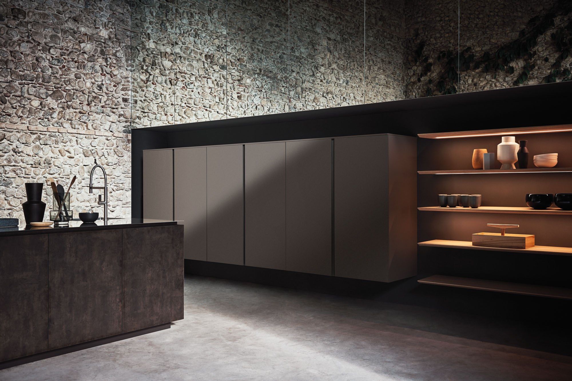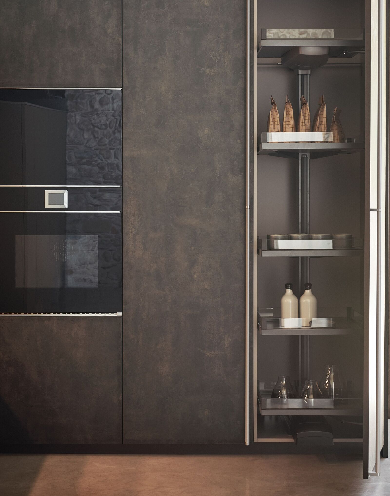 Высокие шкафы: створки из пластика Fenix цвета Fango, ручки из титана.