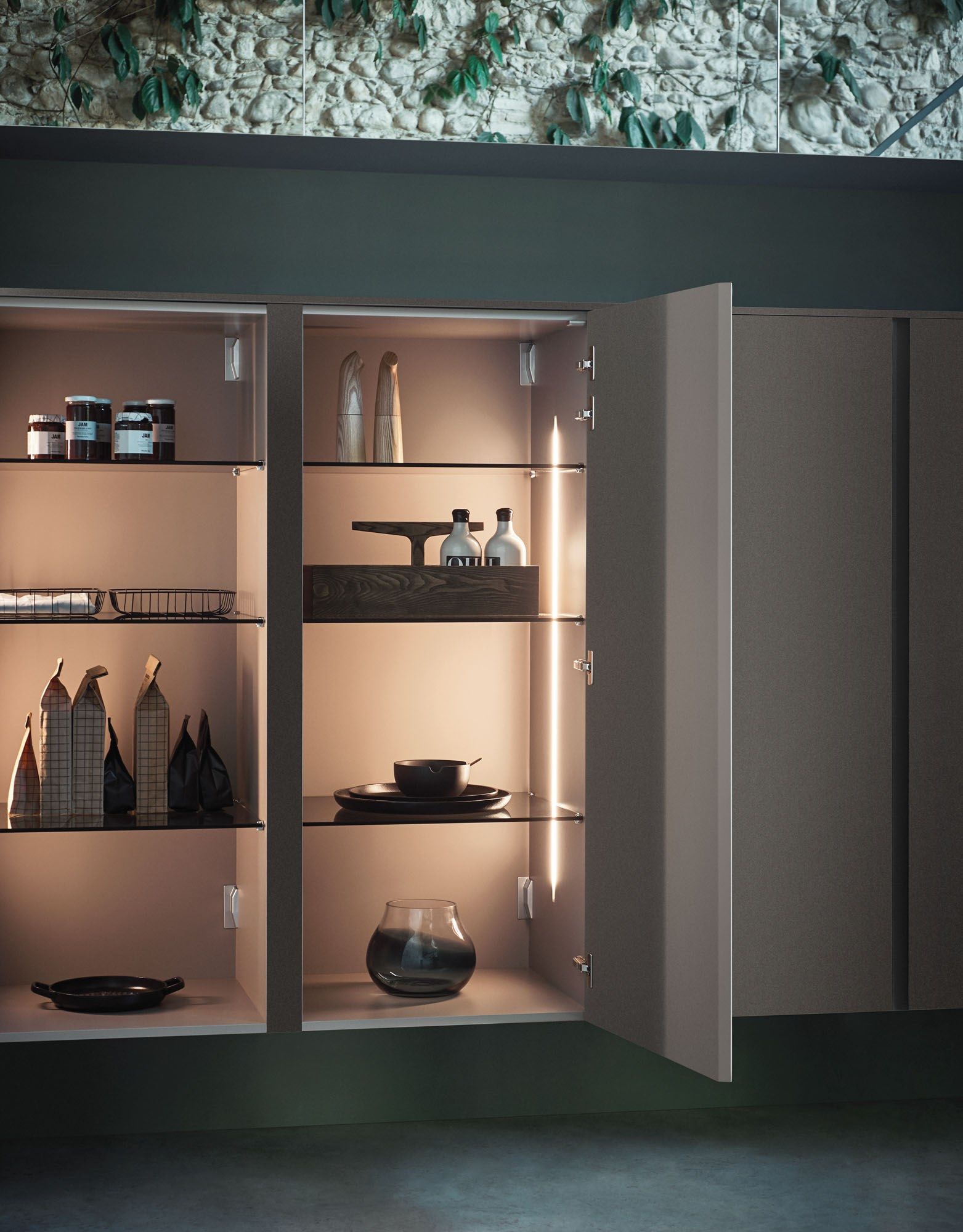 Высокие шкафы: створки в лакировке с металлическим эффектом Ferro Anodyc. Высокие витринные шкафы имеют наполнение Comb и открытые отделения Thin.
