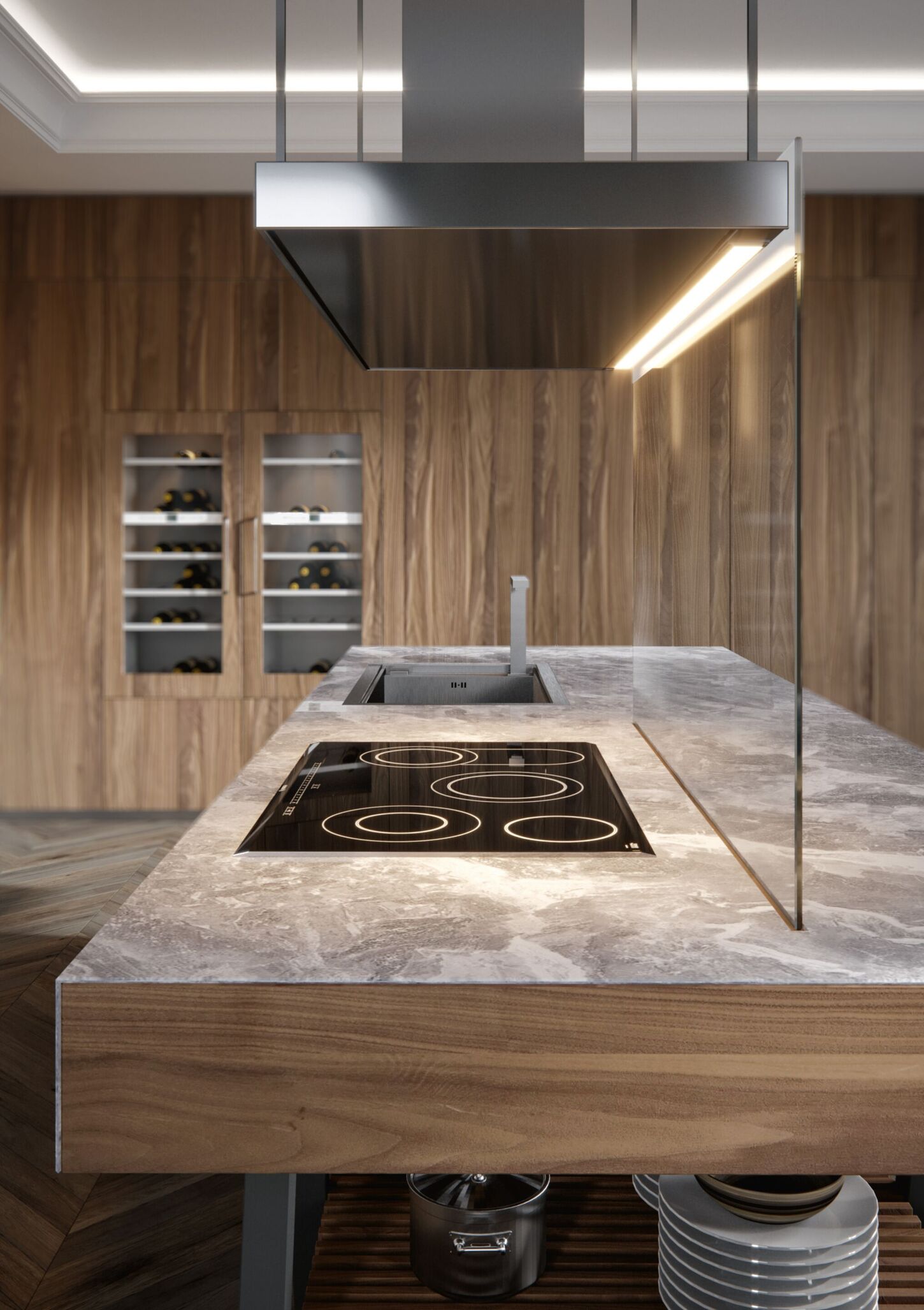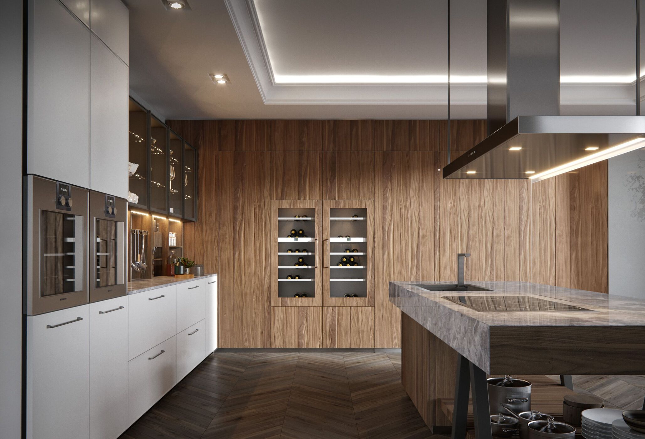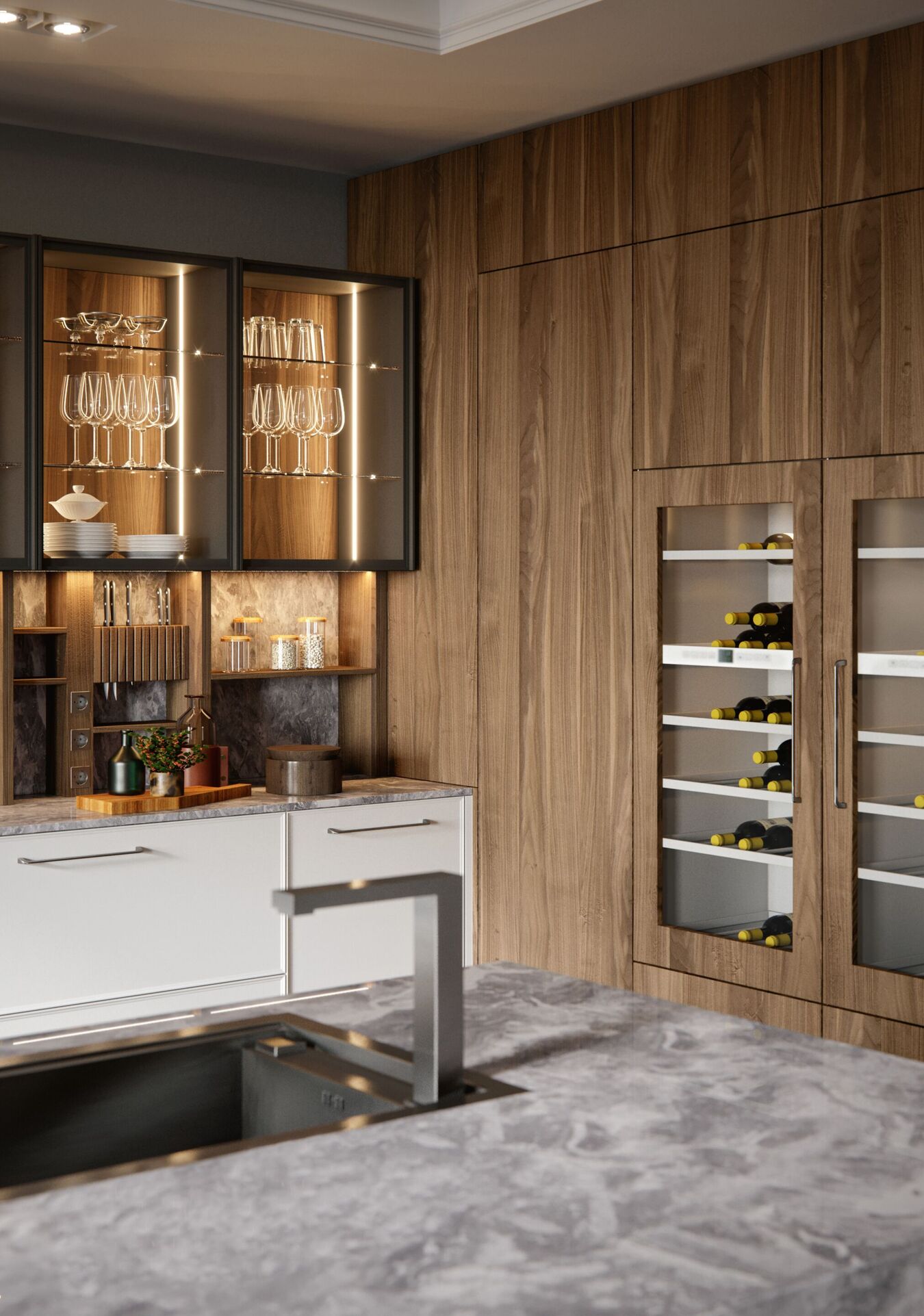 Поверхности и фасады: орех каналетто Solid Wood Noce Canaletto, матовый лак Grafite.