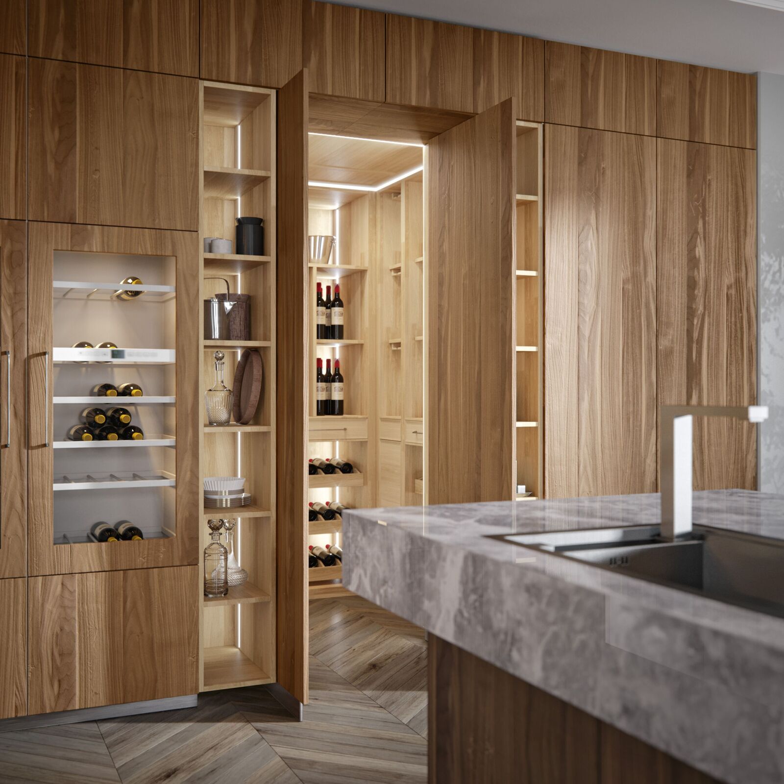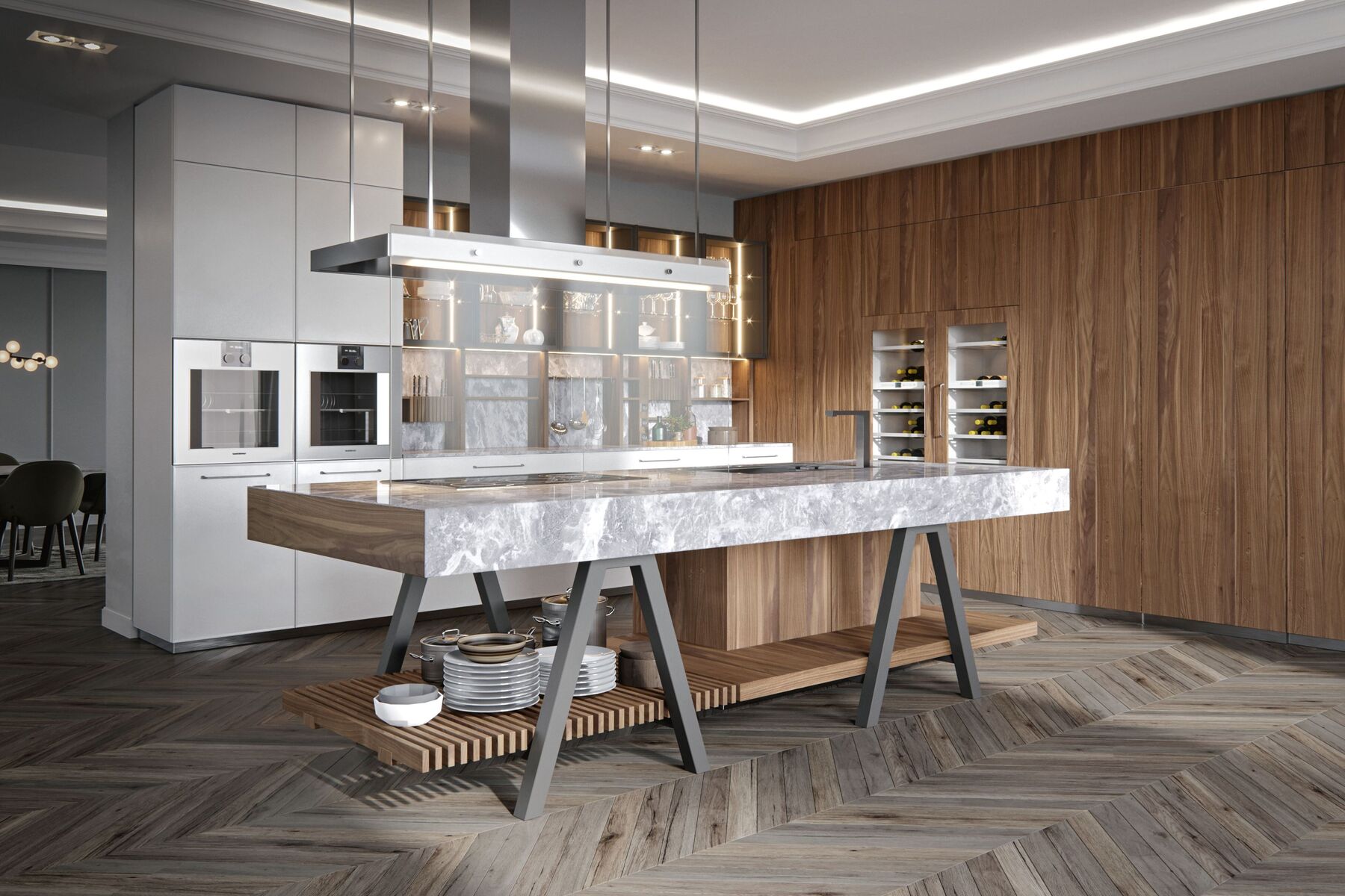 Поверхности и фасады: орех каналетто Natural Wood Noce Canaletto, матовый лак Piombo.