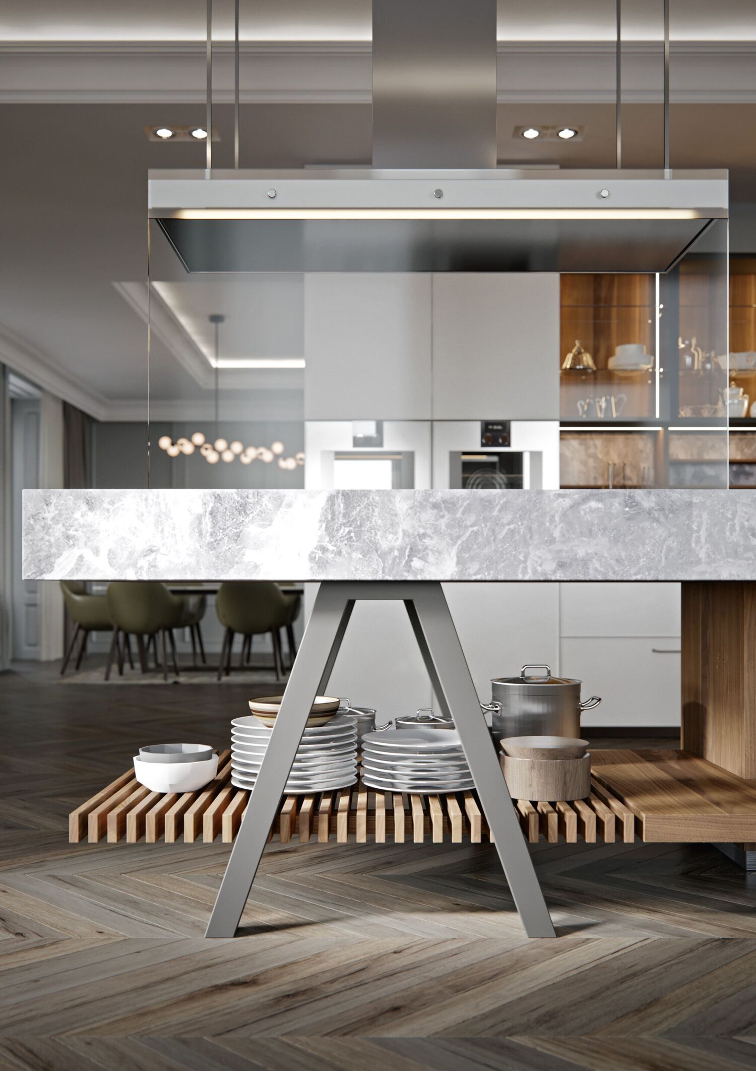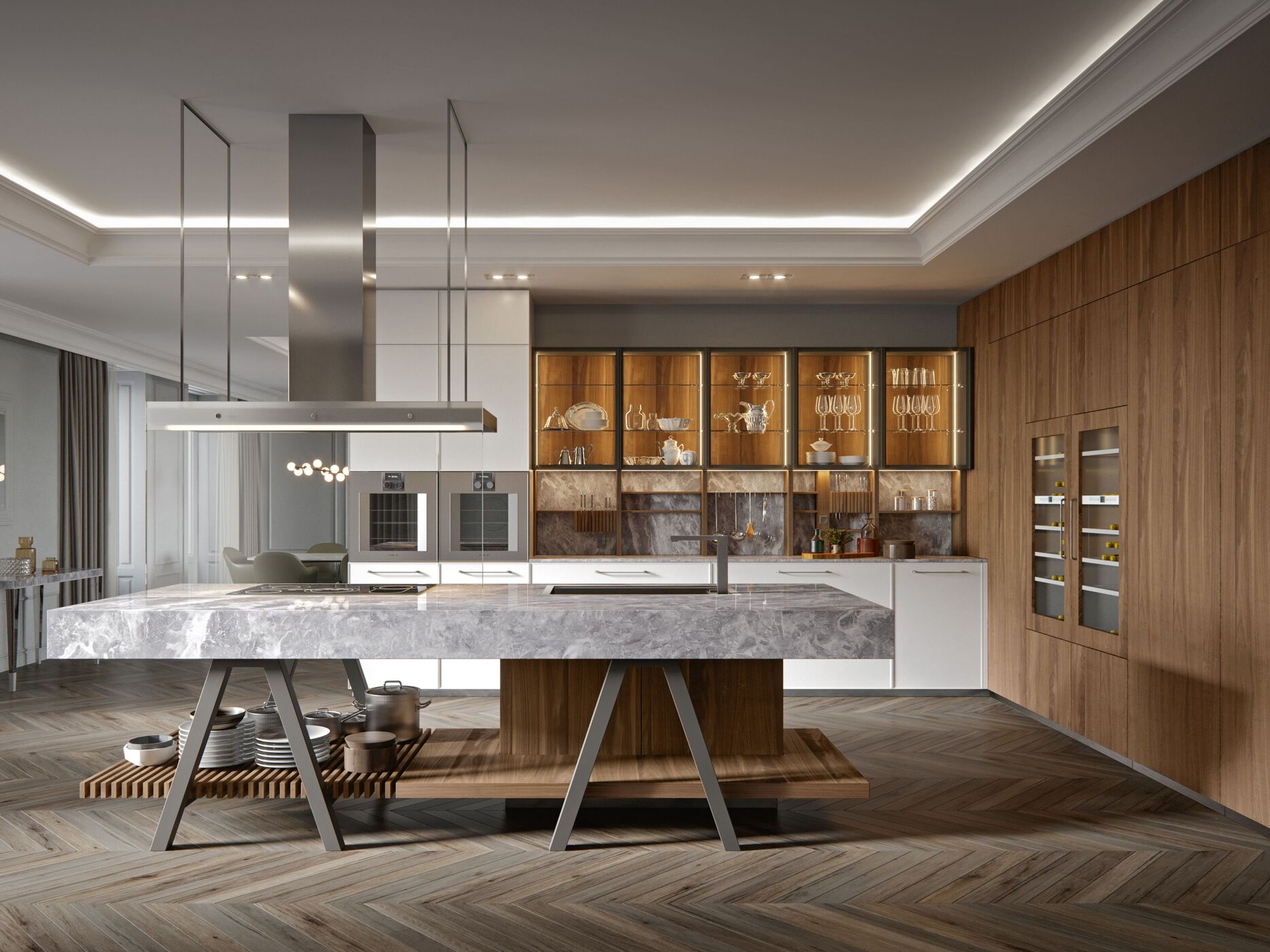 Поверхности и фасады: керамогранит Statuario Light, натуральное термоустойчивое дерево.