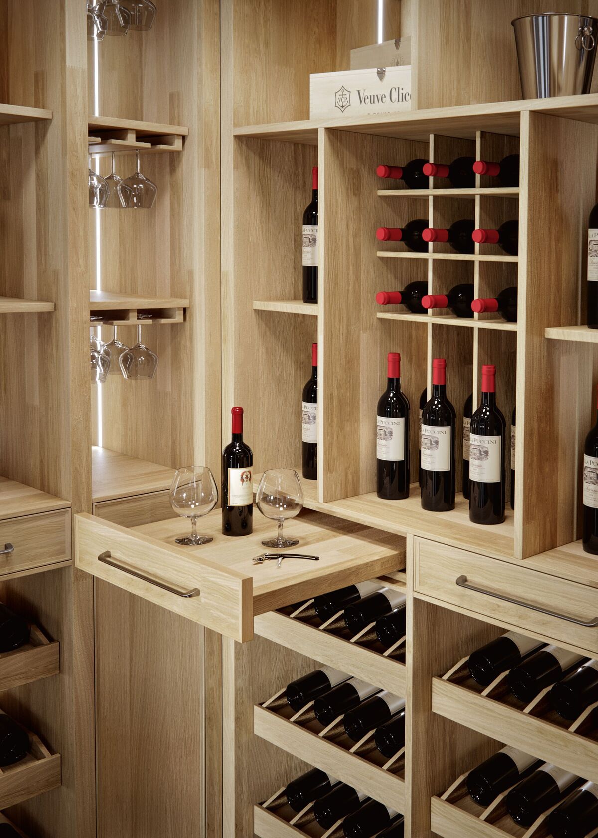 Поверхности и фасады: сучковатый дуб Natural Wood Rovere Nodato, винтажный дуб с гравировкой, матовый лак Grafite.
