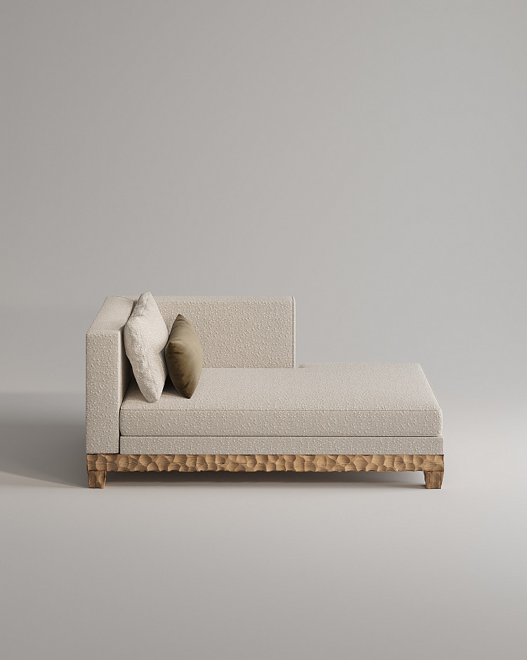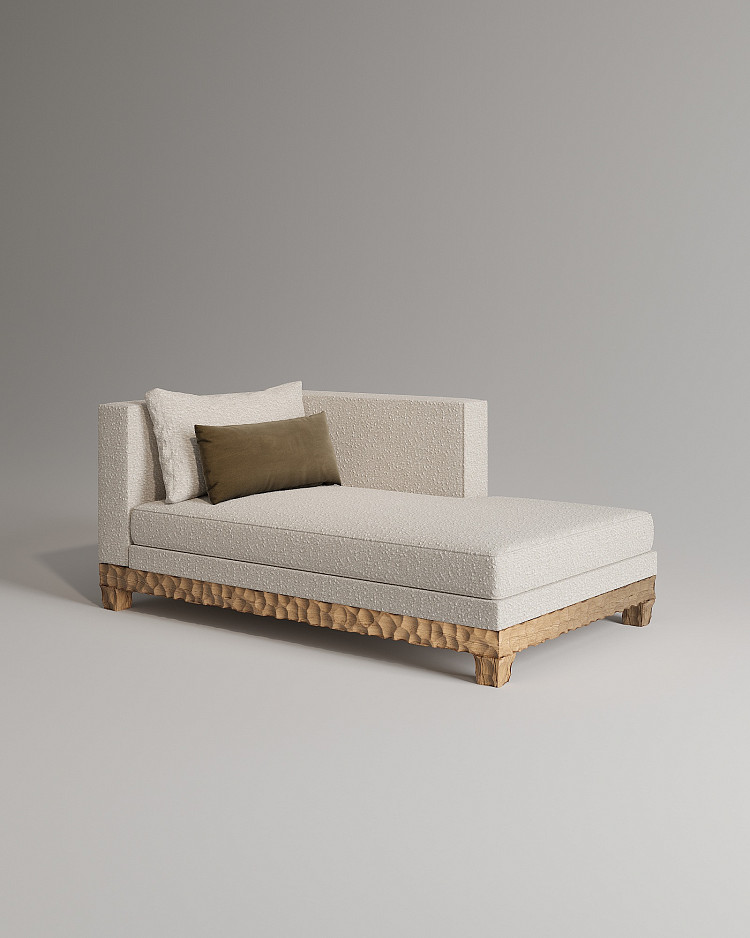 Кушетка Modénature Meribel Daybed — это прямоугольный мягкий объем на резном деревянном каркасе. Каркас состоит из цельного основания и четырех трапециевидных ножек с грубой фактурой. Мягкий объем обтянут тканью цвета топленого молока. Он включает сиденье, спинку и подлокотник, образующие защищенный угол. Композицию завершают две прямоугольные подушки.