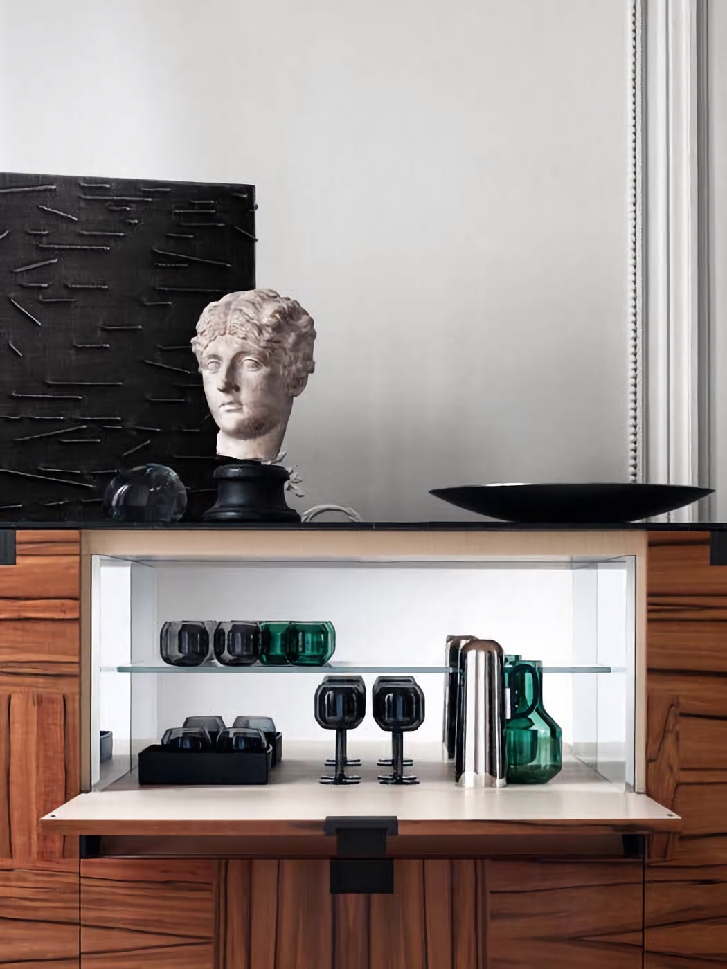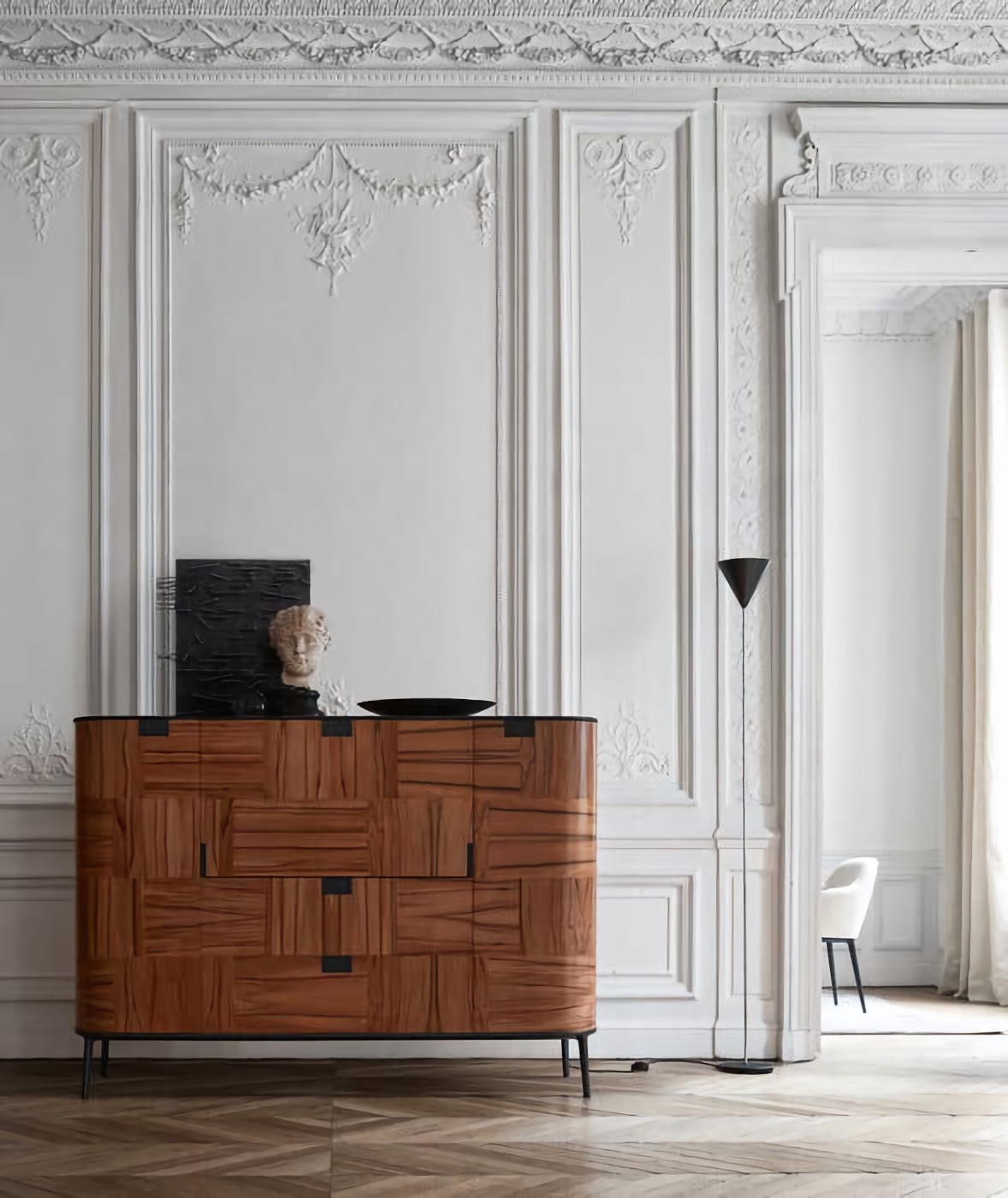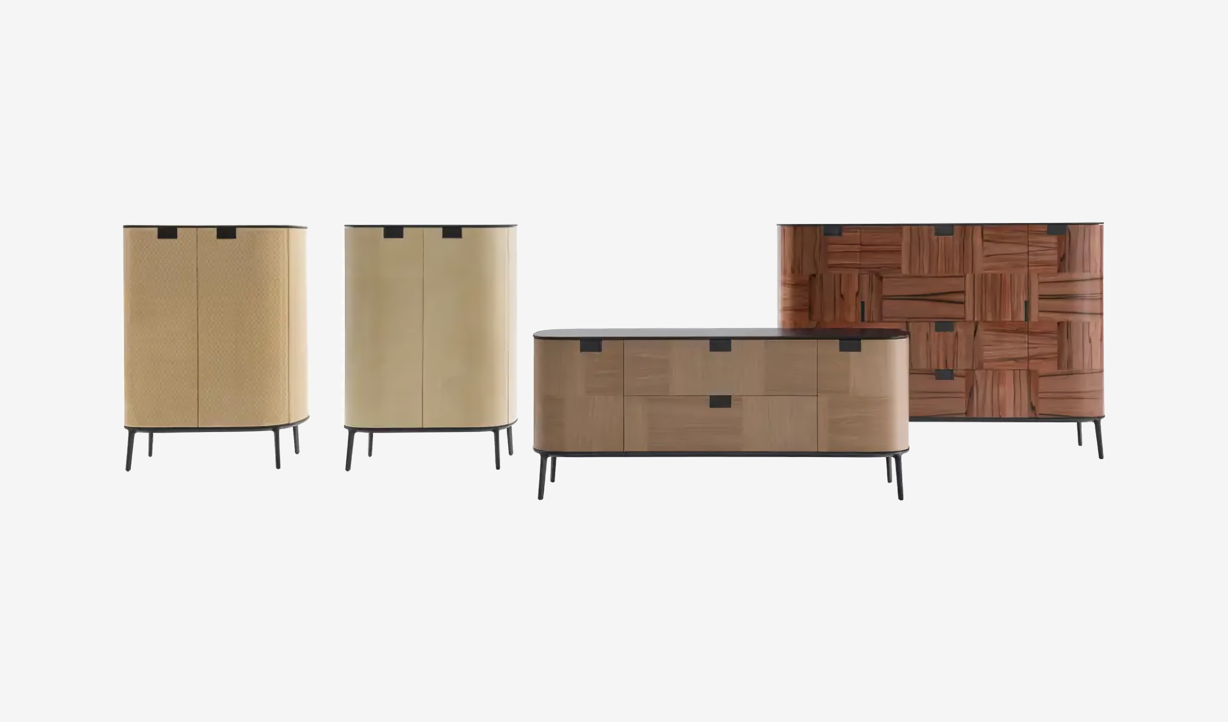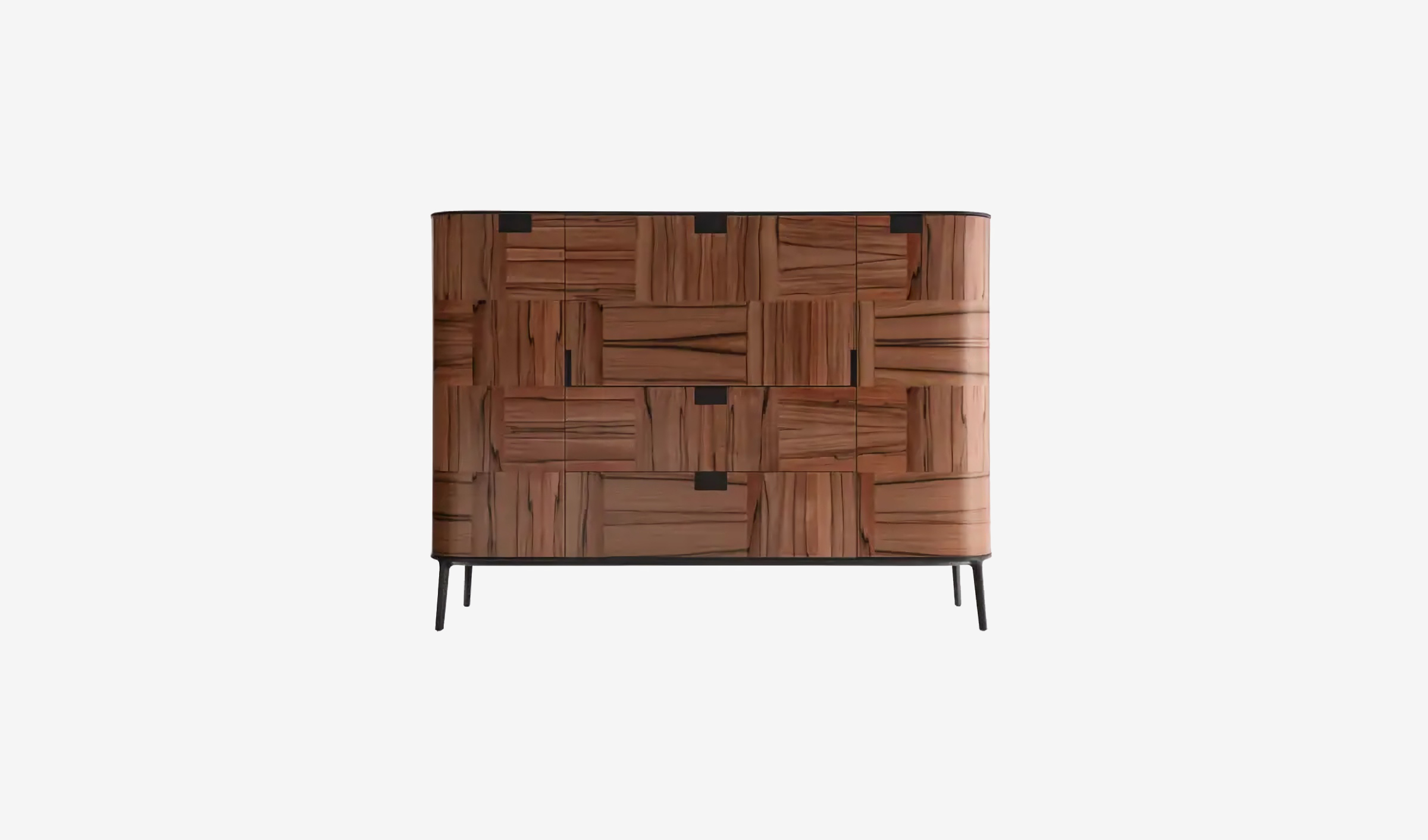 Буфет Maxalto Tesaurus — воплощение ремесленного мастерства и утончённого итальянского стиля. Округлые контуры корпуса смягчают характер модели Tesaurus. Фасад буфета имеет необычный шахматный принт, образуемый подобранными вручную деревянными плитками.