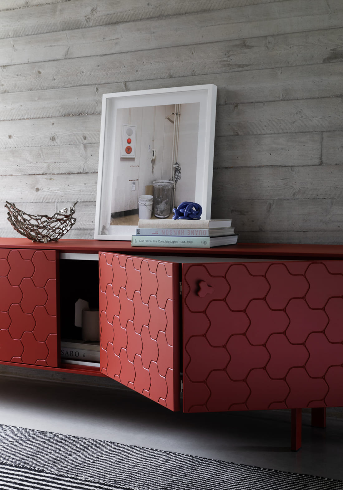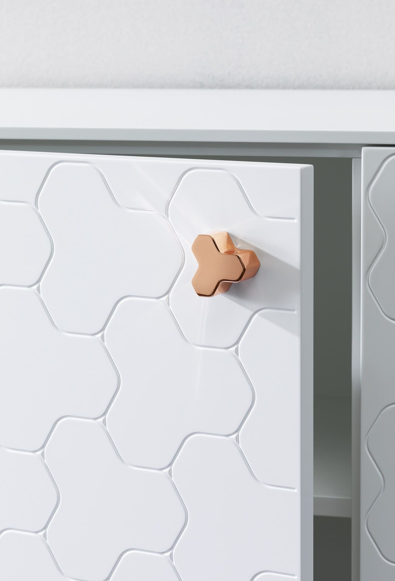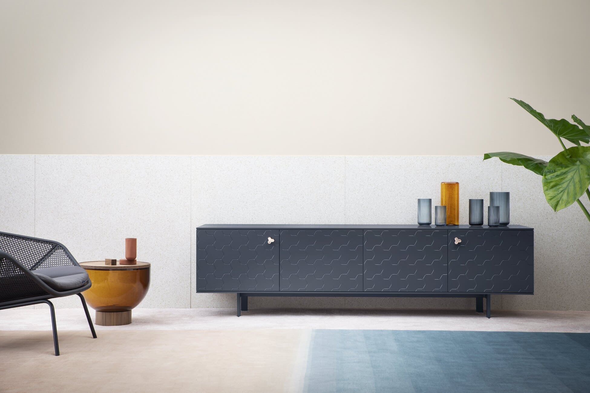 Комод Miniforms Soko — это современное дизайнерское решение, добавляющее помещению нотку индивидуальности. Главный акцент модели — выгравированный геометрический узор. Ручки предмета мебели повторяют форму орнамента, выделяясь ярким блеском металла.