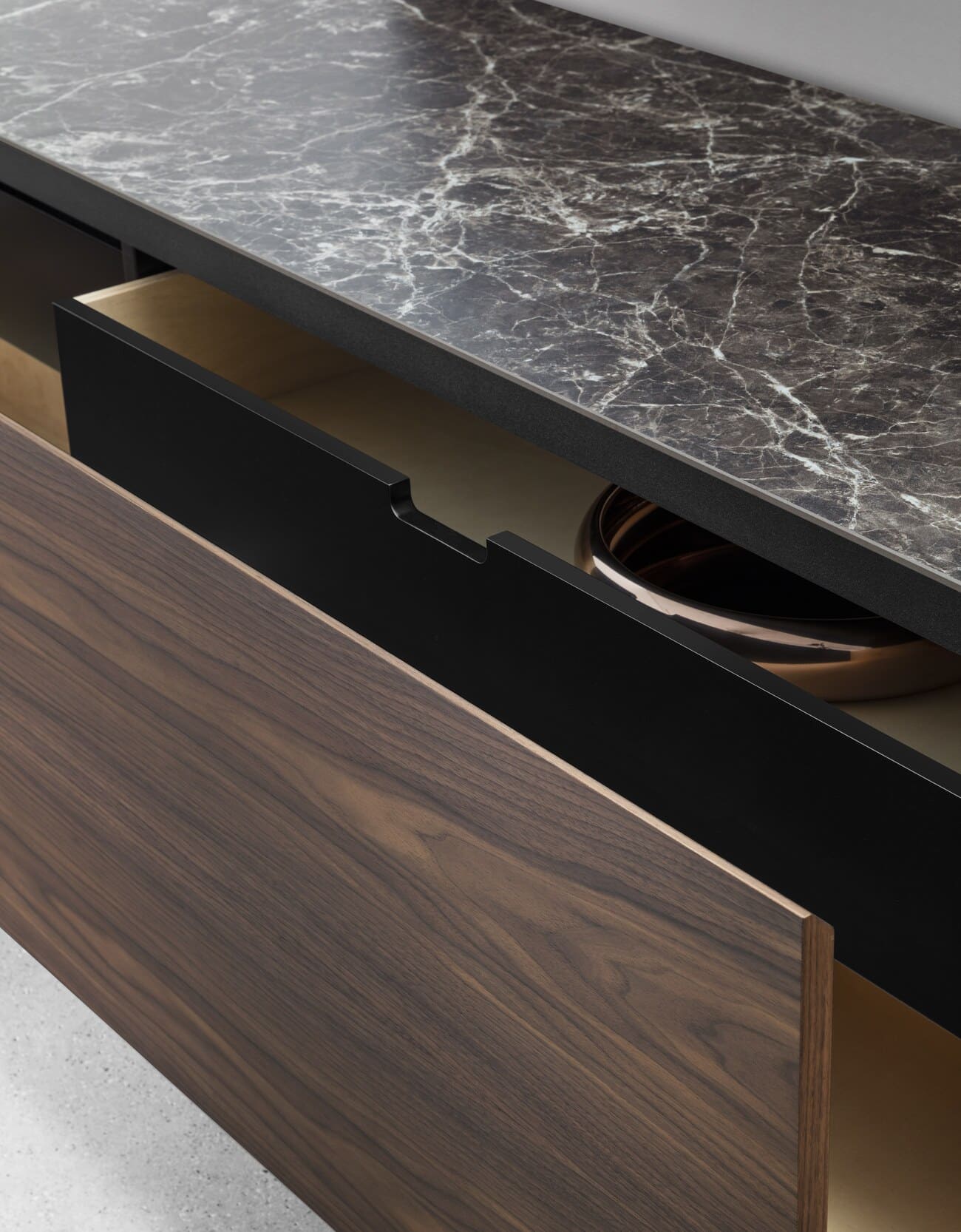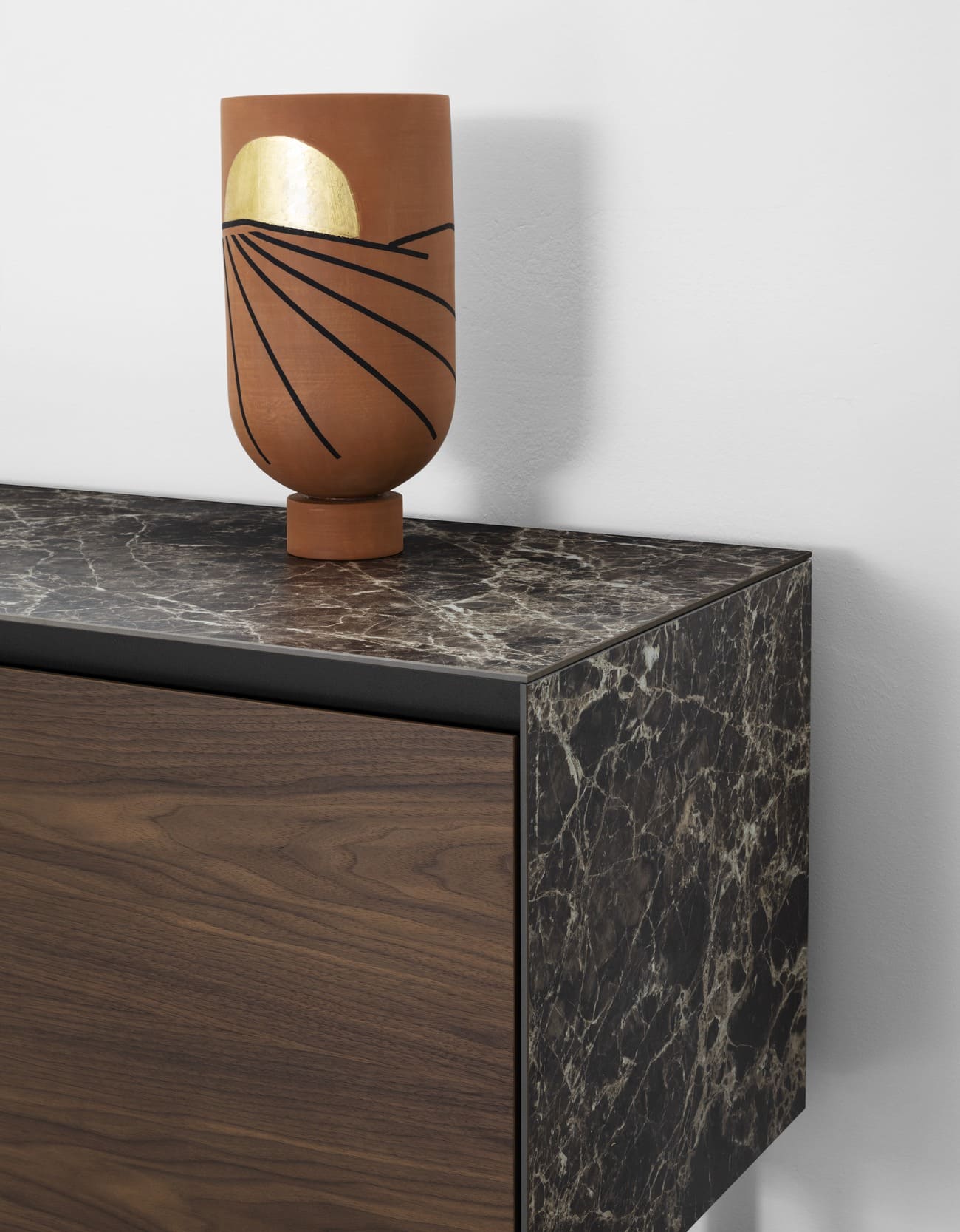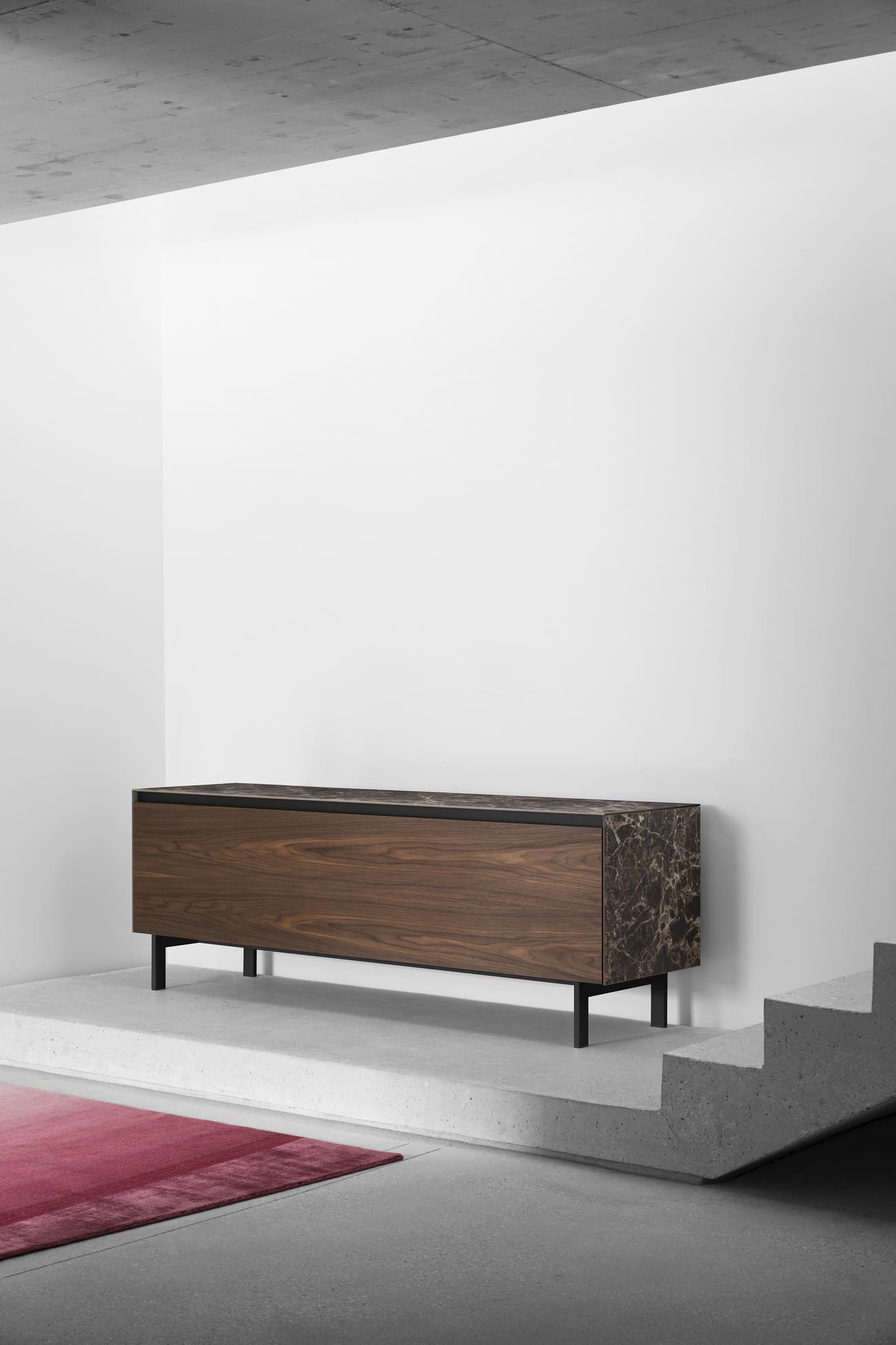 Комод Miniforms Vitrum — это сдержанная версия, способная дополнить интерьер любой гостиной комнаты. Удобная выдвижная дверца изготовлена из дерева нейтрального оттенка. Керамическая столешница делает модель более лаконичной и строгой.
