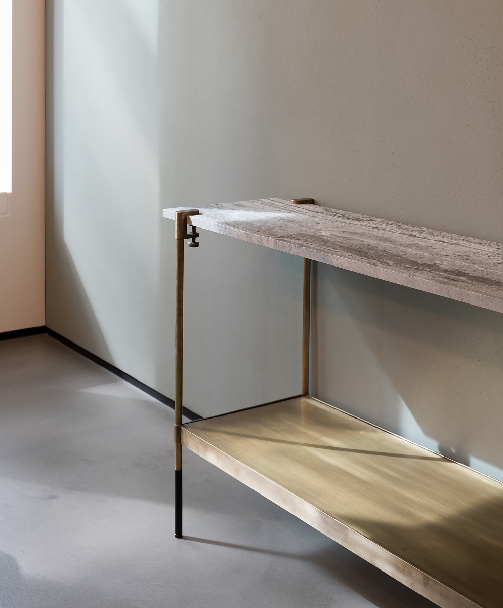 Ножки консоли могут быть выполнены из латуни или стали с порошковой покраской, столешница – из мрамора чёрного или белого цвета.