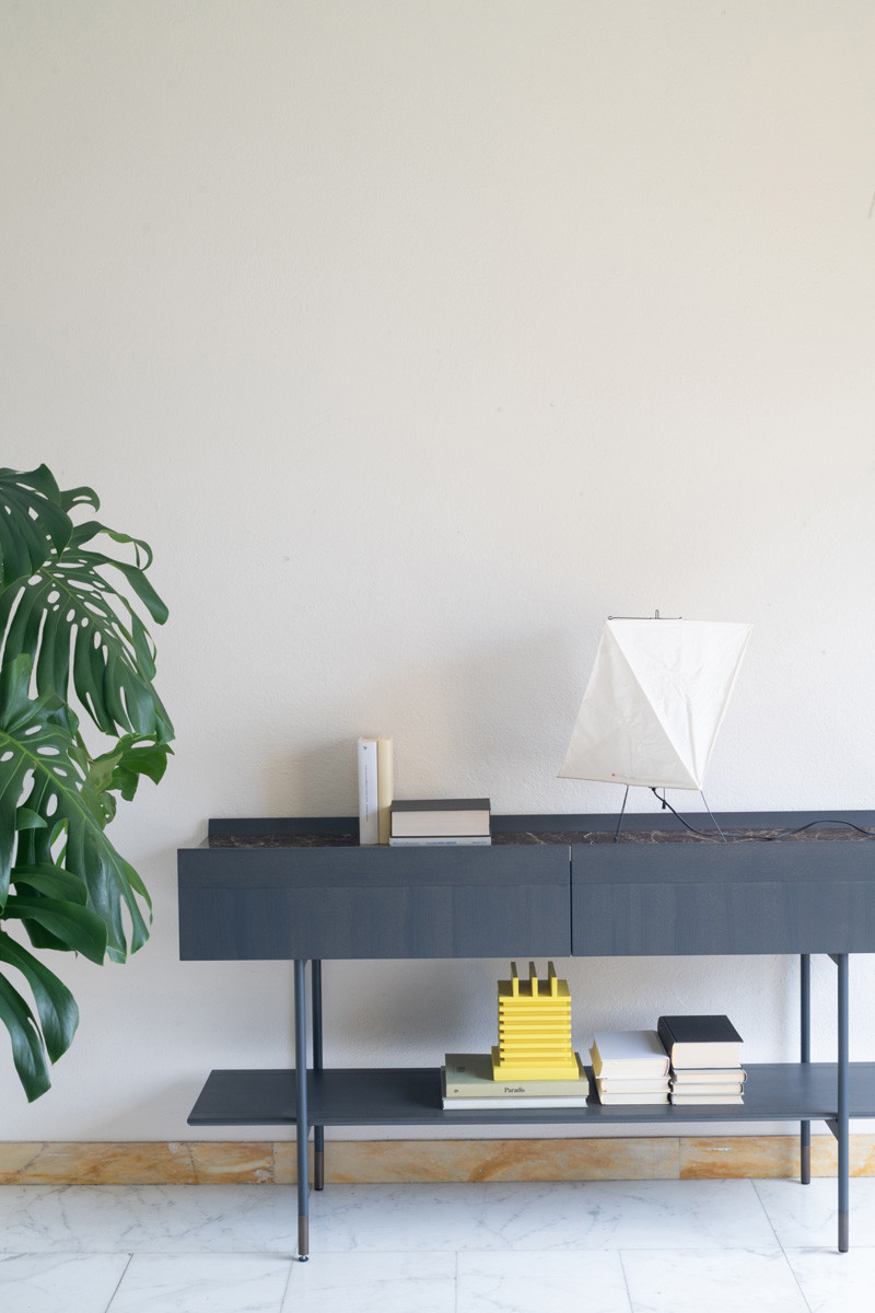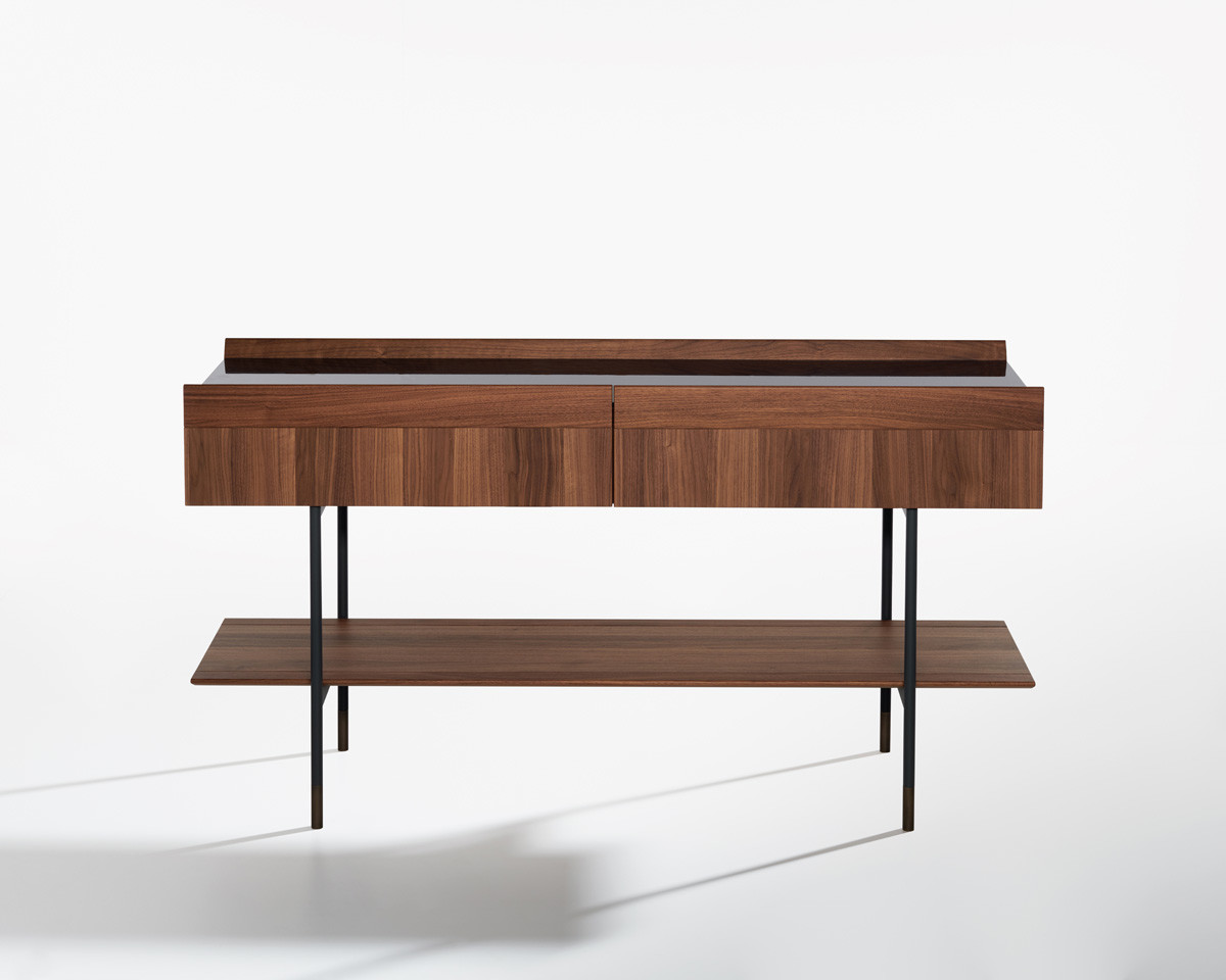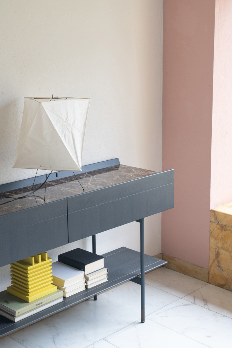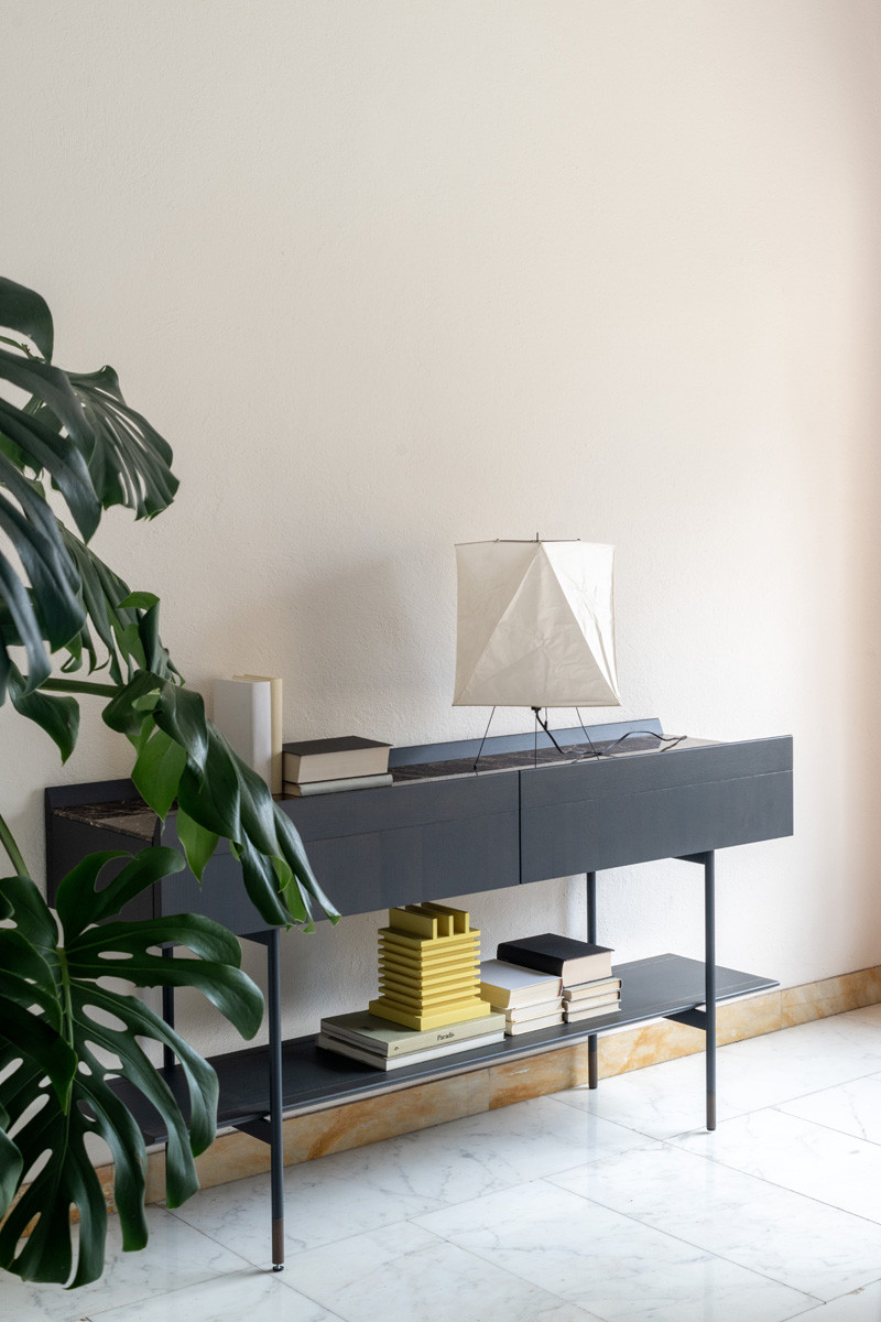 Консоль Potocco Arial от Gabriele e Oscar Buratti — модель с прямоугольной столешницей и двумя выдвижными ящиками. Столешница из мрамора, стекла или массива дерева. Металлические ножки образуют легкую опорную конструкцию.
