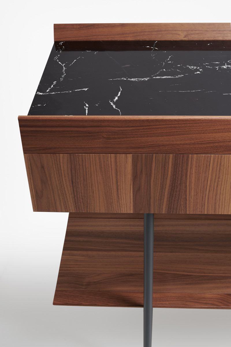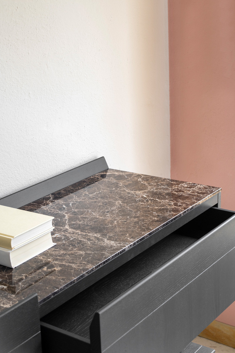 Каркас: металл с тиснением (бронзированная латунь или антрацит). Столешница: мрамор, тонированное стекло, массив ясеня или ореха Canaletto. Корпус: массив ясеня или ореха Canaletto.