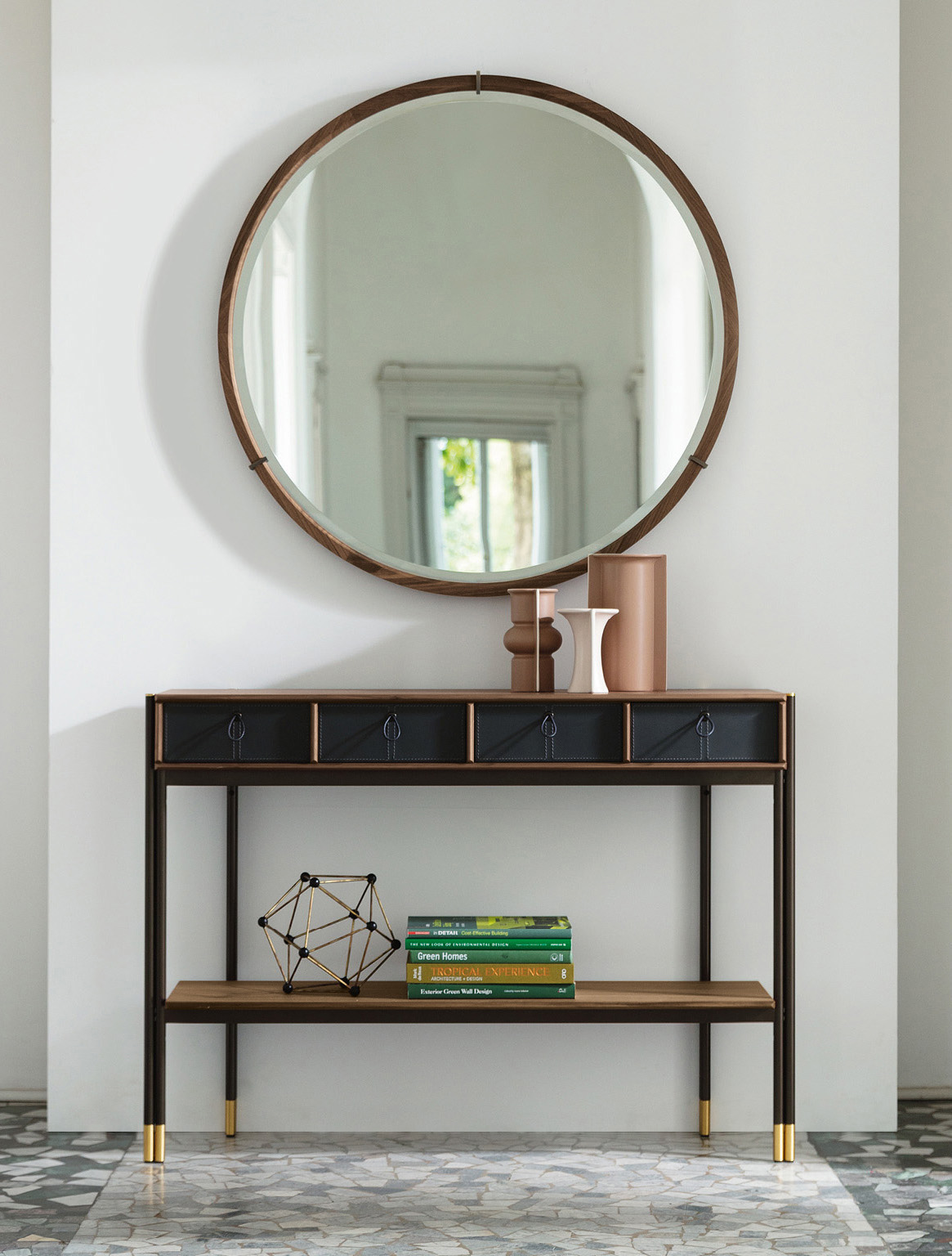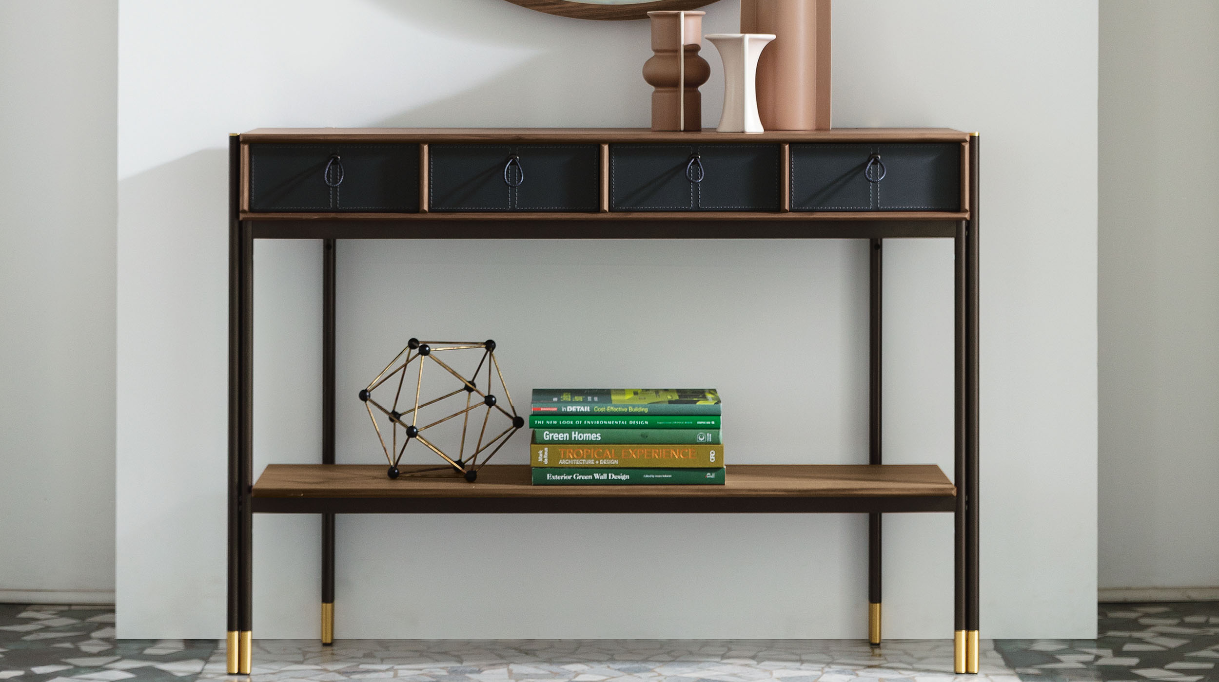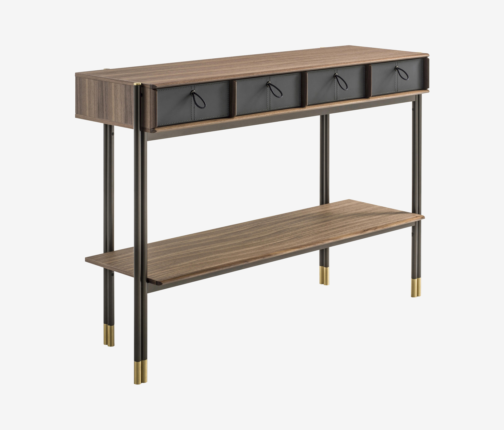 Консоль Porada Bayus 8 — это результат умелого сочетания дерева и натуральной кожи. Золотые латунные ножки придают изделию элегантный изысканный характер. Для максимальной функциональности консоль дополнена четырьмя выдвижными ящиками.
