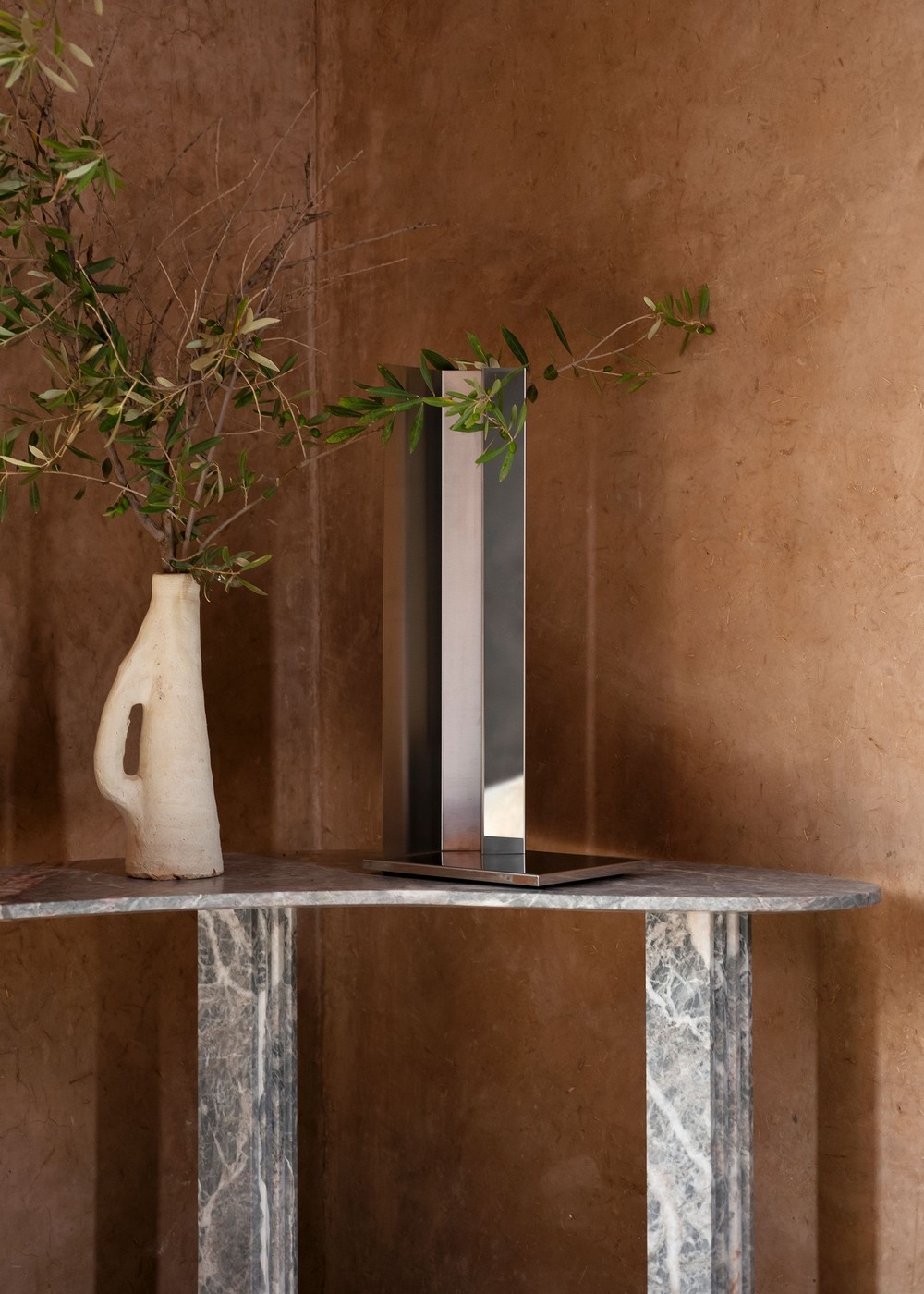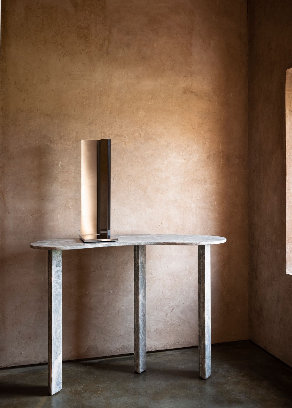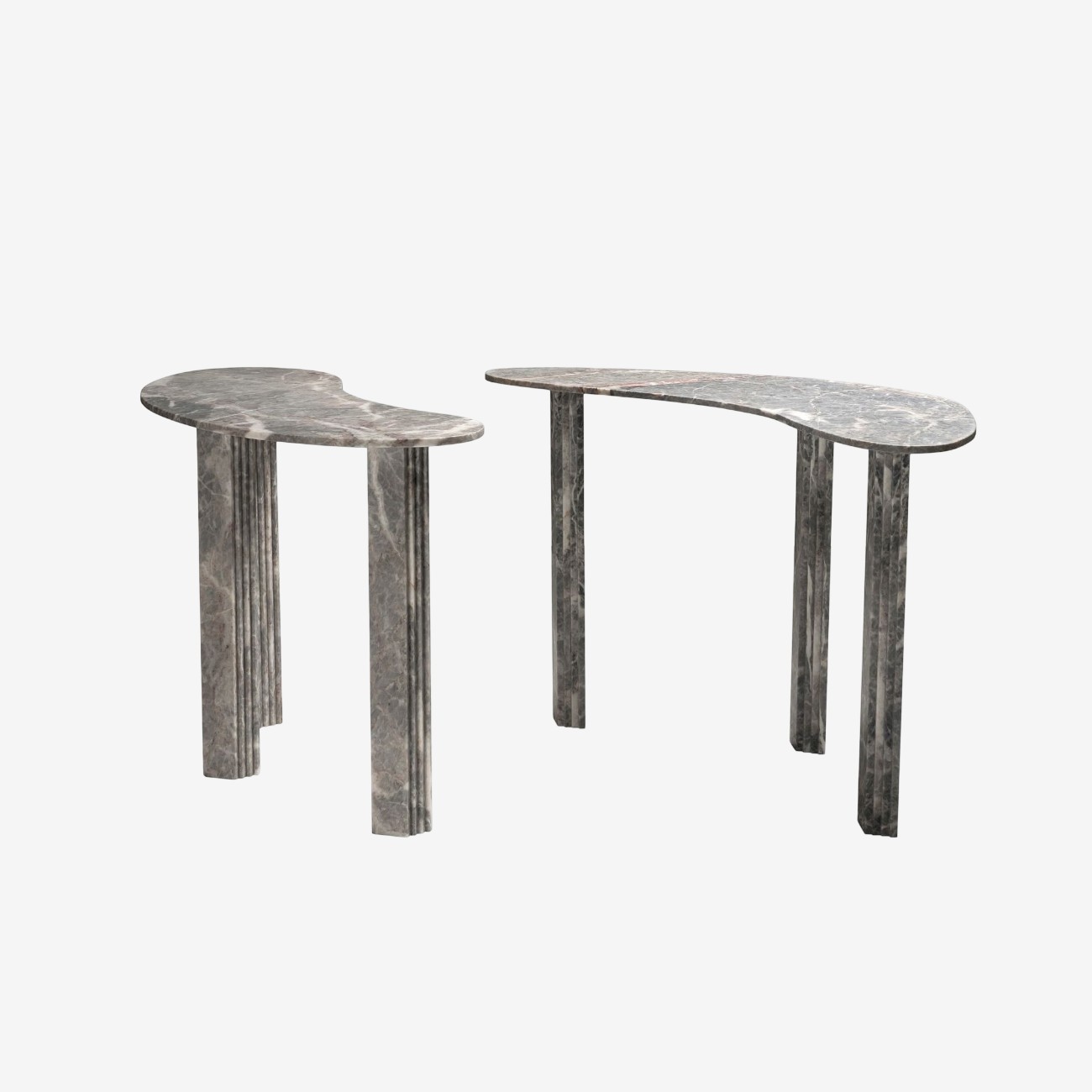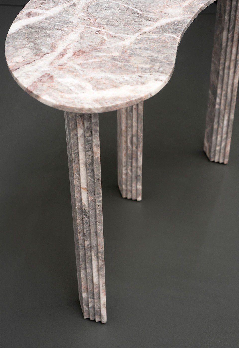 Консоль Tacchini Colombo & 1953 от Lorenzo Bini — асимметричная столешница неправильной органической формы. Ножки прямоугольного сечения расположены симметрично, создавая контраст с текучими линиями верха. Все элементы выполнены из цельного мрамора.