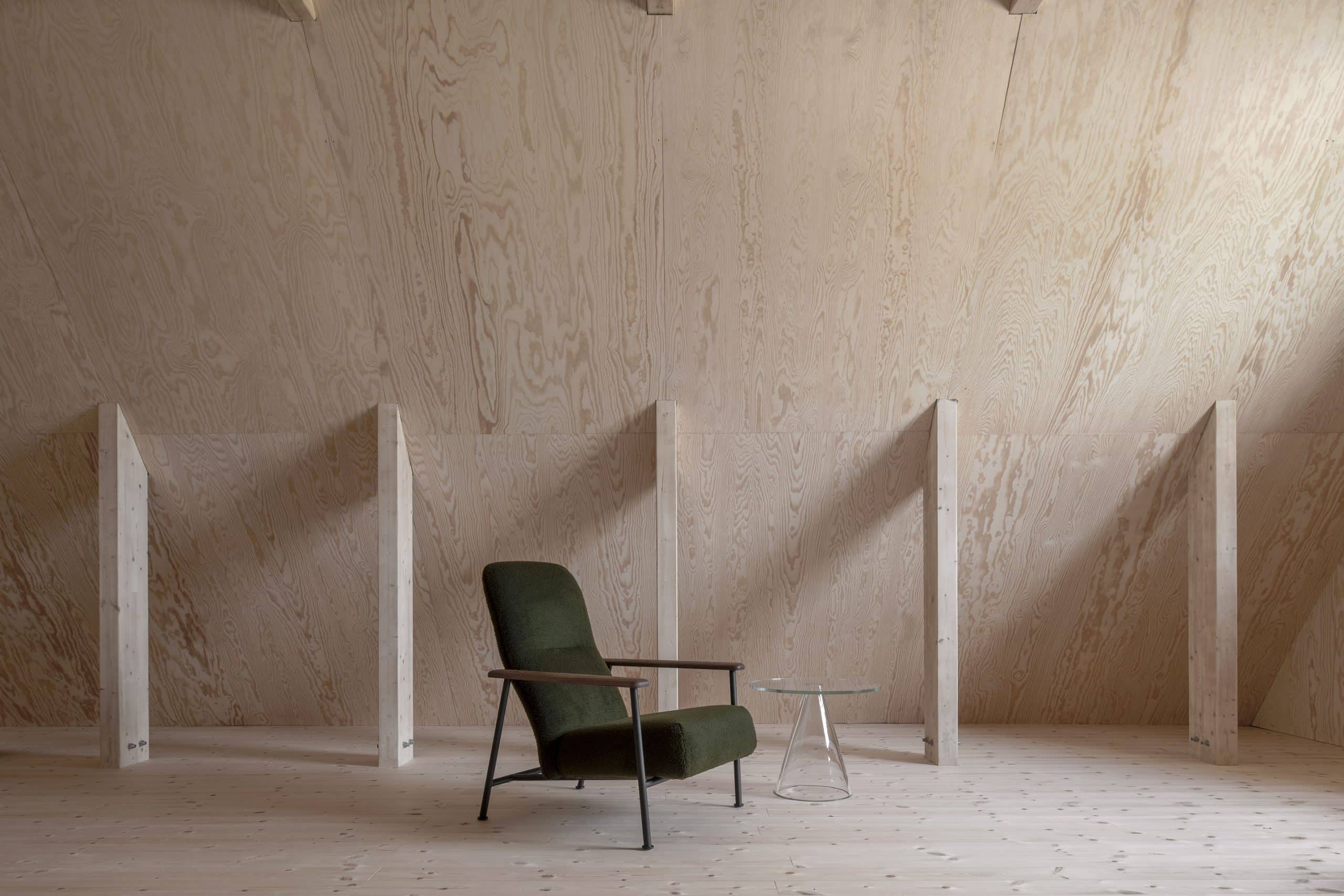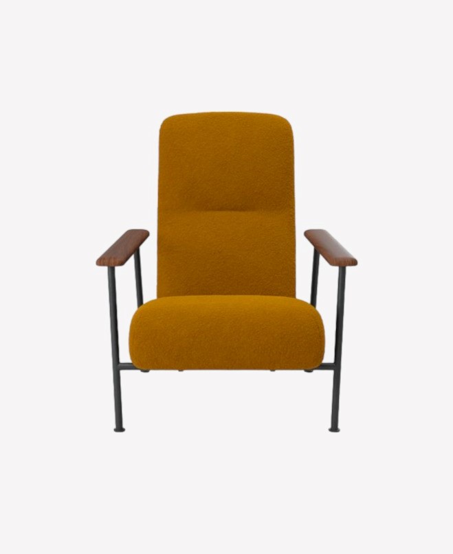 Кресло Jump Easy Chair со съемной обивкой, подлокотником из массива дерева и двигающимся сиденьем на стальной раме.