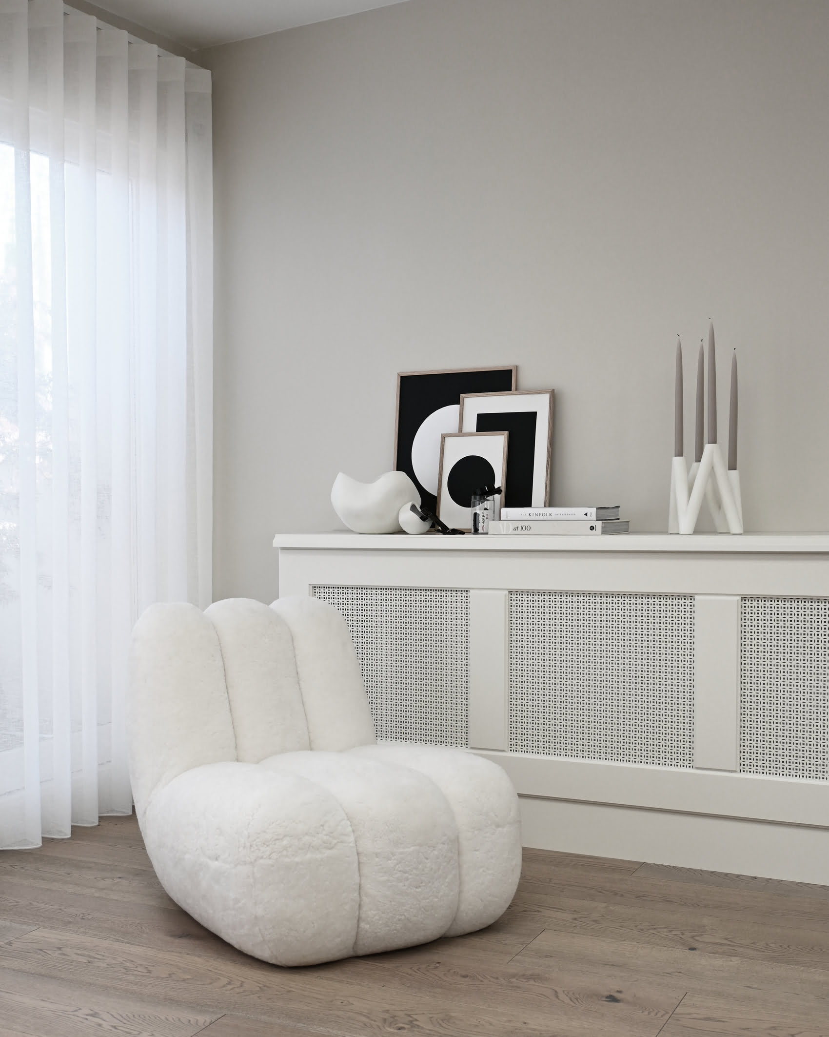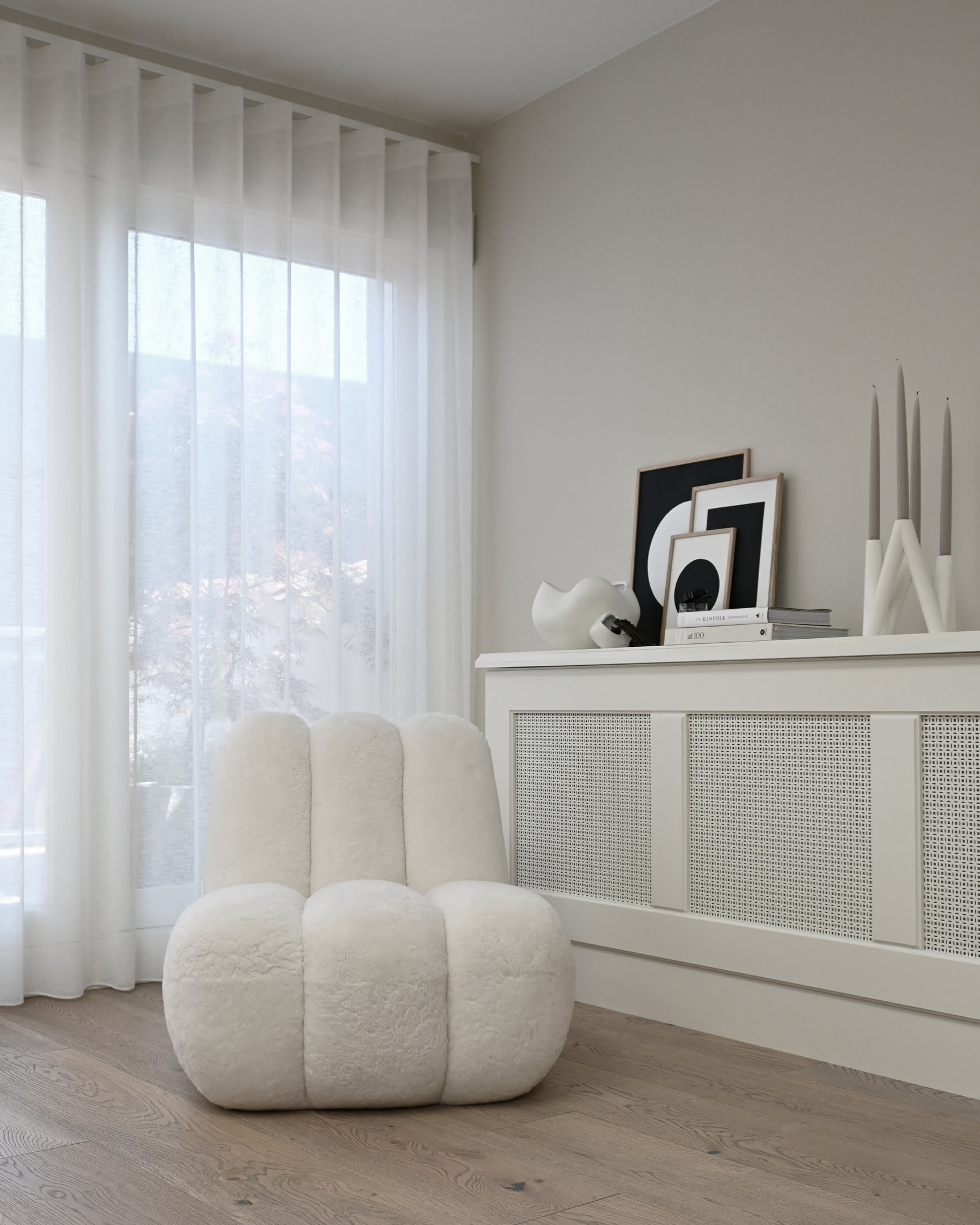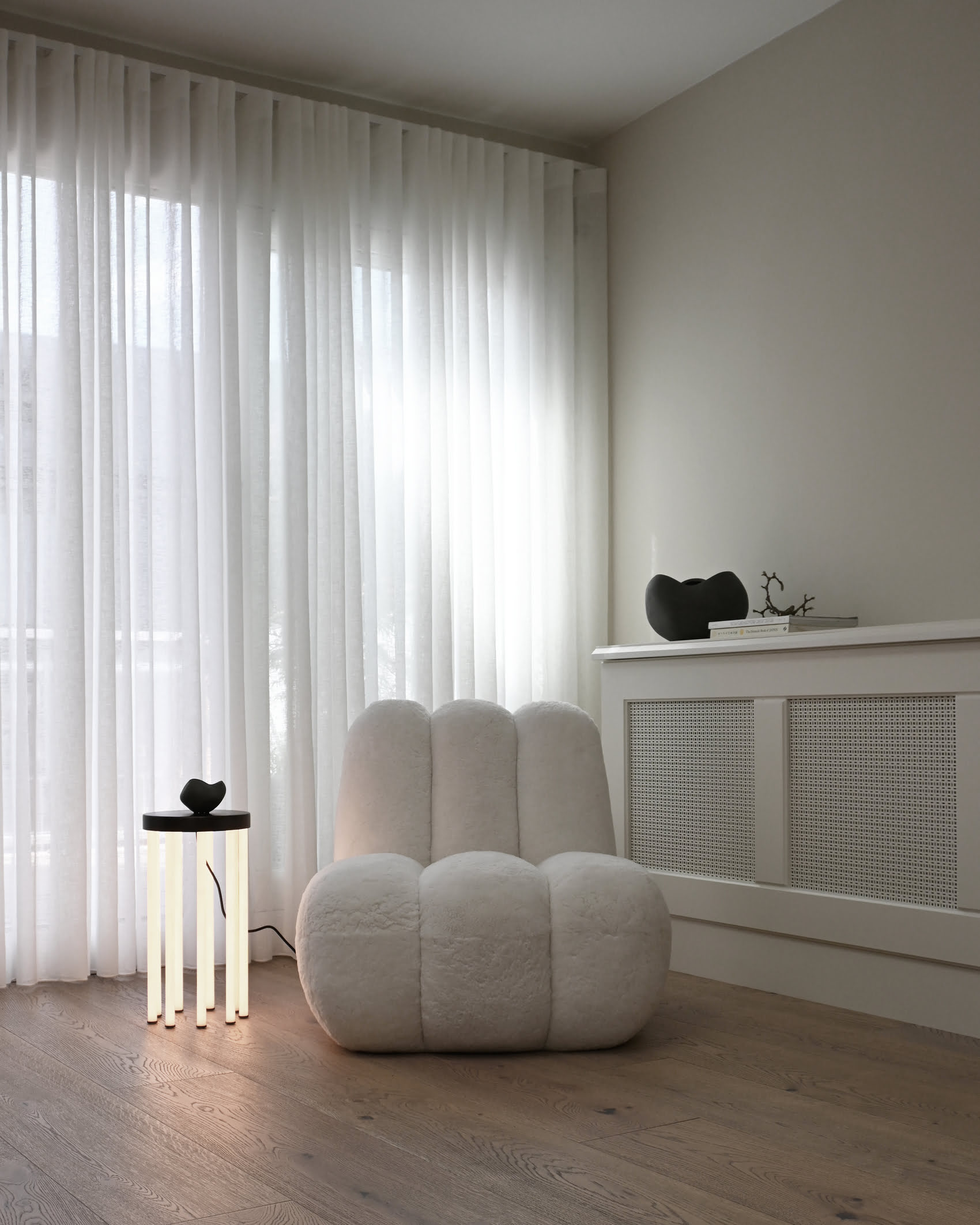 Кресло Toe Chair изготовлено из следующих тканей: букле, овчина, лён, Sunproof Pallazo.